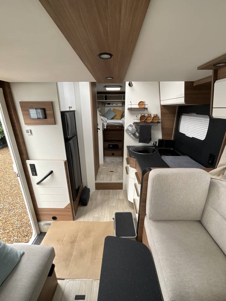 The layout is spacious with two captains chairs in the front that swivel round and bench seats either side with a dinning table in the dinette area, that moves up and down and side to side to create the leisure space you require. Above the dinette area is an electric drop down double bed. In the mid section you will find the kitchen which has the standard European facilities, Sink with running hot and cold water, 3 ring burner Hob, full length fridge/freezer and plenty of storage.