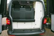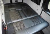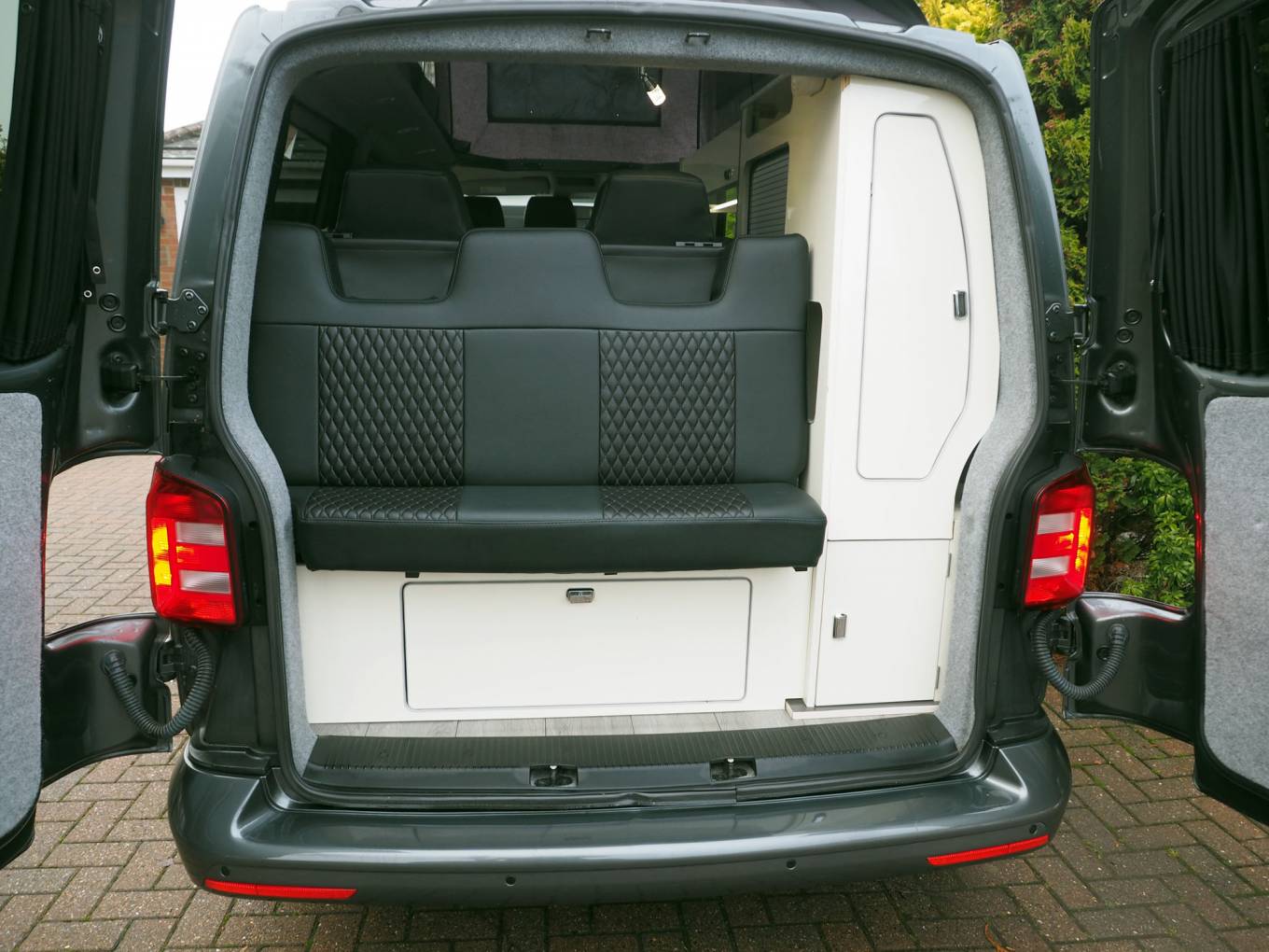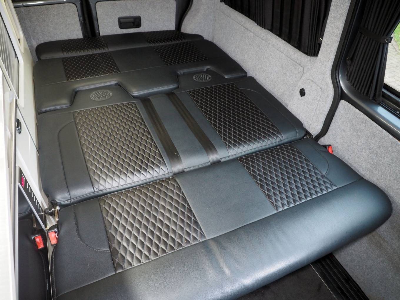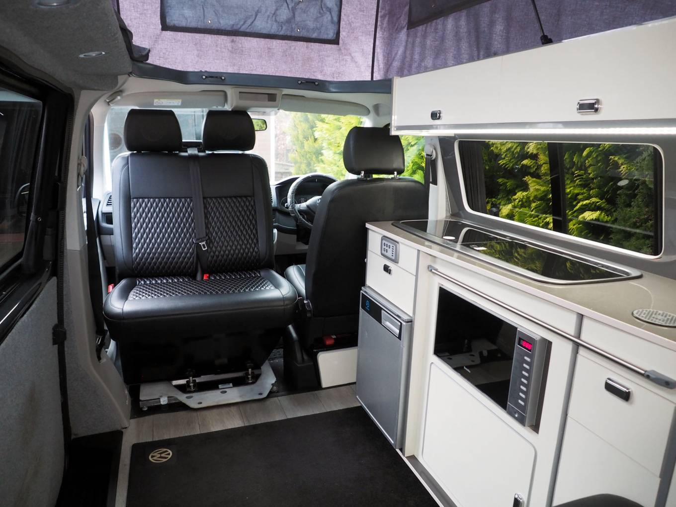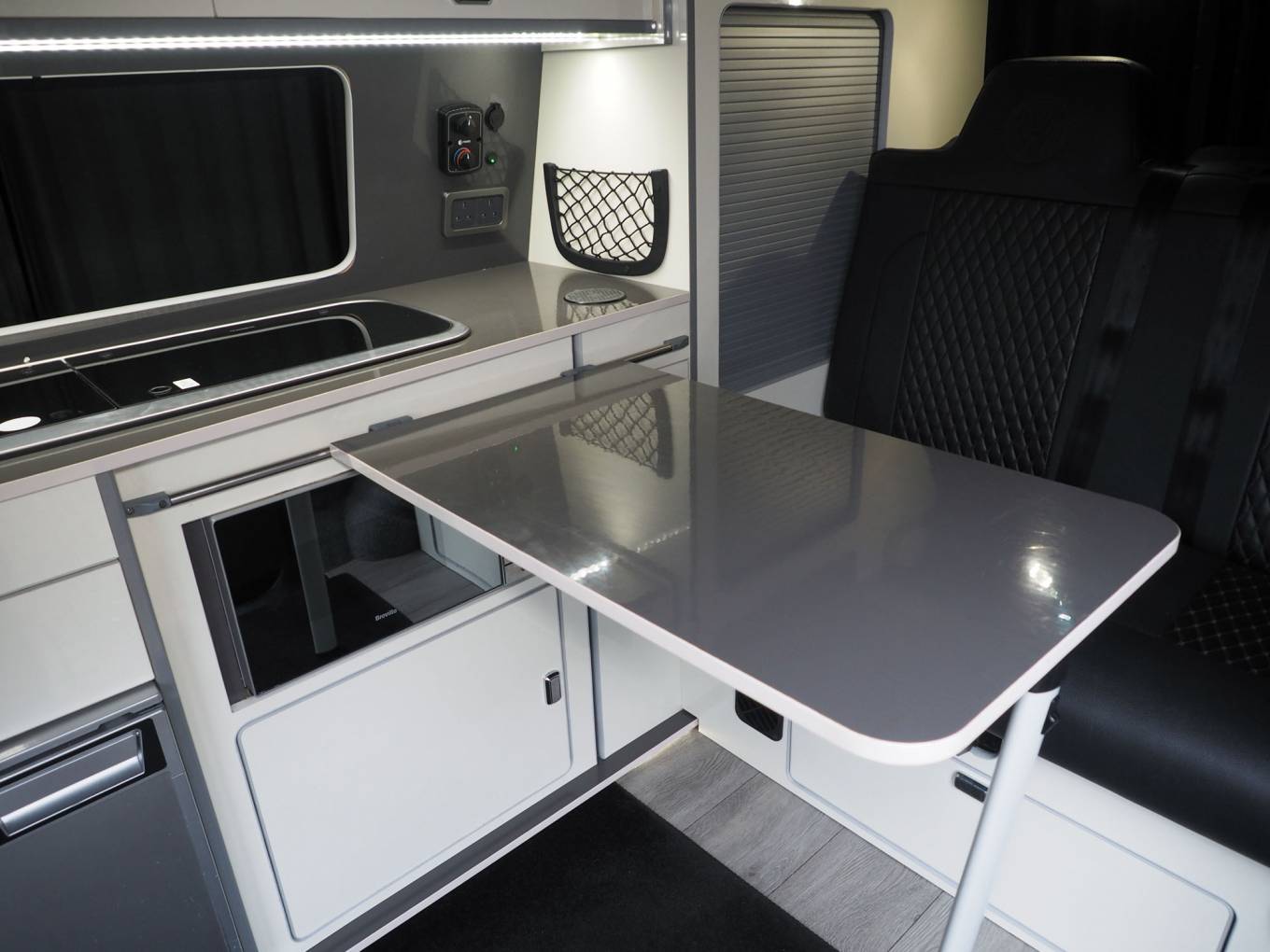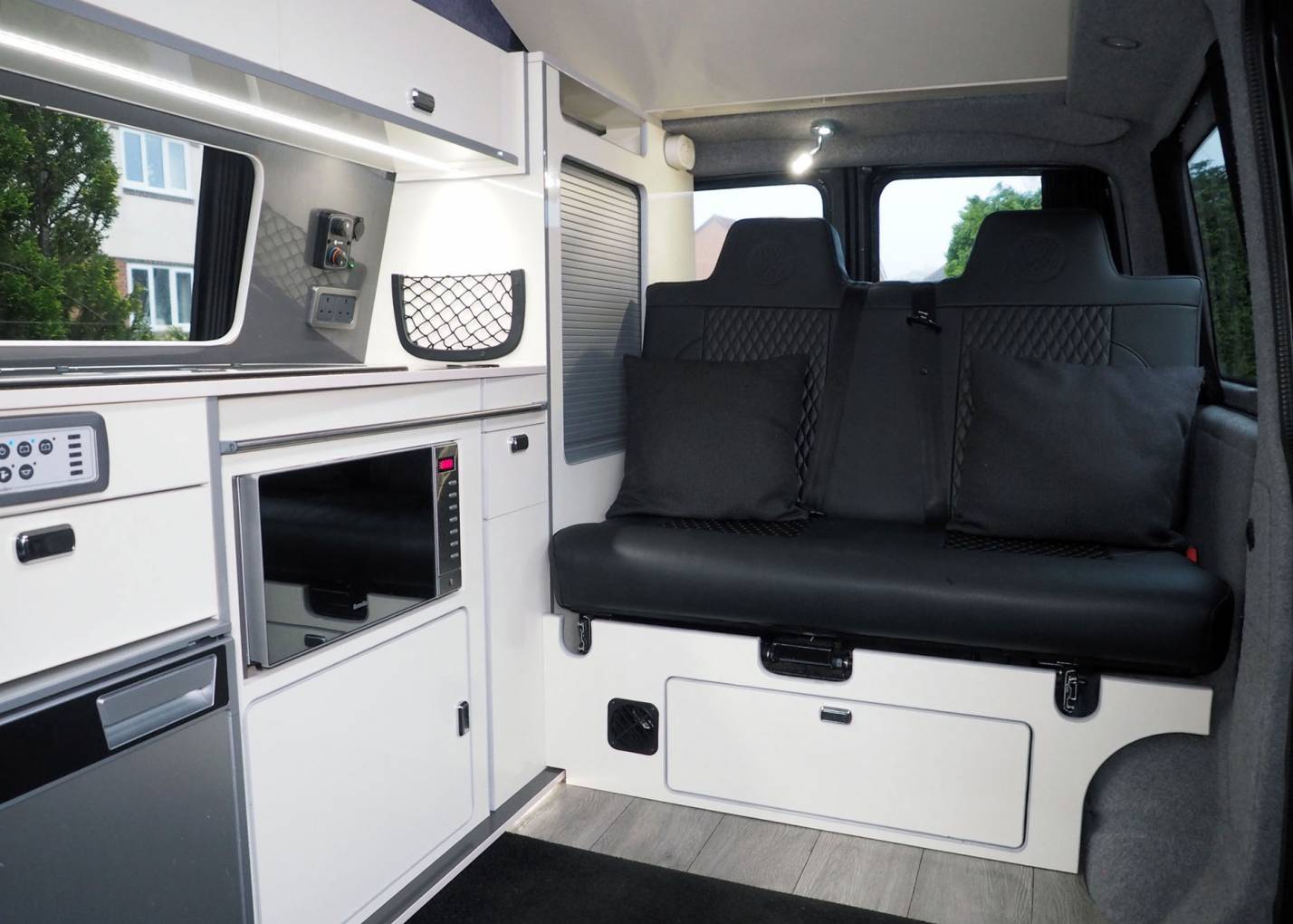 To the front is a Kiravans double swivel passenger seat with storage box, additional storage is available in the kitchen and at the rear. Upholstery is trimmed in black leather with diamond stiching, complimented by light cream gloss cabinets and grey timber style flooring. Cab features include cab air conditioning, reversing sensors, VW head unit for with DAB radio and input, Curtains are fitted to all habitation windows
