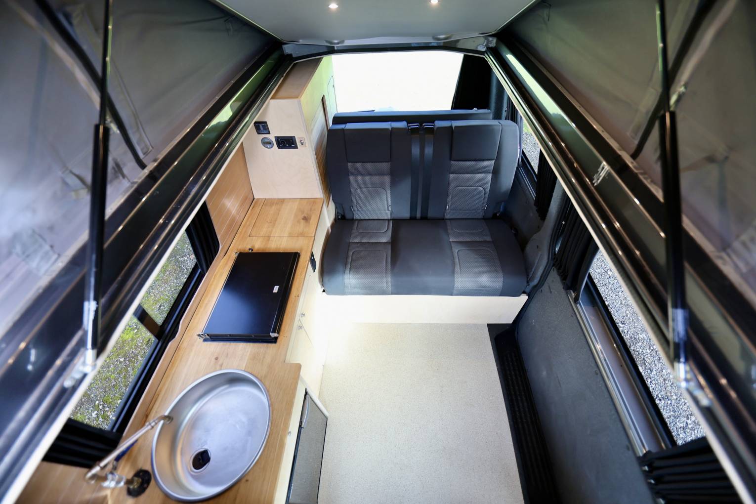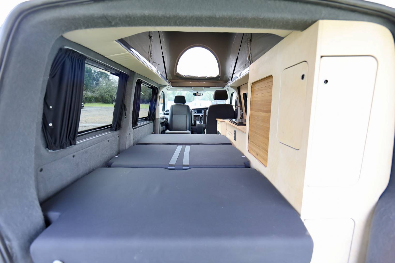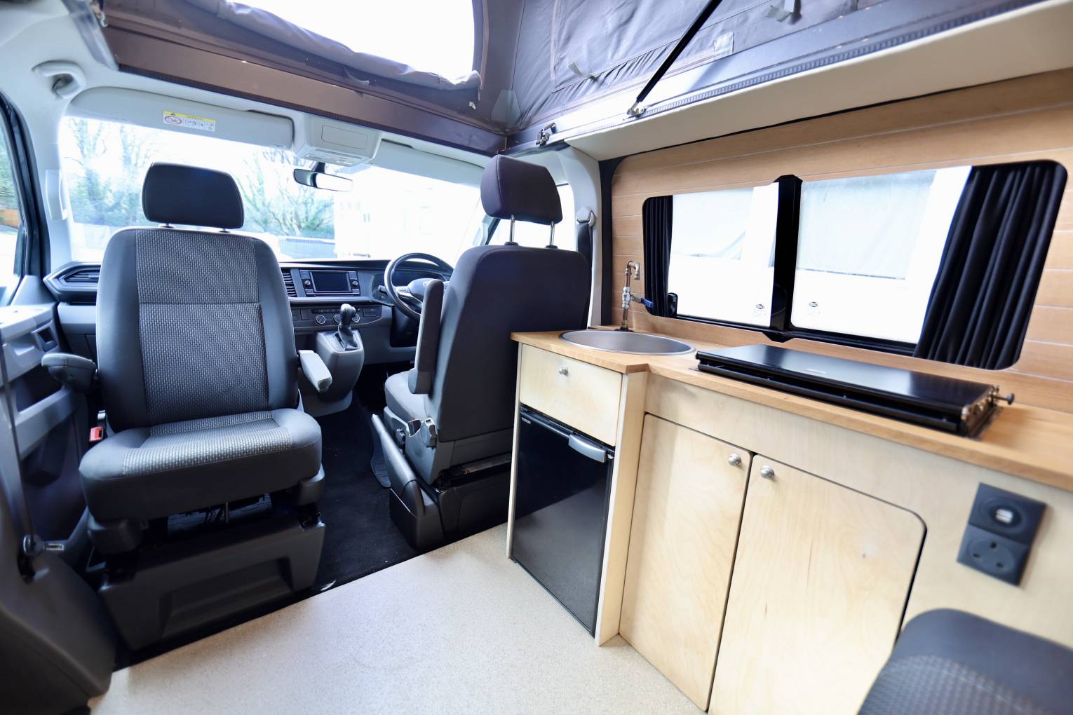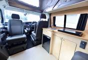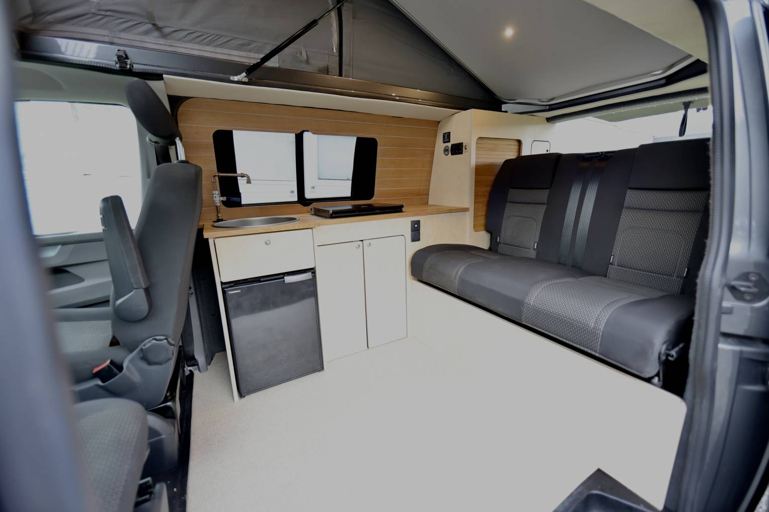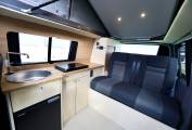 The camper also has a lithium leisure battery, which will charge faster, the battery will hold it's charge for longer and it's lighter in the vehicle. The rock & roll seat turn into a 112cm wide bed made by Scodema Rib Seats, and the Pop Up Roof is by SCA roof 194 Pop Roof with LED light in the base lighting up the habitation area. The camper is located at Passfield Hampshire.