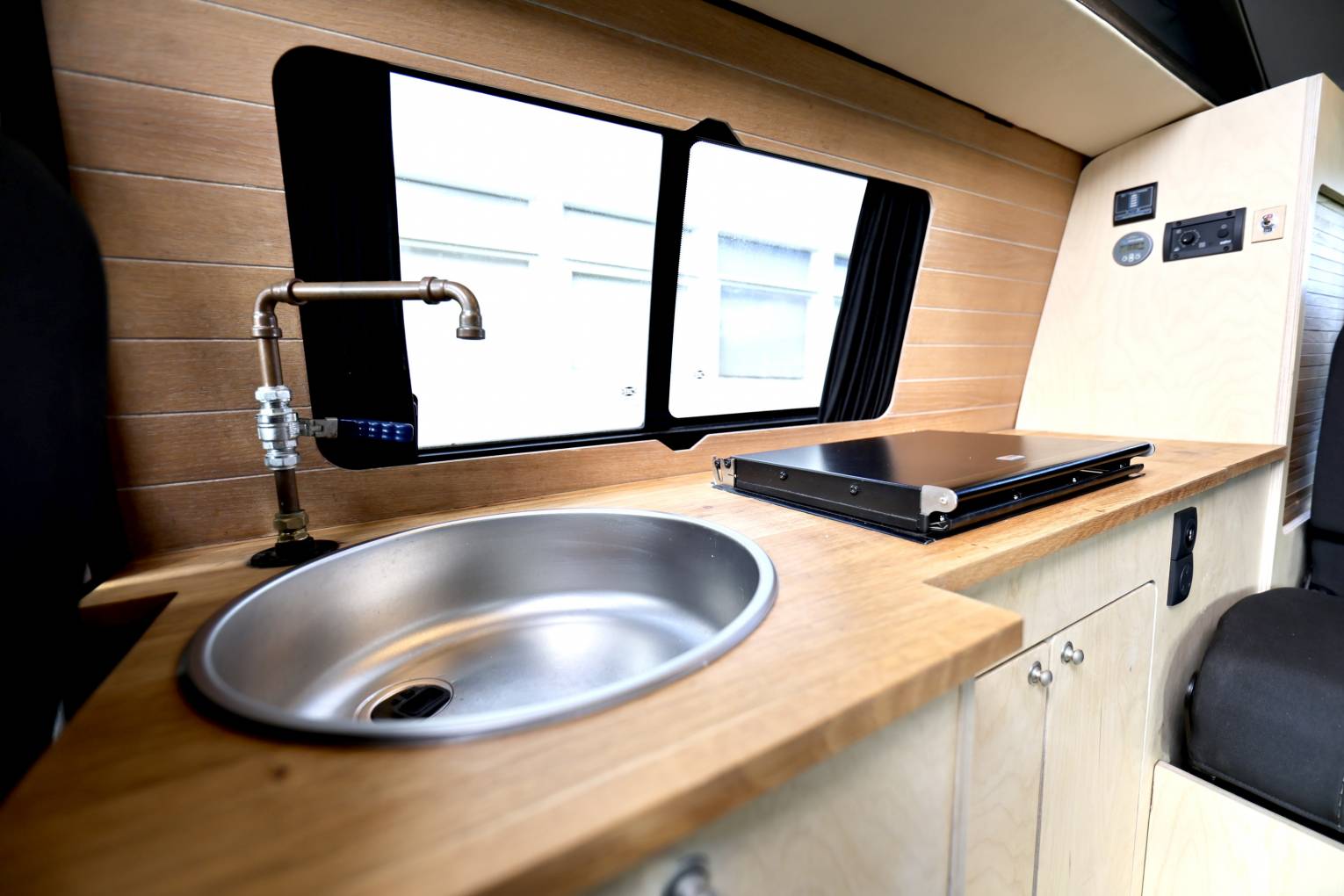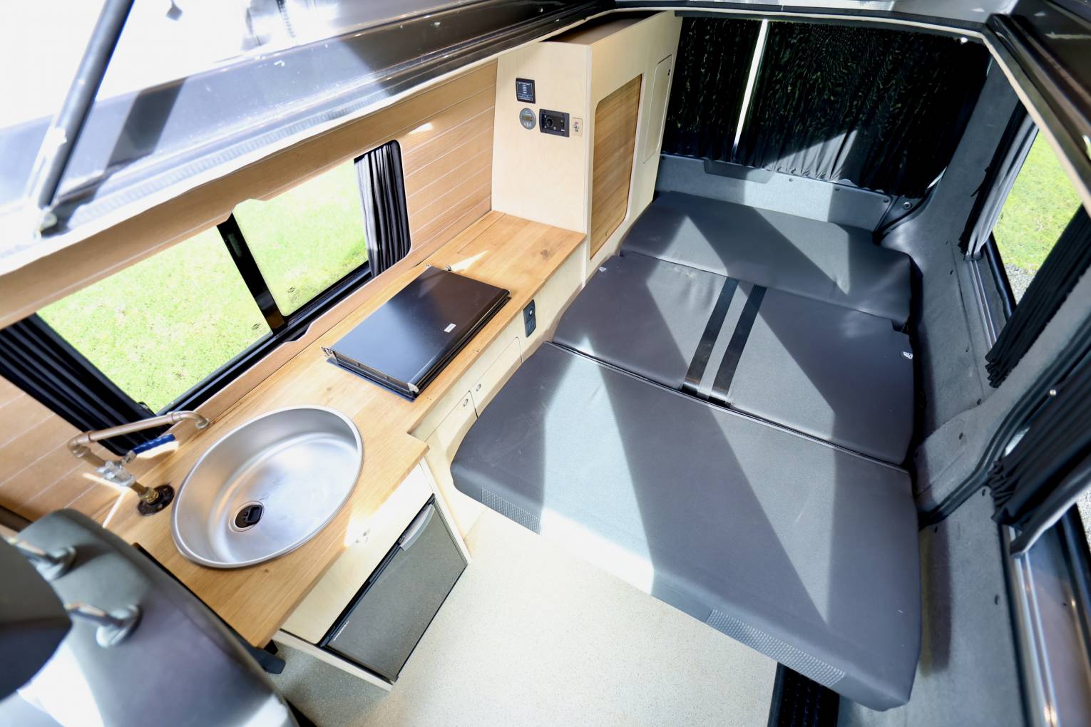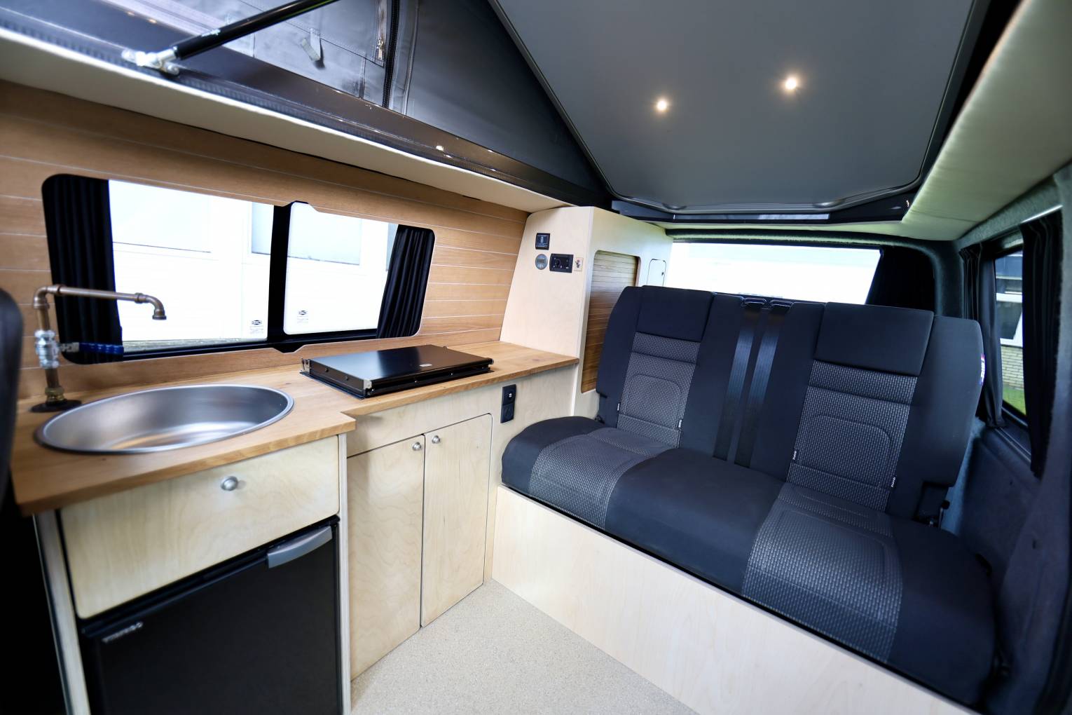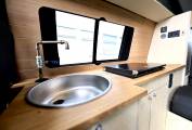 This camper have been finished in Birch wood making nice light in side, with fabulous artisan style kitchen area, making it a unique style of life style camping, the conversion has been done by Camper and Kit. One of the great features of this camper is that the hob/heater works of the diesel tank (Wallas XC DUD hob/heater system) the thing about this hob is it also the heater for camper saving space and weight in the vehicle, (no need for an extra heater or gas bottle).