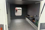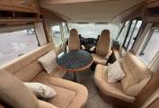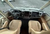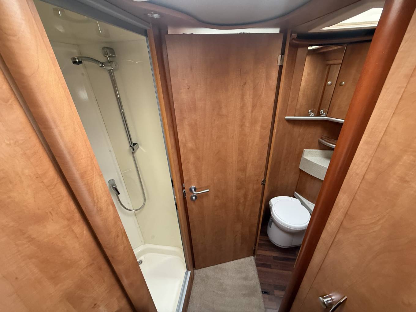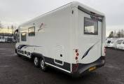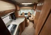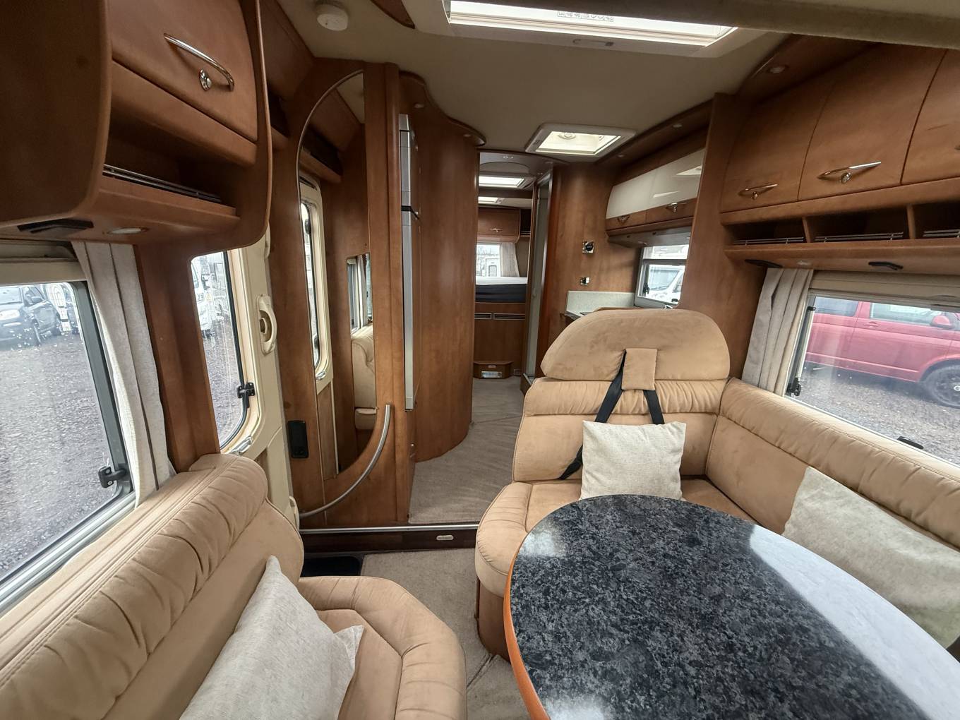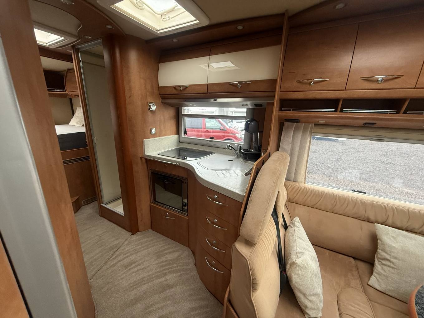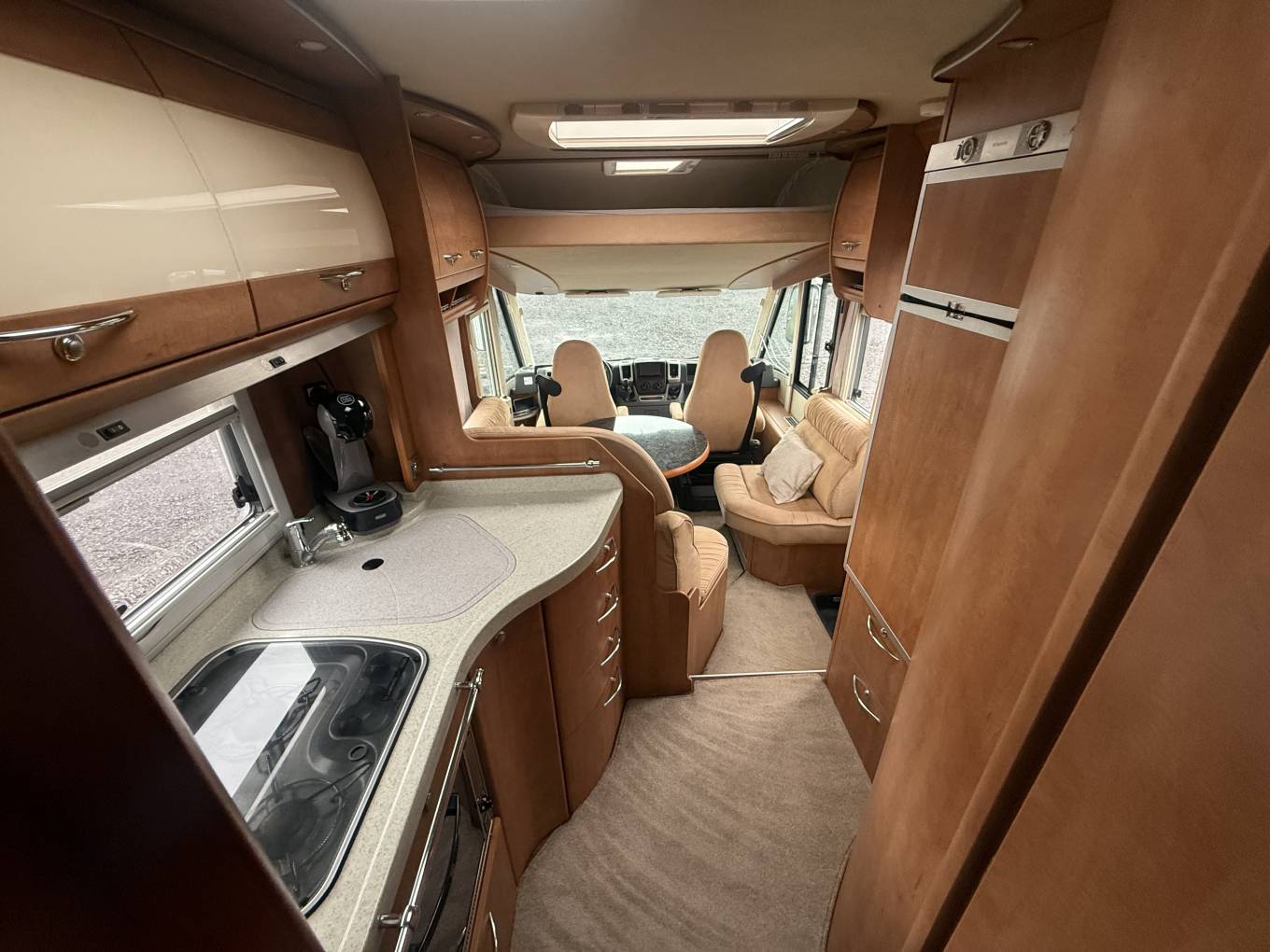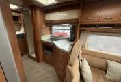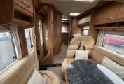 The layout is from the front you have two front pilot seats that swivel in to the L-Shape dinette lounge area with a stylish round table and side bench which caters for up to 6 people. Quick-up TFT TV pull-out system behind the backrest of the side bench. It has a best in class large overcab drop down bed providing a sleeping area of 1.95m x 1.60m. Midship it has a high quality Corian worktop kitchen with 3 x Burner gas hob with below built in oven and grill, opposite is a large 3 way automatic fridge with separate freezer with household quality metal Draw runners and hinges. Then there is the master luxury bathroom (Varo design) with washbasin & toilet compartment with Separate Corian shower opposite, the master bathroom can be separated from the living area with a dual purpose solid door to separate the rear bed, the toilet is fitted with a SOG unit and spare toilet cassette. At the very rear you have a large transverse fixed double bed 2100mm x 1470mm with high-quality cold foam mattresses.