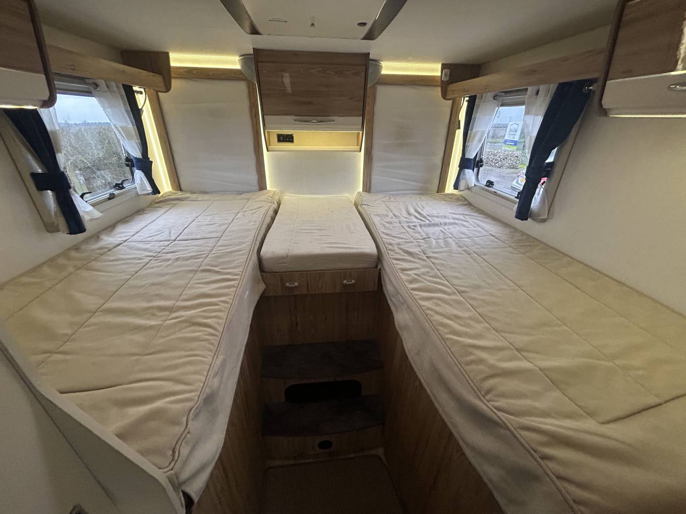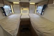 To the rear of the motorhome, you will find the twin fixed beds (which can also be used as one extremely large bed) situated over a large garage. There is also ample storage, including wardrobes on either side of the bed and eye-level lockers.