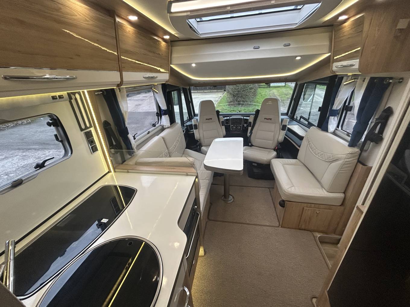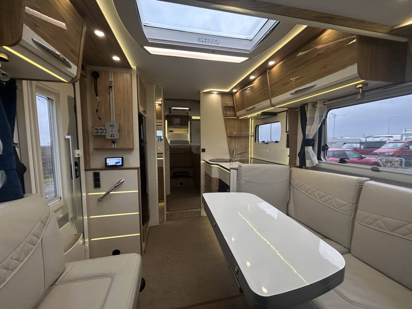 The motorhome comes with radio, WIFI, Bluetooth, reversing camera, cab air con, cruise control, front cab blinds, TV aerial, solar panel, wind out canopy, Truma habitation air con, Truma hot water and heating system, carpets, Gaslow system, external shower point and BBq point, wind out awning, electric step.