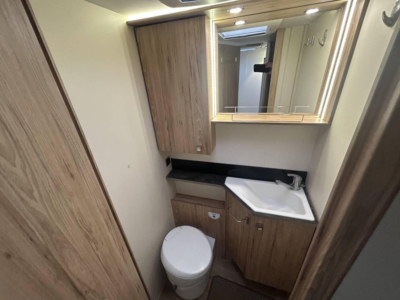 To the foot of the bed, you will find the en-suite split bathroom, with the washroom to one side which incorporates a vanity hand wash basin & Thetford cassette toilet. Opposite you will find the separate shower cubicle.