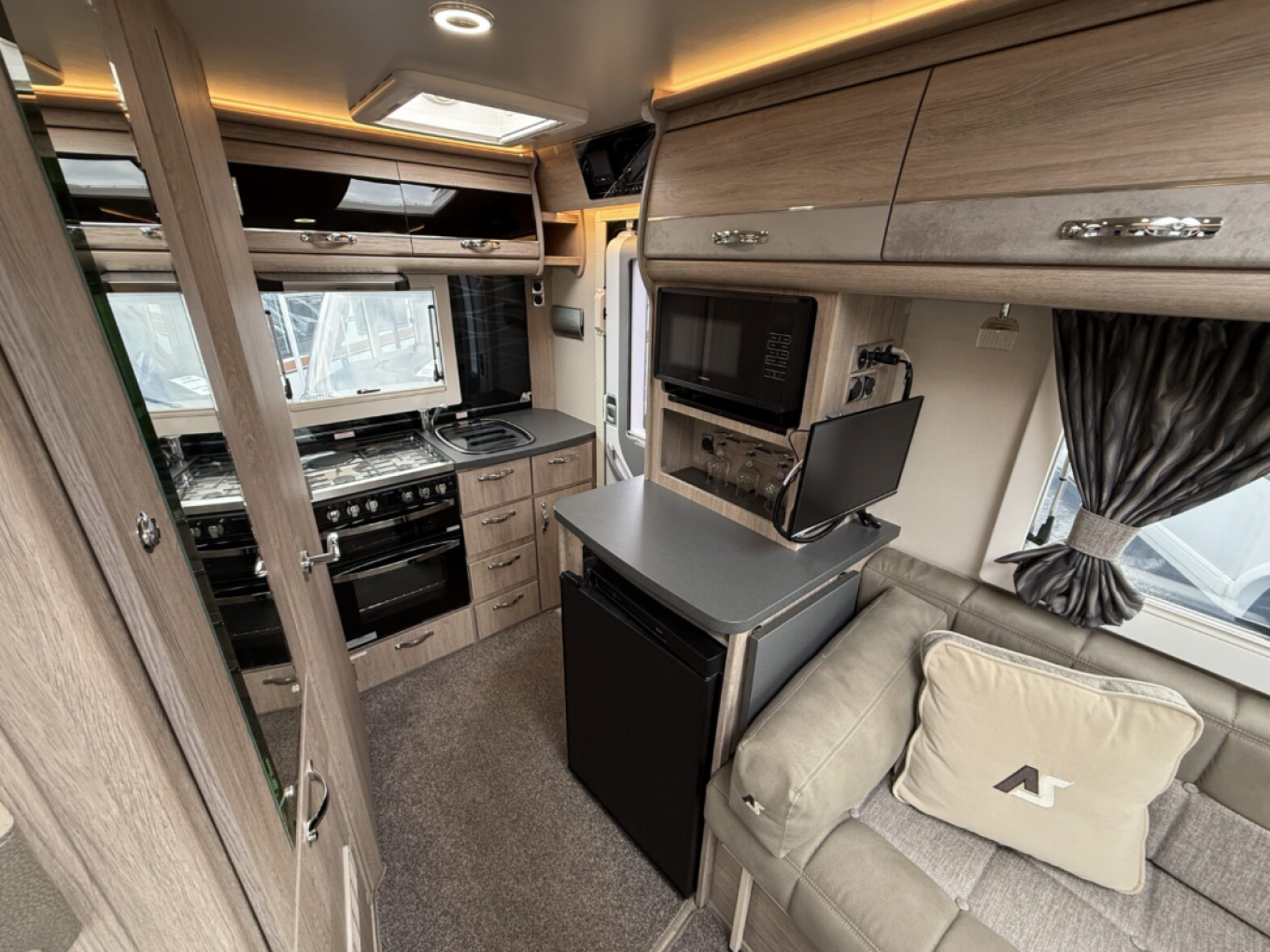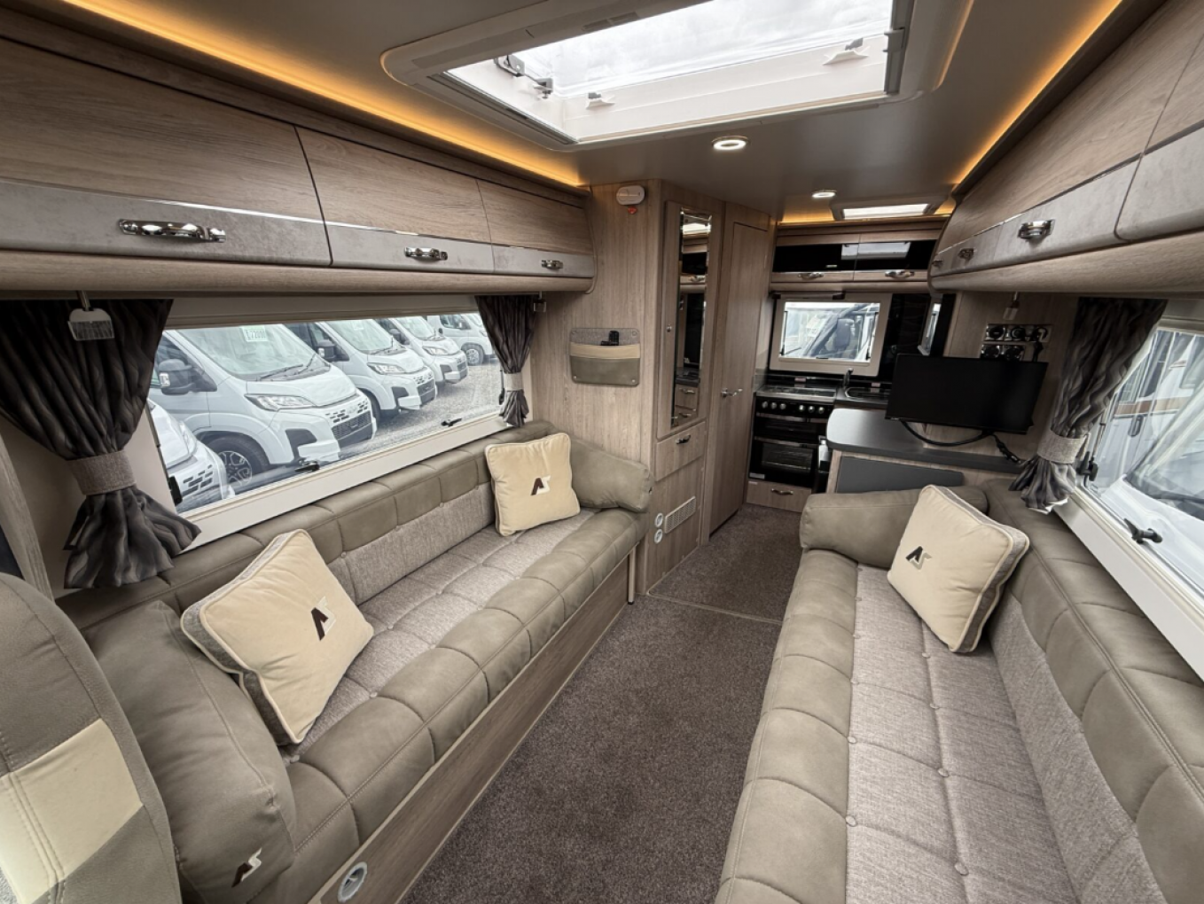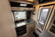 The standout EK (End Kitchen) layout offers a well equipped cooking space at the rear, with a three burner hob, separate grill and oven, microwave, fridge, freezer and plenty of storage. The TB LP (Twin Bench, Low Profile) lounge area features two large side facing sofas that convert quickly into a pair of singles or a large double bed, depending on preference, there is additional generous storage, including a wardrobe and overhead lockers.
