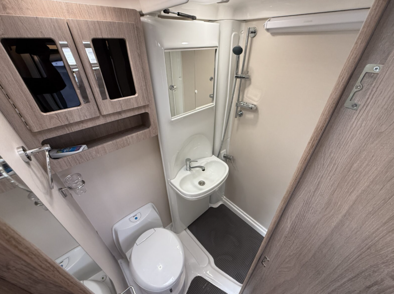 The washroom includes a separate shower cubicle, electric flush toilet, basin and vanity storage, all in a stylish space efficient design.