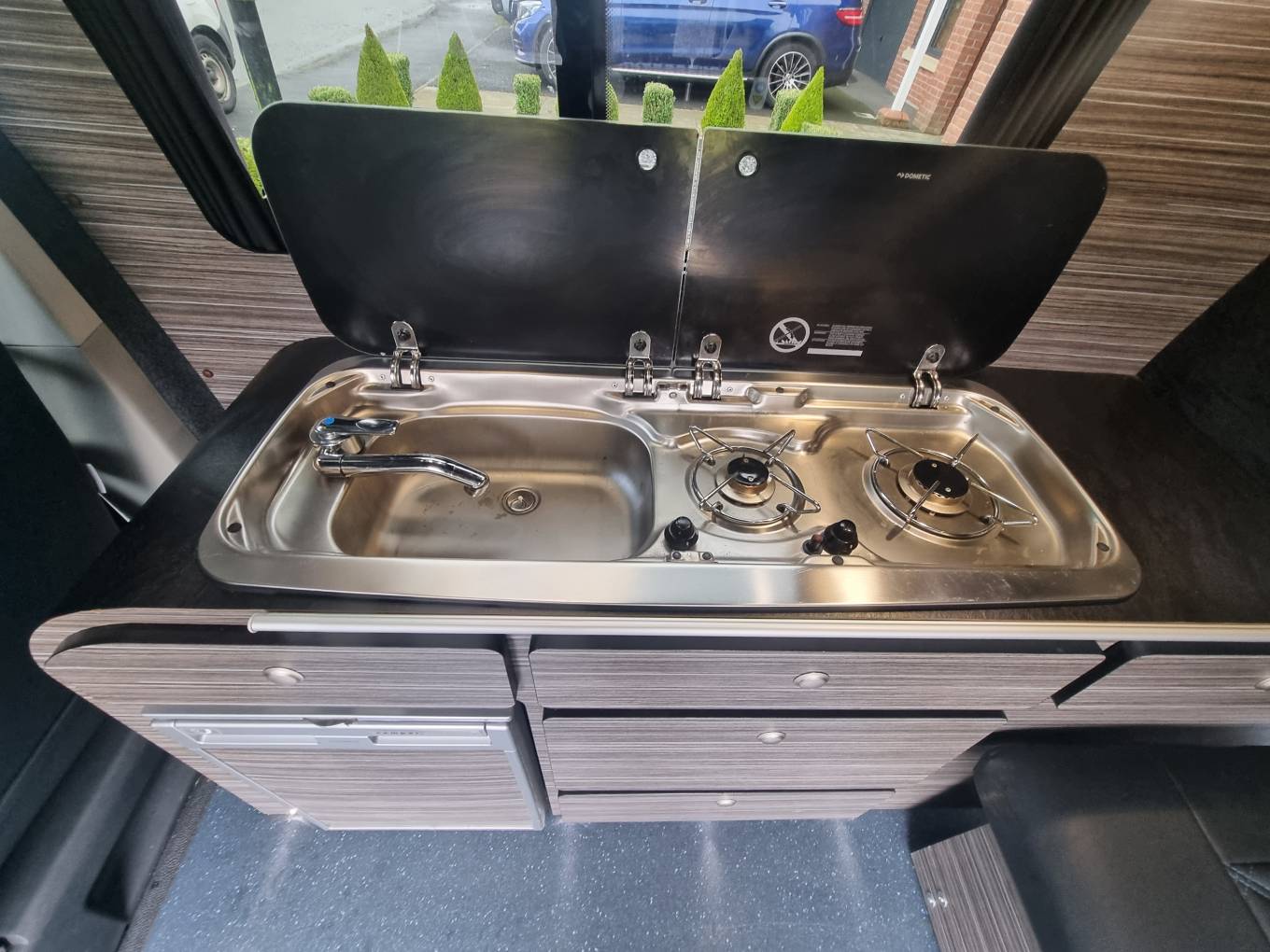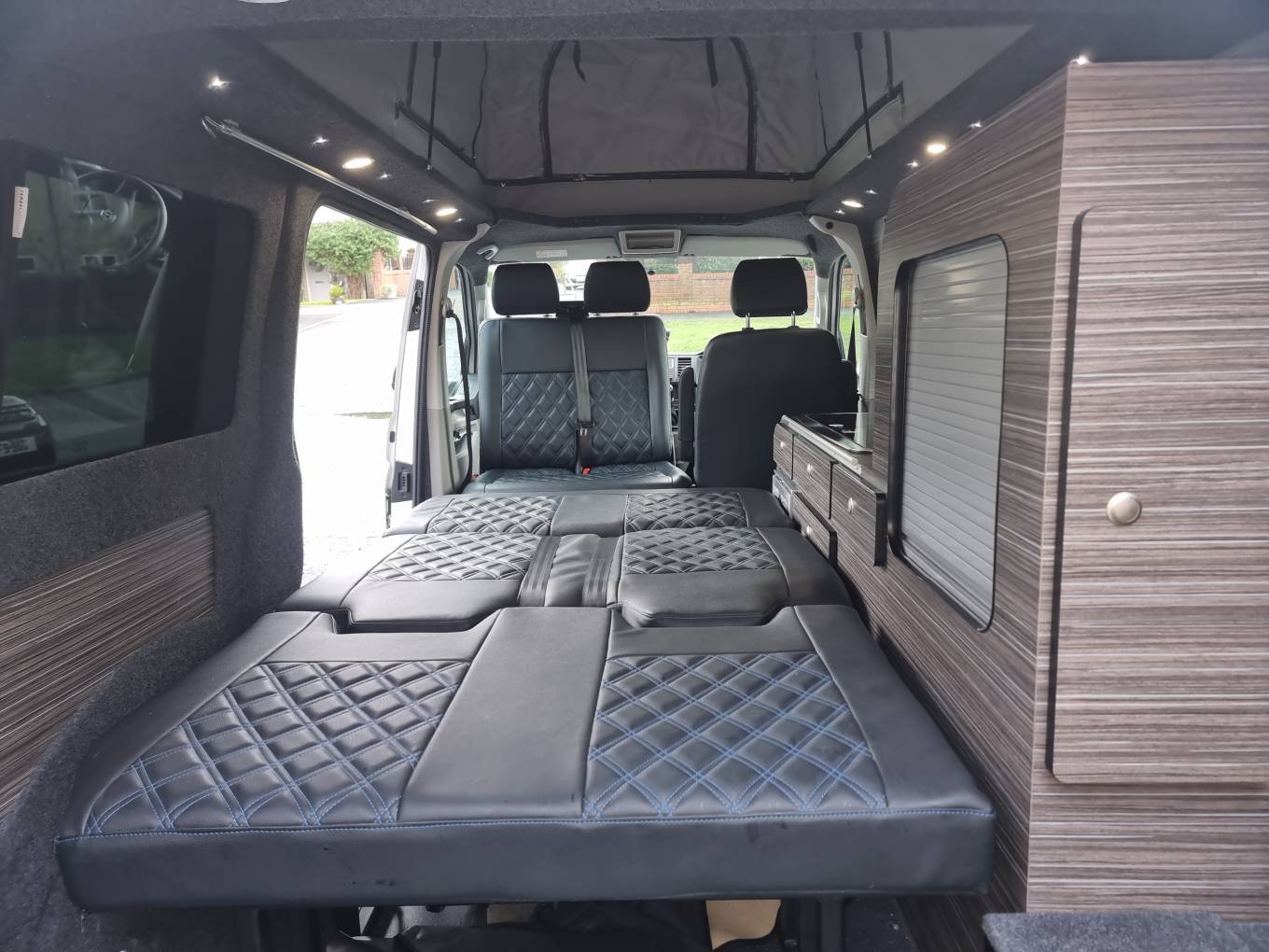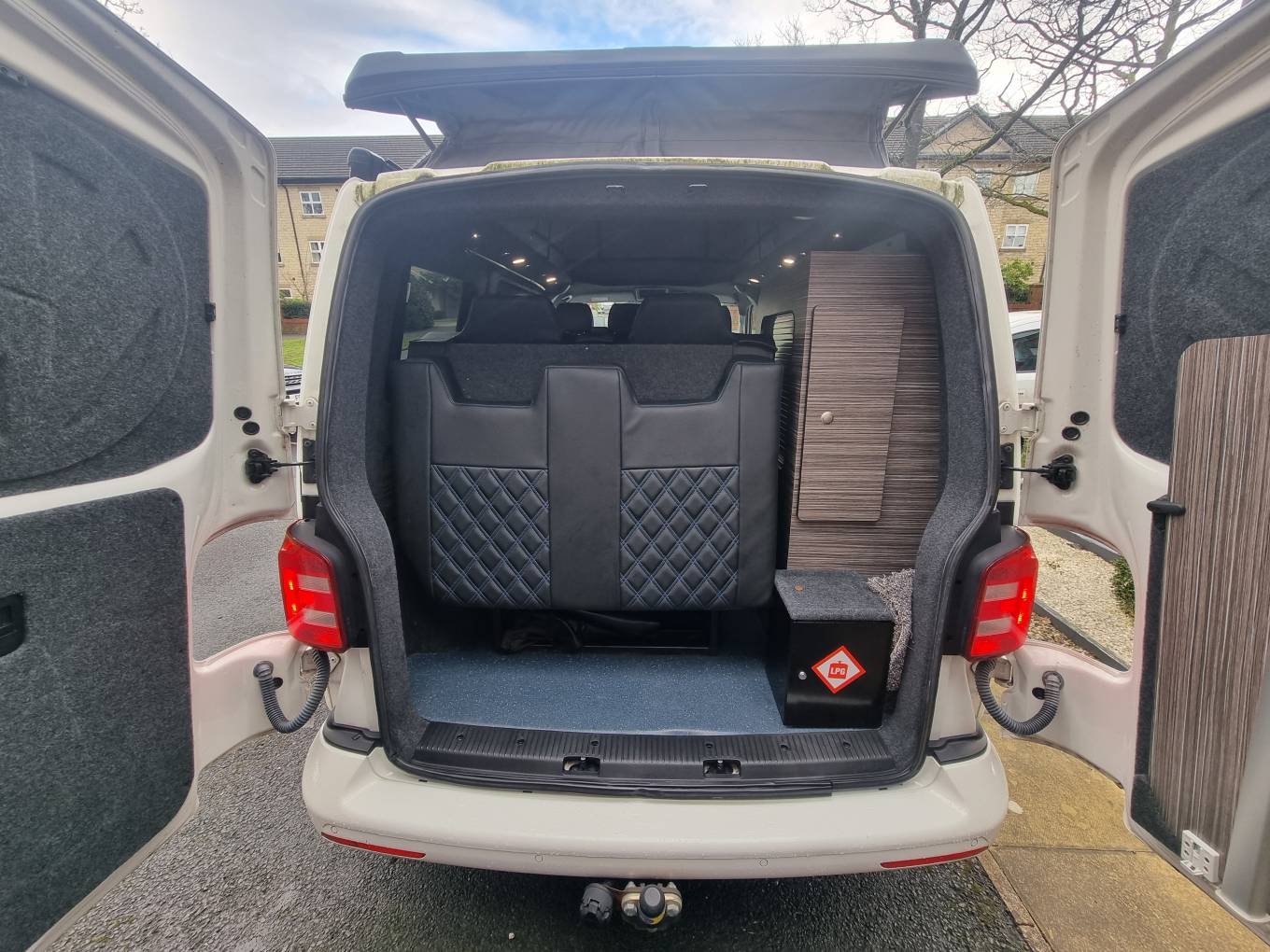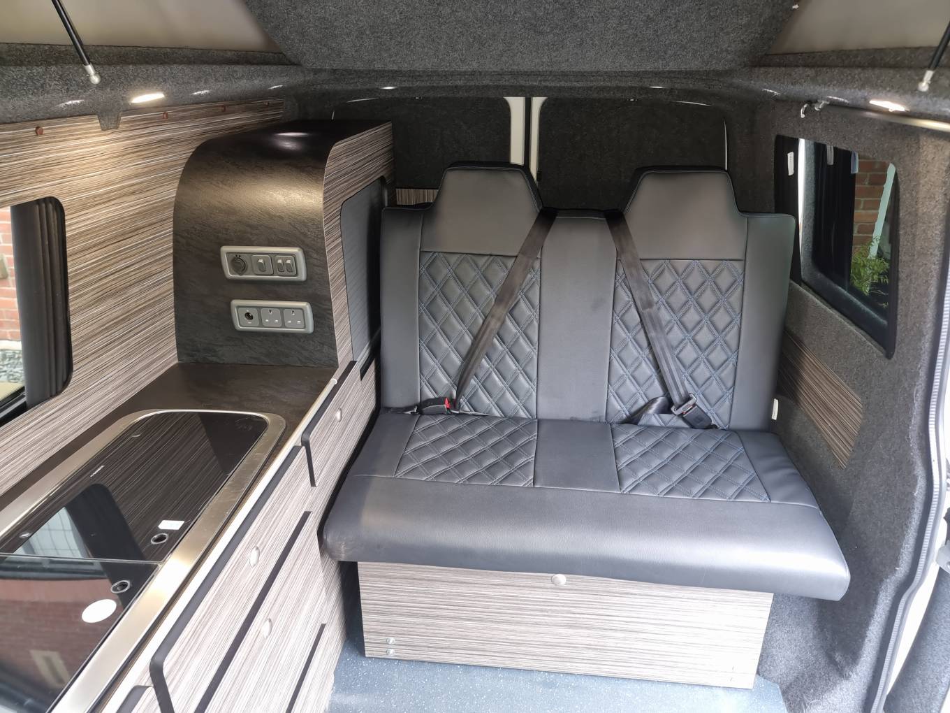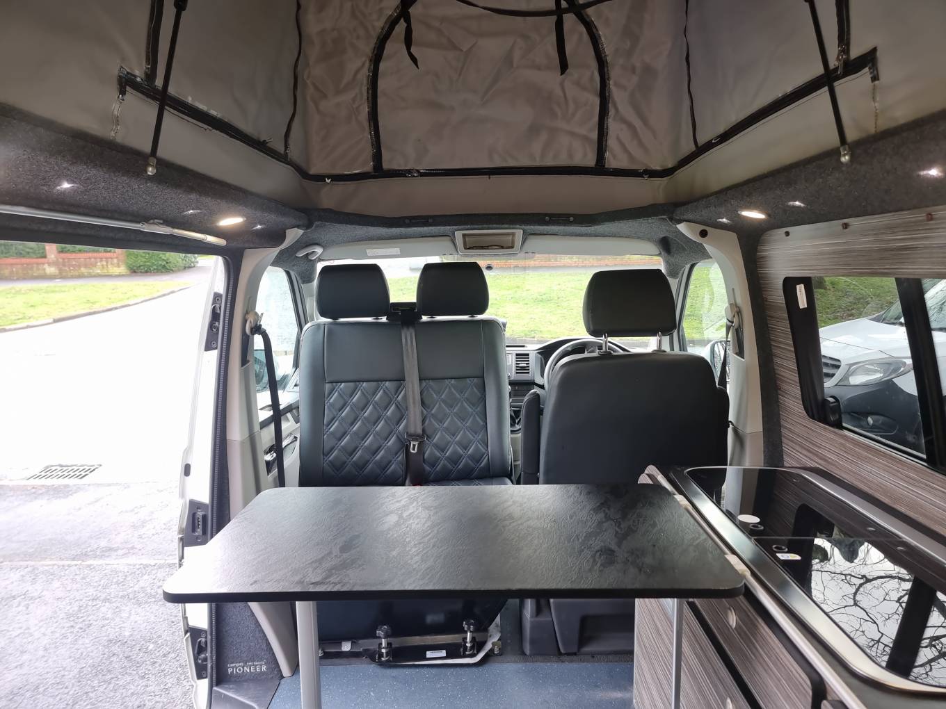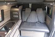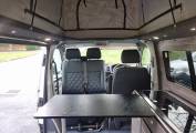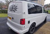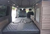 4 berth/5 belt campervan based on the popular Volkswagen Transporter T28 Complete with a poptop and bed board, electronic rock n roll bed, leisure battery, 2 burner gas hob and a sink with cold water tap. Swivelling front dual passenger seat on a MS Craft rotating base and a pop-up table creates a comfortable place to dine and entertain. The seating is finished in the popular black effect. Up front there is a DAB and FM radio, electric front windows and adjustable mirrors.