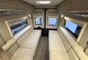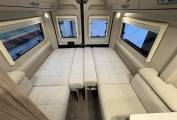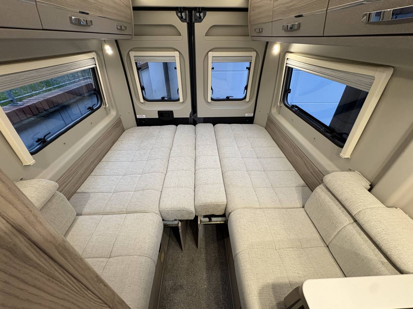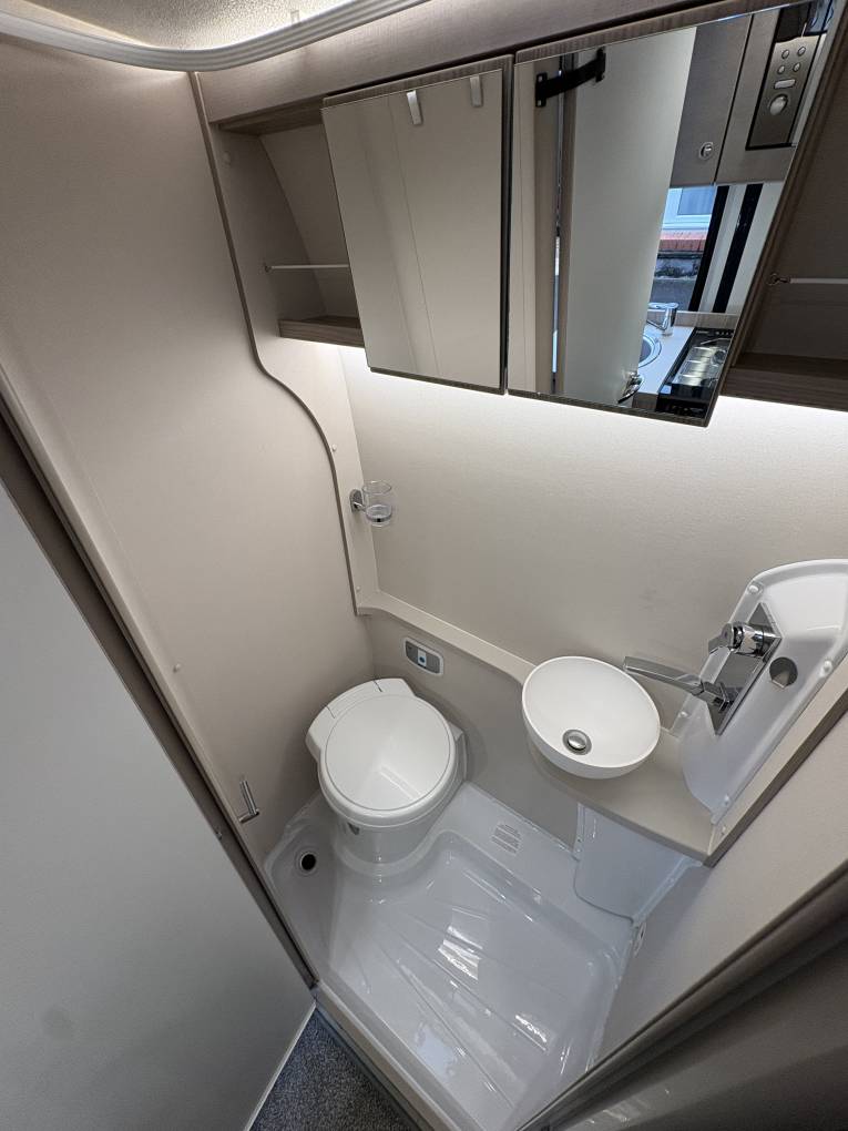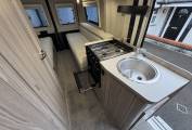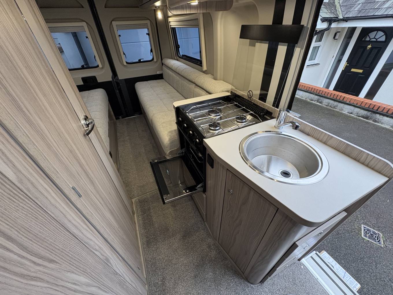 The layout comprises of an end lounge with two bench seats. Perfect for when you want to relax, dine or entertain, the benches also make up into a huge double bed and can be used as single beds measuring 1.9metres in length, you will also benefit from a TV bracket in this area to keep you entertained on those early nights or mornings with a coffee in bed. In Summer you will be able to sit in this area and have the large rear doors wide open to take in the views whilst relaxing or getting ready for a day of adventure. Surrounding this area you have plenty or storage space. Moving forward you have a modern, light washroom with toilet, vanity mirror, shower and sink unit. Opposite you have a well equipped kitchen which comprises of a well sized fridge, gas hobs, grill/oven combi, microwave, hot and cold sink and surrounding storage units that are all in really lovely condition and open and close with ease. One thing you will notice about this model is the stunning lighting around the camper.