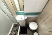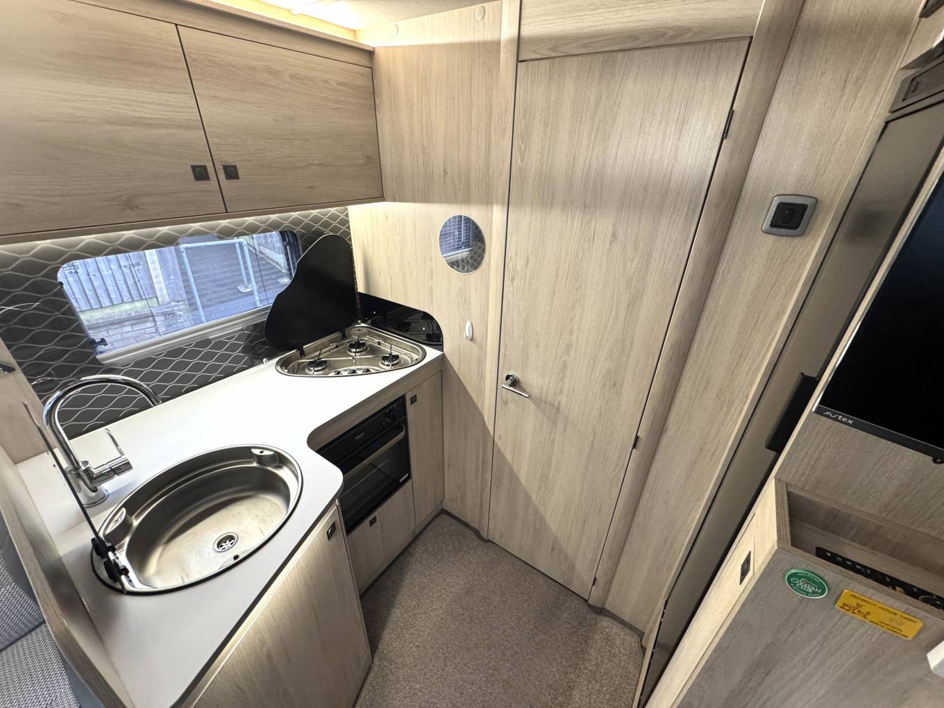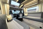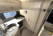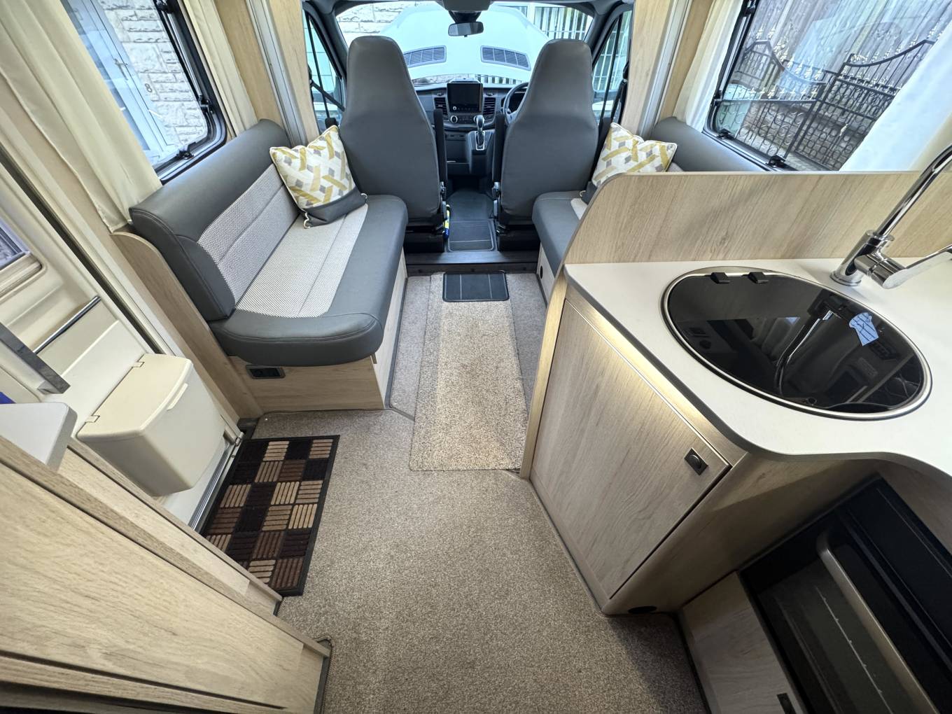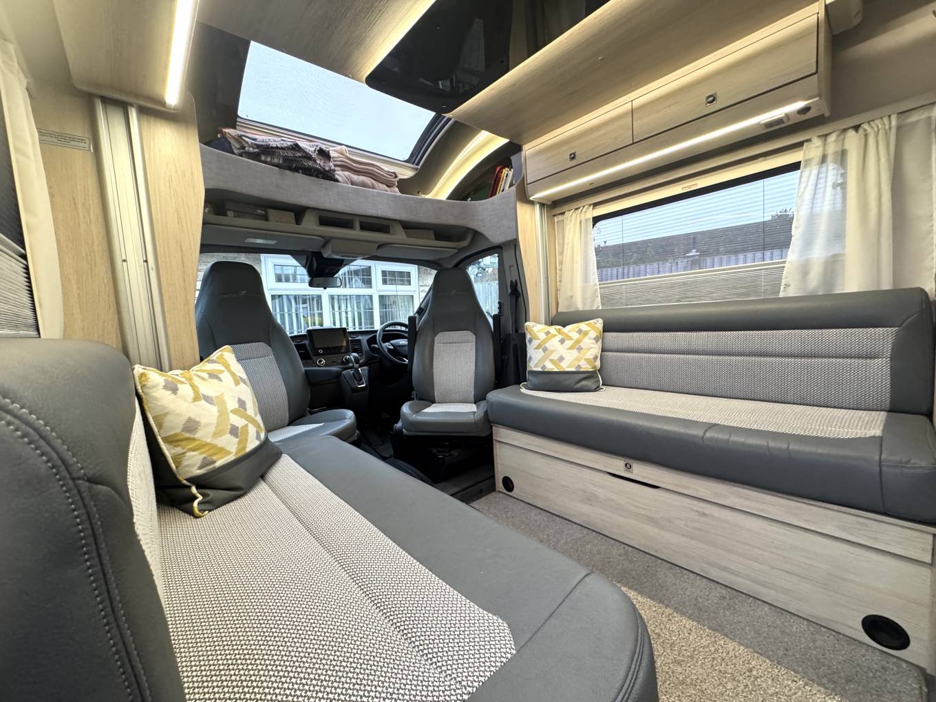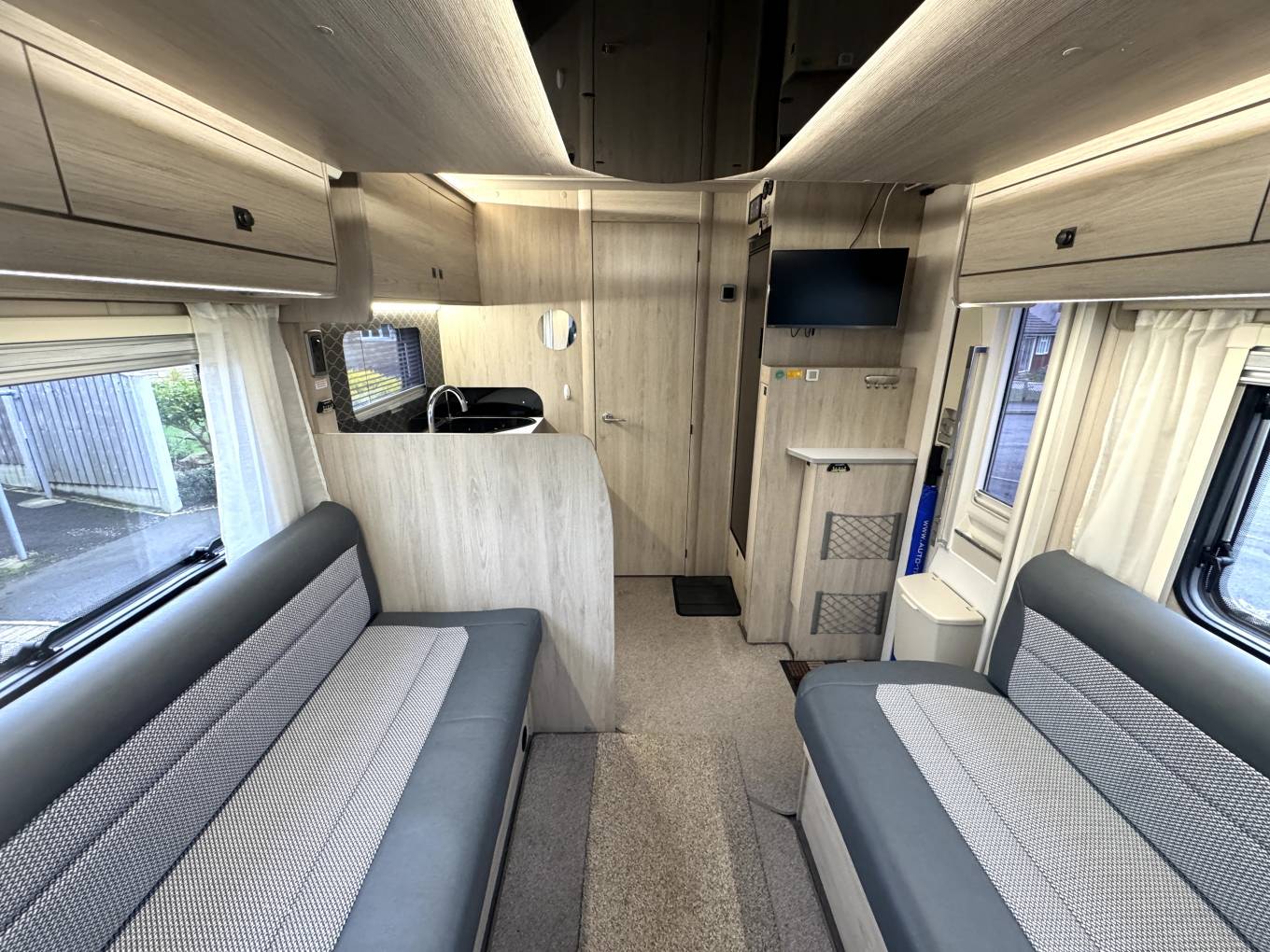 The layout makes excellent use of space, with a front lounge made up of two side-facing bench seats, plus swivel driver and passenger seats to create a sociable seating and dining area. An electric drop down bed conveniently drops down above the lounge. The central kitchen is positioned for convenience and provides good worktop space with practical storage for everyday use. To the rear is a full end washroom, featuring a separate shower, along with a good-sized wardrobe, giving useful storage and changing space.