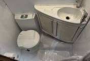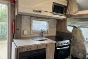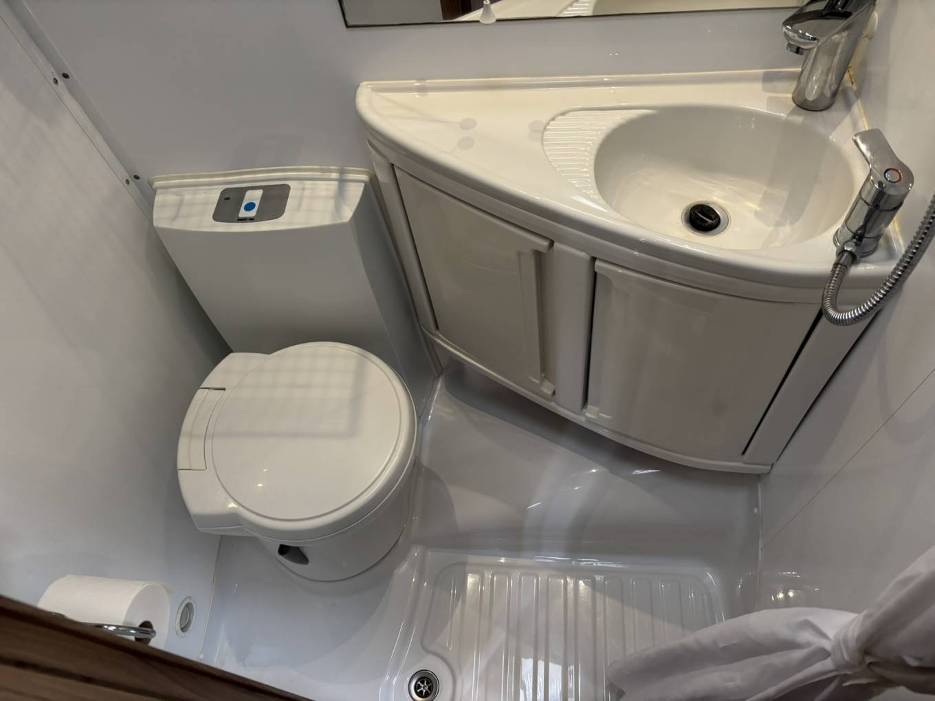 The well-designed layout is one of the standout features of the Lifestyle 686, offering a spacious rear lounge with large windows that flood the interior with natural light. This comfortable seating area easily converts into a generous double bed, making it ideal for couples. The front dining area also converts into a double bed and then you have the large overcab double bed. The central kitchen is well appointed and practical, featuring a gas hob, oven/grill, microwave, large fridge/freezer, stainless steel sink, and ample cupboard storage, perfect for extended touring. Opposite the kitchen, the side washroom benefits from a separate shower cubicle, cassette toilet, wash basin, mirror, and storage.