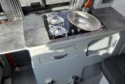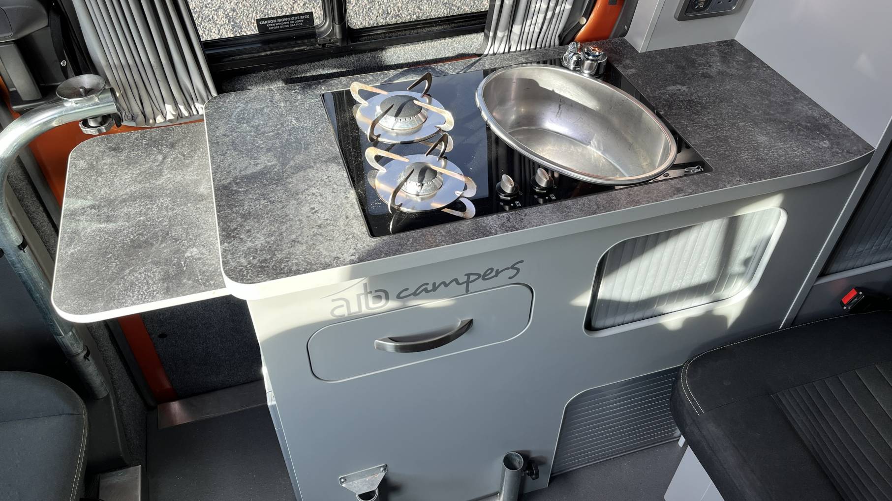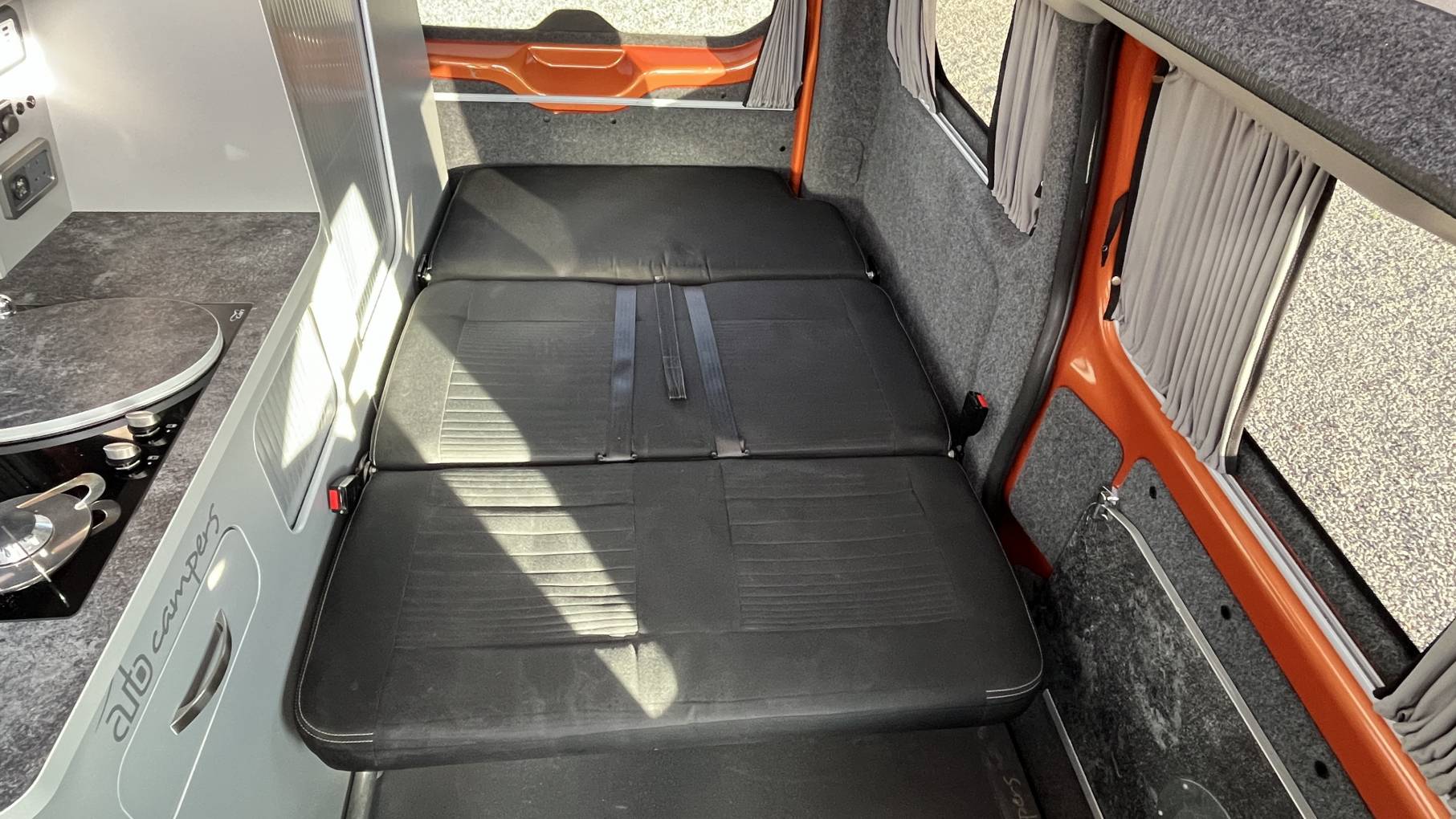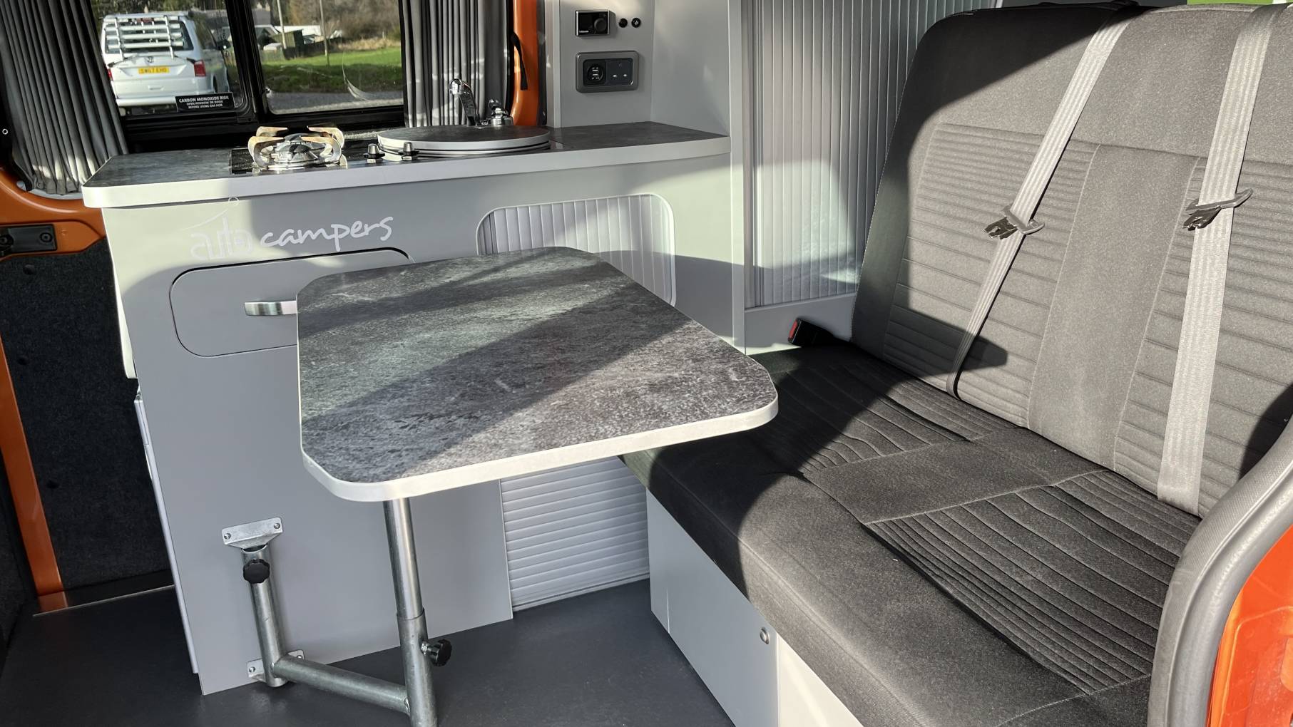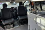 The Auto-Campers leisure van conversion includes full insulation and lining throughout, pop-top roof with bed with midge mesh. Plus swivelling driver and passenger seats, twin sliding doors, Webasto airtop 200 diesel heater, Altro flooring, bespoke matt grey furniture, 2 ring gas hob, kitchen sink, Titan M1 certified Rock and Roll Bed, 4 belted seats, 40 litres fresh and waste water tanks, 115AH leisure battery, 100W solar panel, 1x12v and 2x 240V sockets, 50-litre compressor fridge, black out curtains and reflective cab screens.