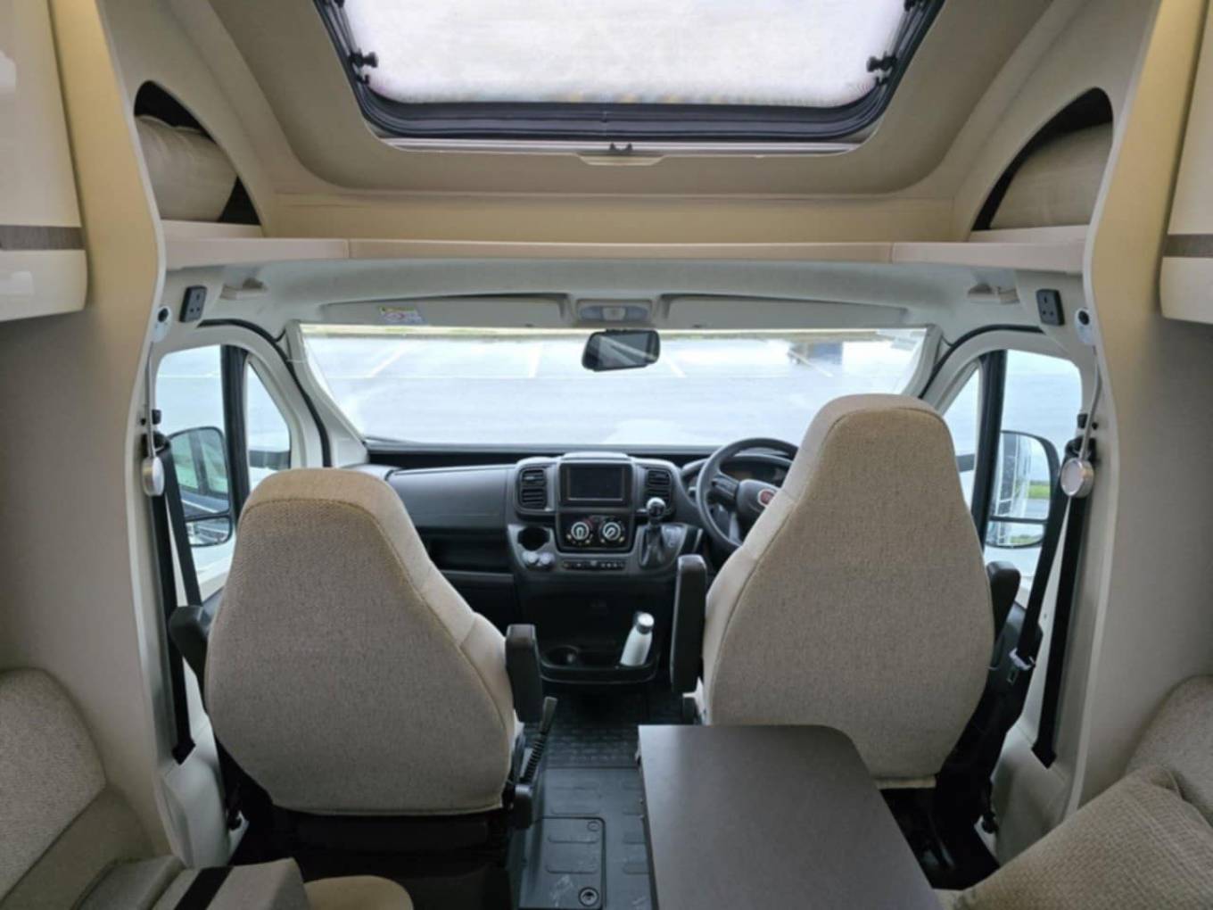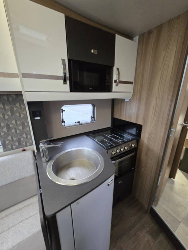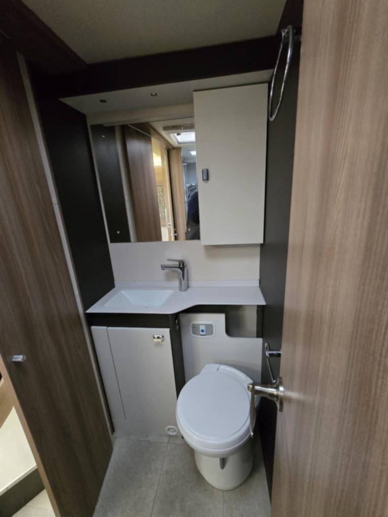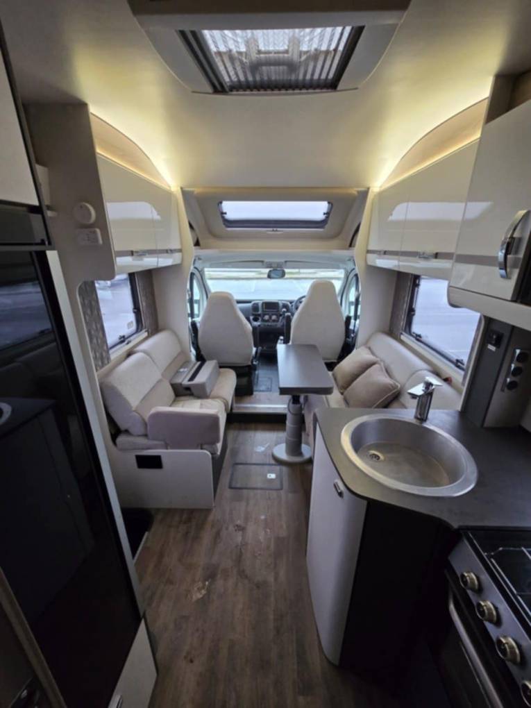 Interior & Layout: Fixed rear island double bed – no nightly setup required Electric Drop Down Central Double Bed Centre dinette converts to additional sleeping space Swivel cab seats to maximise the living area Fully equipped washroom with toilet, basin & separate shower Mobile WiFi unit – stay connected on the move. Kitchen & Appliances: Oven & grill Microwave Large Fridge with freezer compartment Plenty of storage for longer trips.