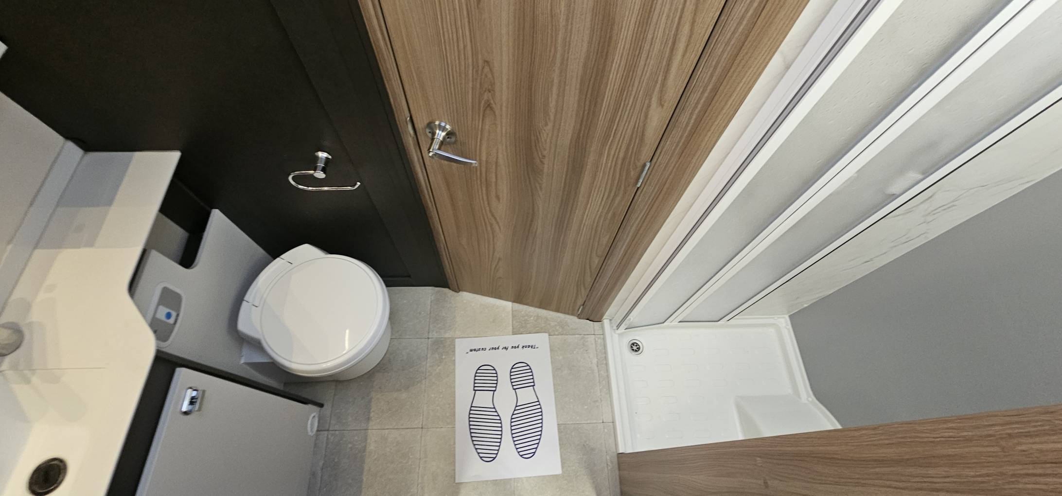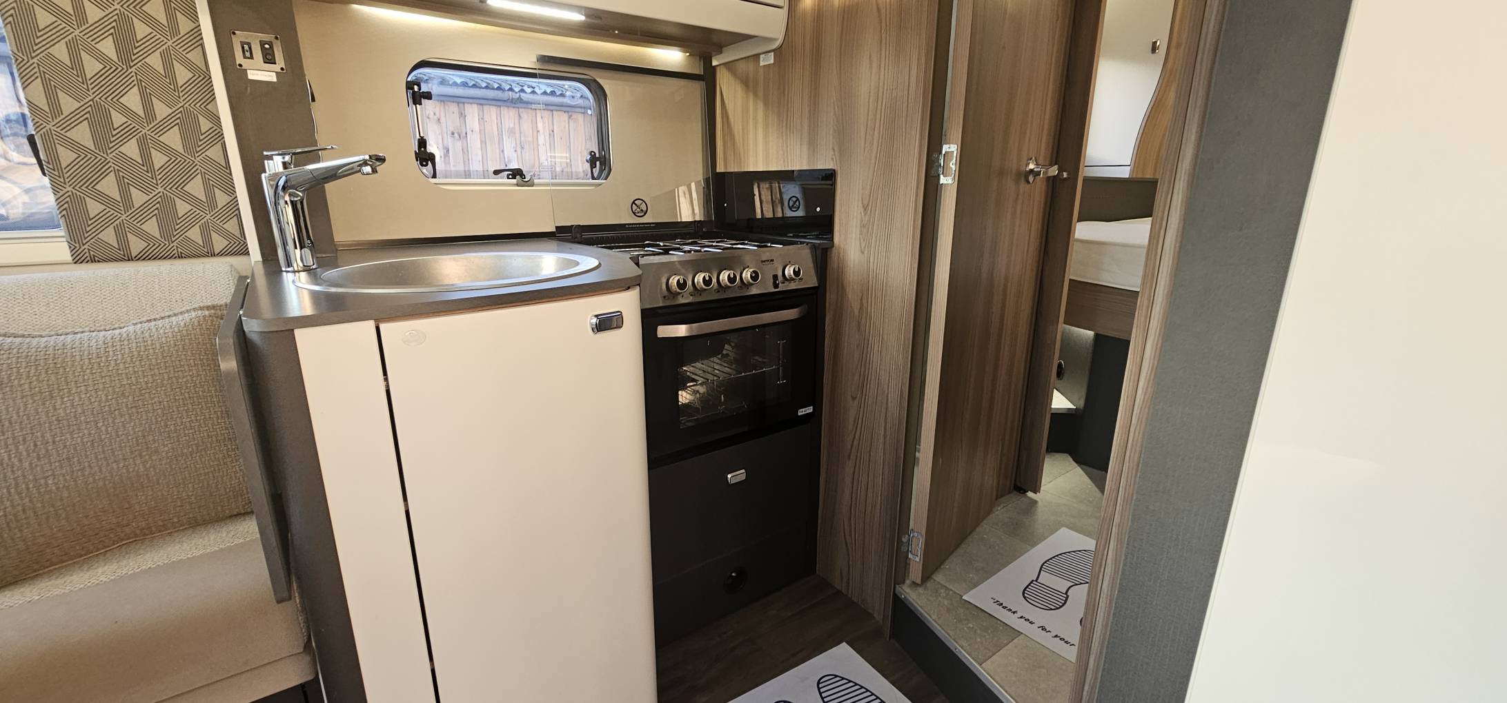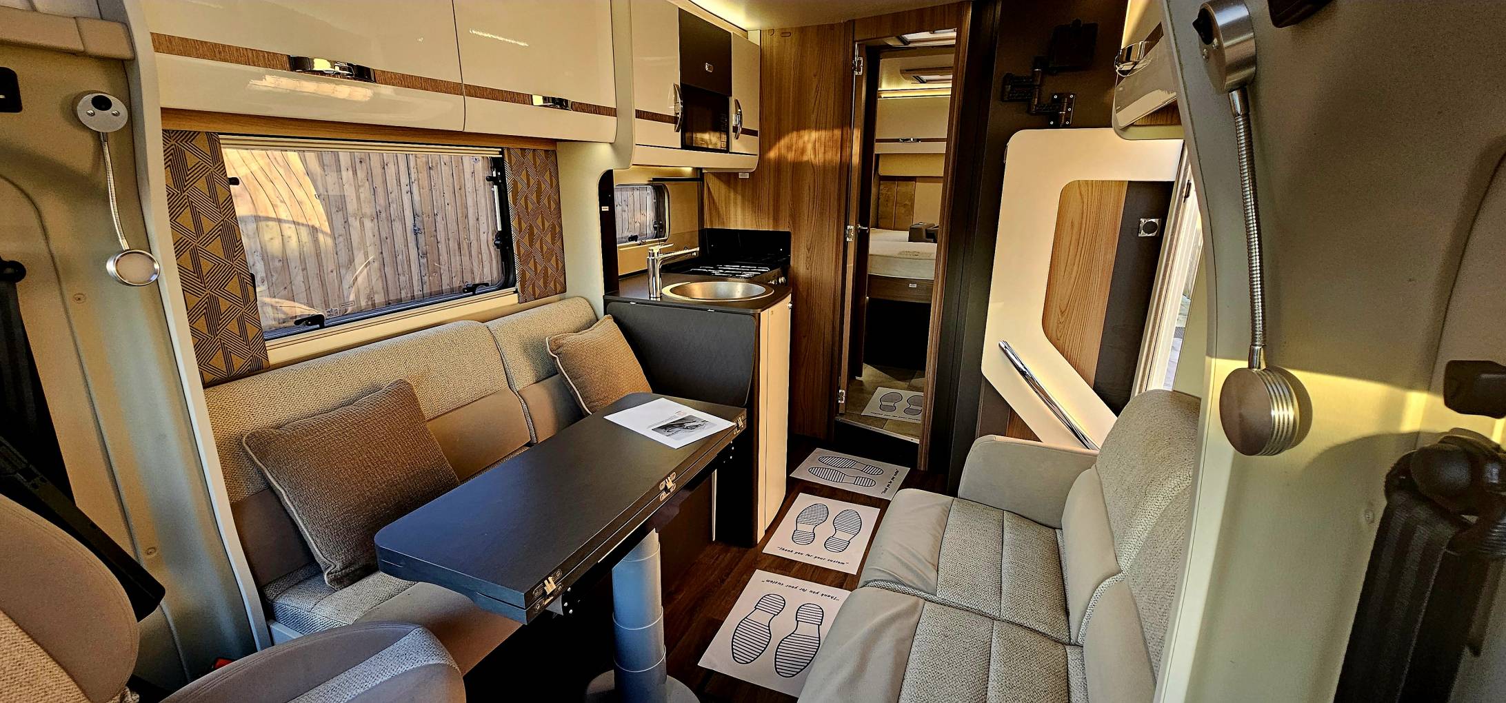 Interior & Layout: Fixed rear island double bed – no nightly setup required. Centre dinette converts to additional sleeping space Swivel cab seats to maximise the living area Fully equipped washroom with toilet, basin & separate shower Mobile WiFi unit – stay connected on the move. Kitchen & Appliances: Oven & grill Microwave Large Fridge with freezer compartment Plenty of storage for longer trips.