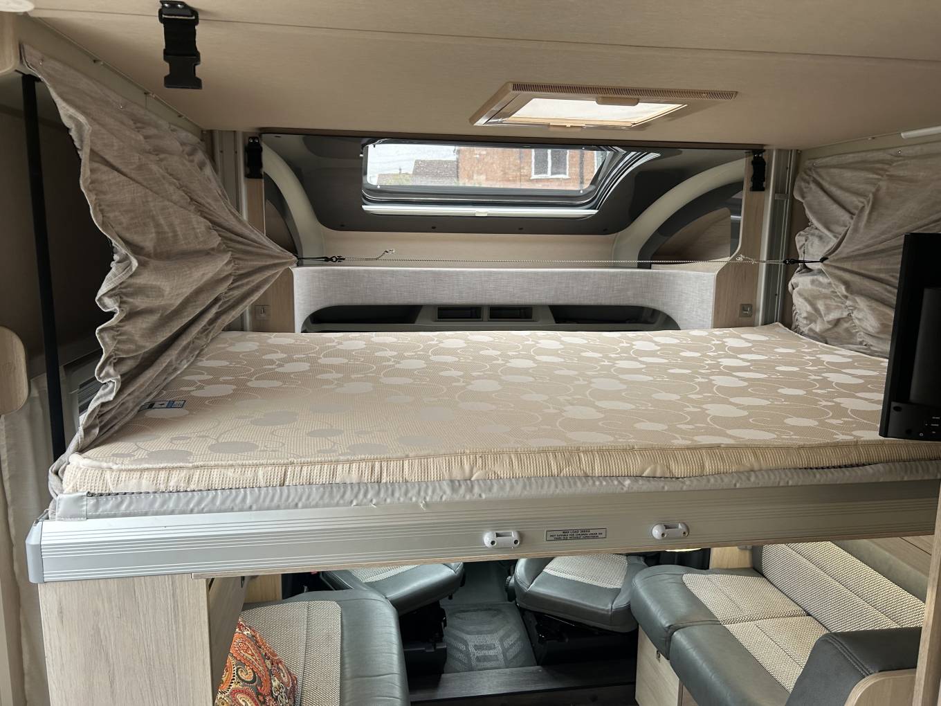 This motorhome is very comfortable to sleep in - it has an electric drop down double bed and and further double that can be made up from the lounge sofas. There is a good sized washroom that has a Thetford flush cassette toilet, sink and SEPARATE SHOWER. Blown air heating and hot water are provide via the Whale heating system. Externally this motorhome comes with lots of extras including a 40L Underslung LPG tank with internal display and European Adaptors, external BBQ point and Silver Insulated external long screen cover for the cab. The motorhome has Grade 3 insulation and is ideal for all year round use.