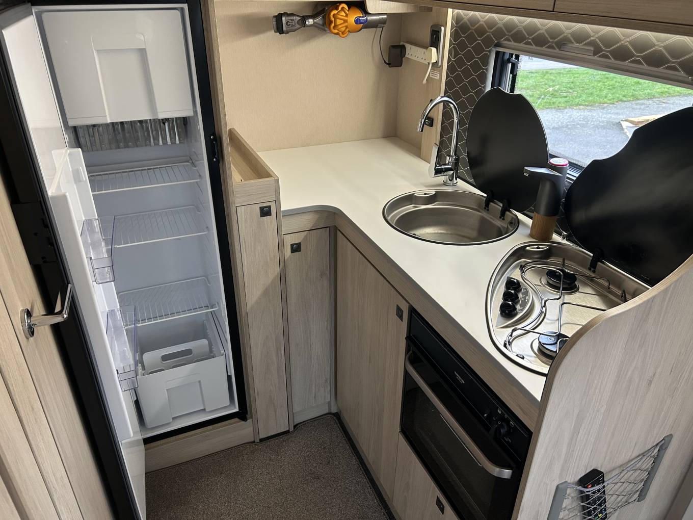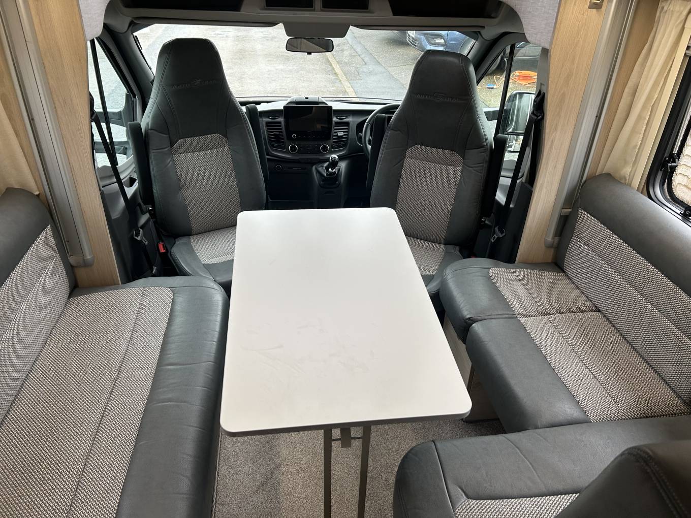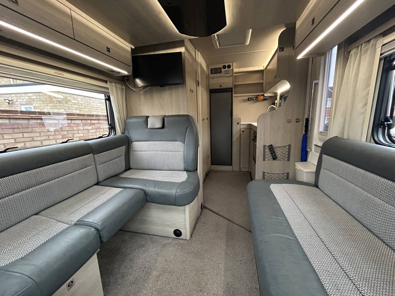 The Autotrail F-Line is built on the Ford chassis and this 6 speed manual has an economic 2 litre engine upgraded to 170 bhp giving you all the power you need to have amazing trips away. It comes with cab air conditioning, cruise control, reversing camera and Xzent 9.5" media screen with Satellite Navigation making it an absolute pleasure to drive. The living area is fantastic in this motorhome with a spacious lounge area at the front, made up from an L-shaped sofa, a side facing single sofa and the two captains chairs that can be swivelled to create an extremely comfortable place to relax. There is a cleverly stored free standing table that can be placed in the centre when required and also has an AVTEX 21.5" smart tv. Moving back there is an extremely well equipped kitchen with oven, grill, hob with 3 gas burners, large 3-way fridge, sink with mixer tap and even has its own Fresh Water tap.