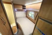The 2 bench seats act as a front lounge/dining area by day and can comfortably seat 4 people, with the driver and passenger seats swiveling to complete the dining area. A mounted TV affords some extra luxury. By night the bench seats convert to a small double bed. The kitchen is located between the lounge/dining area and rear bedroom. This consists of a 3 burner hob, grill, oven, sink, microwave and fridge with freezer compartment, as well as storage cupboards and drawers.
