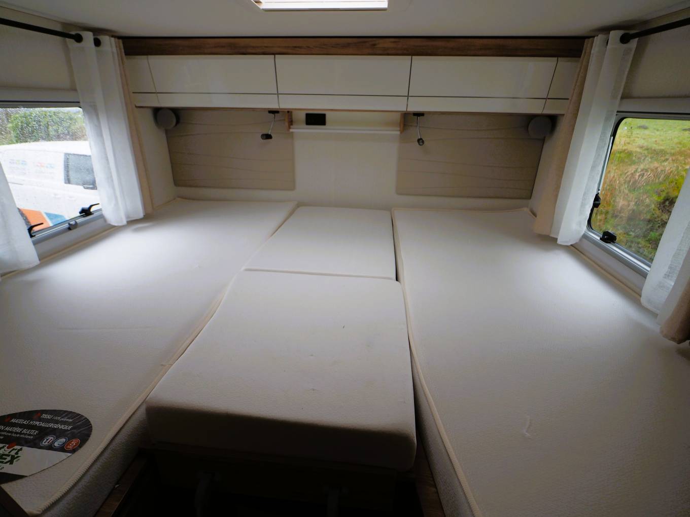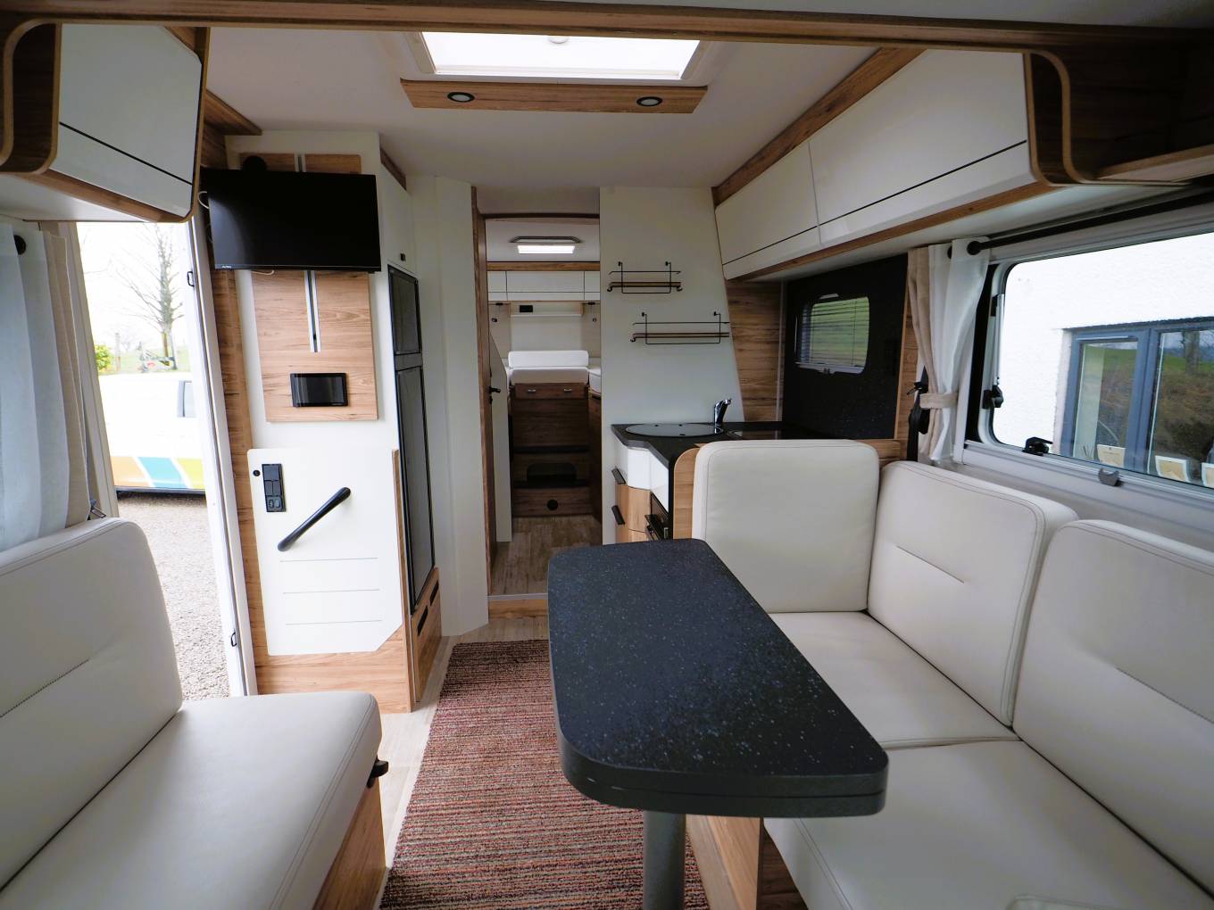Externally there is a large rear garage with access from both sides, a pull out wet locker to the nearside and access points for the leisure battery, 230v hook-up, water and gas. An external gas BBQ point is included. Power provided by 12v leisure battery supported with a roof-mounted solar panel, 230v electric hook-up and twin gas bottles. Heating and hot water comes from the on-board Truma system.