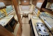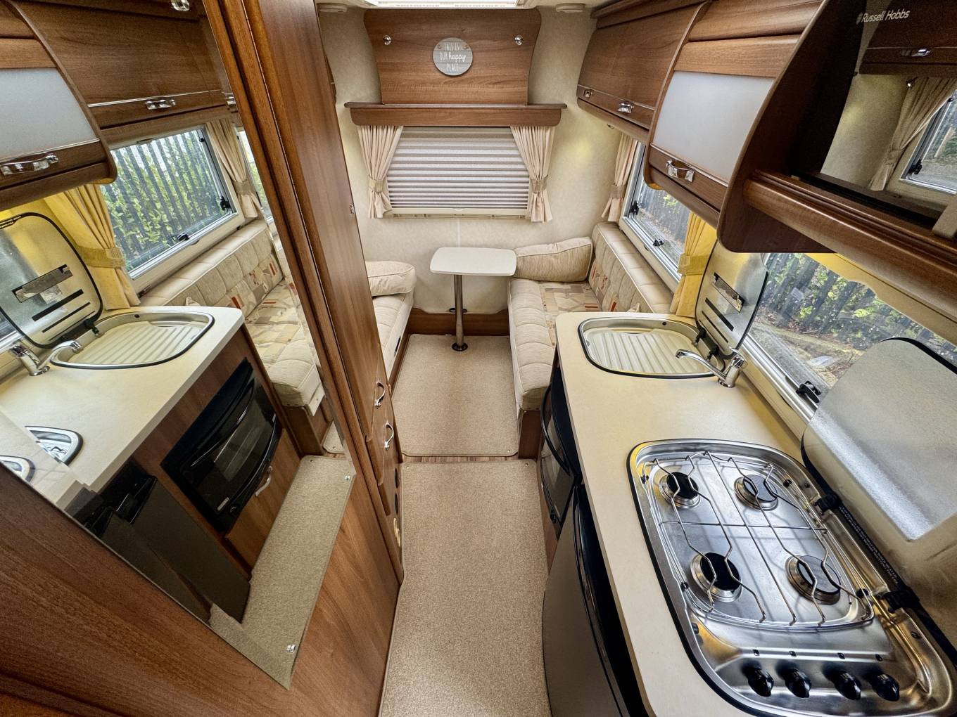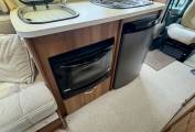 The central kitchen is well equipped with a gas hob grill and oven, fridge freezer, stainless steel sink and ample cupboard storage making it perfect for longer trips away.