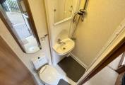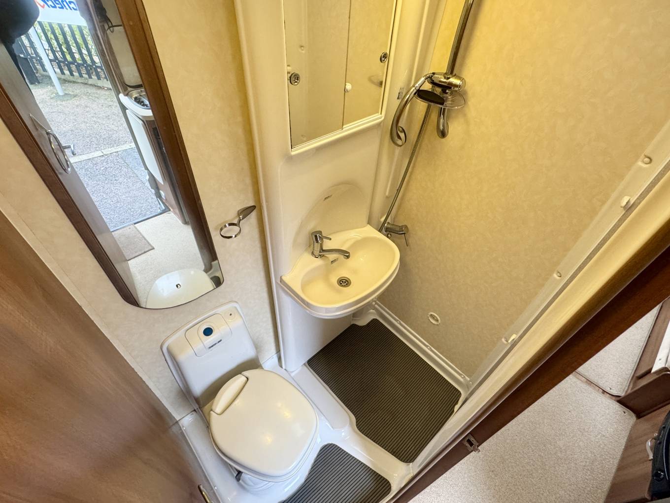 The washroom includes a cassette toilet, wash basin and shower providing all the essentials in a neatly designed space.
