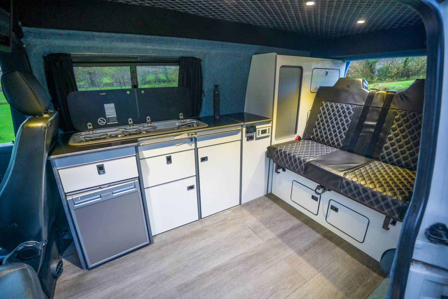 Kitchen & Cooking - Dometic Fridge, Smev hob with 2 Gas Burners, Detachable Centre Dinette, Sink and a large amount of additional storage for your food, supplies, or perhaps your favourite tipple.