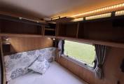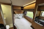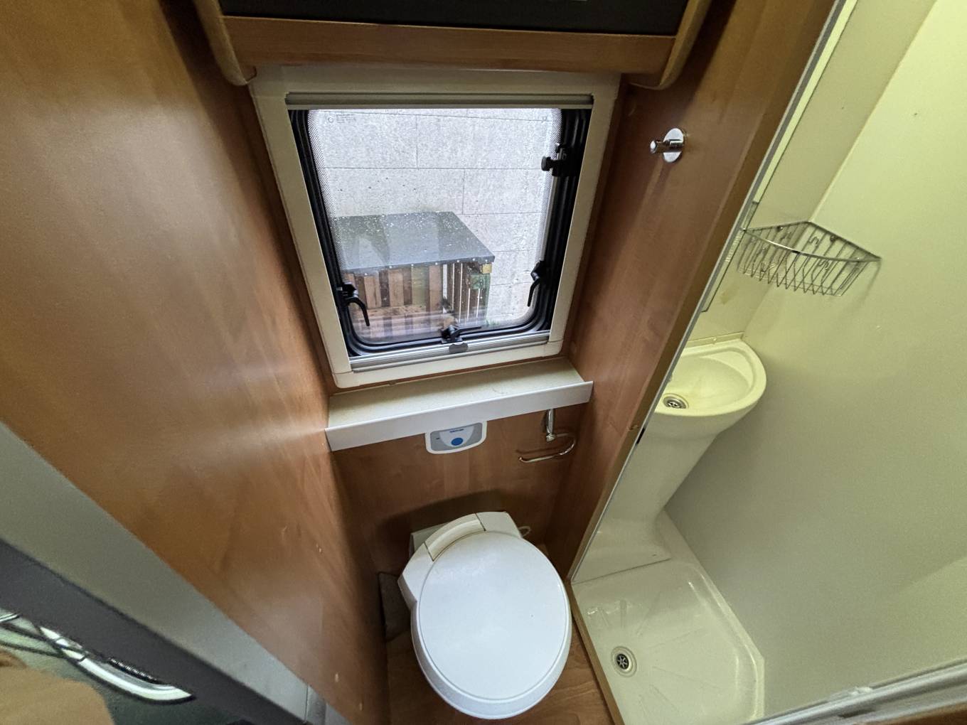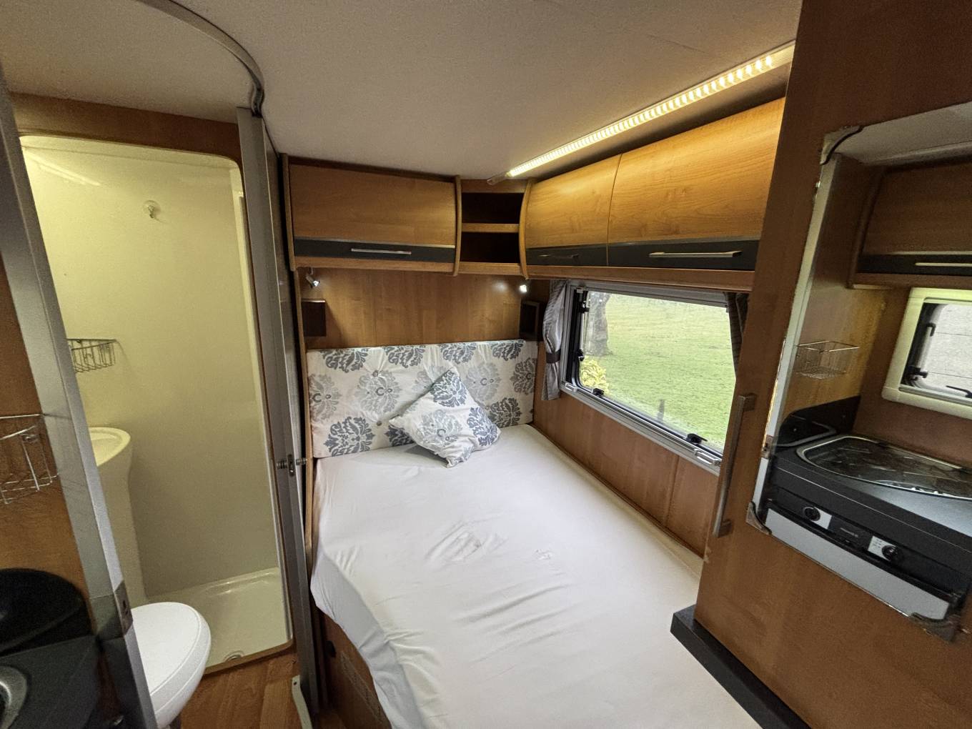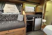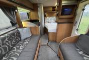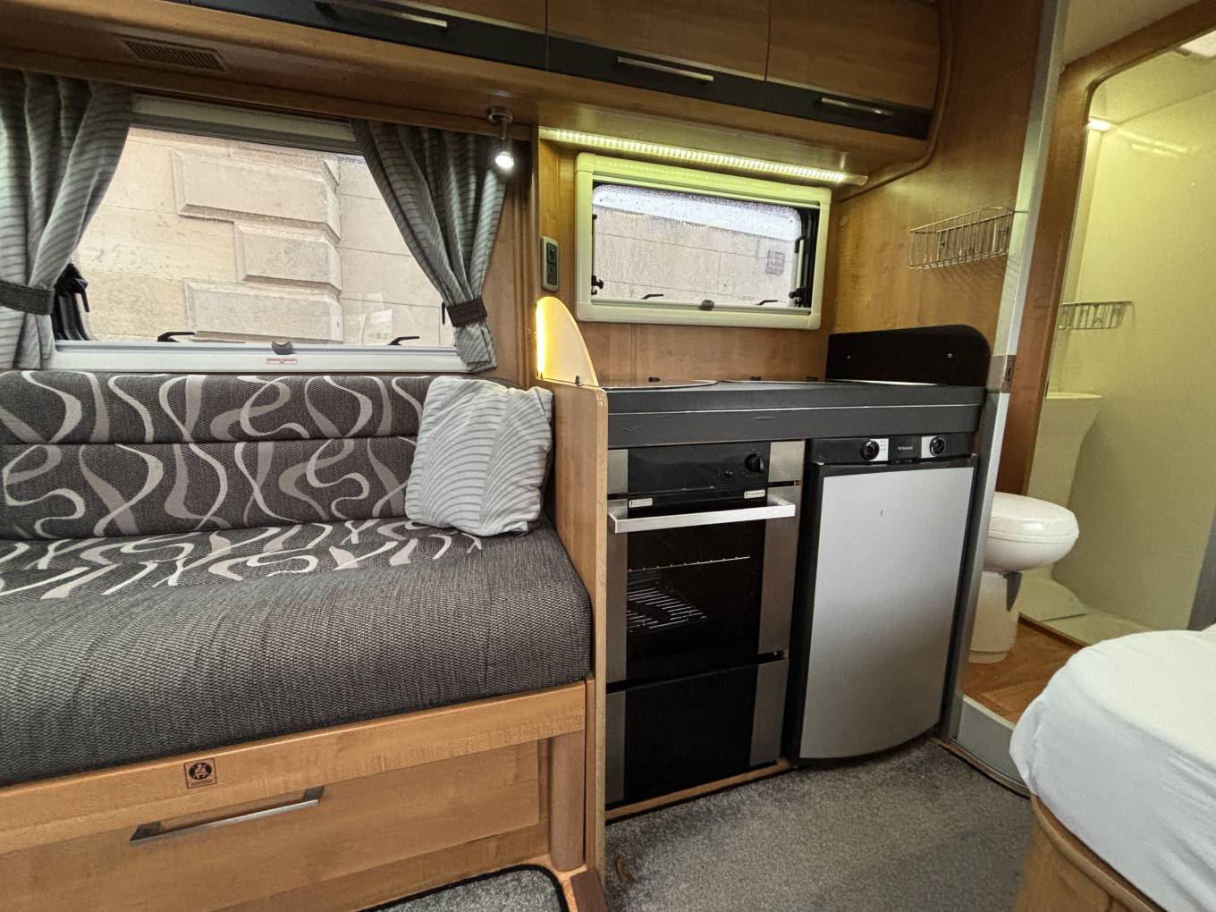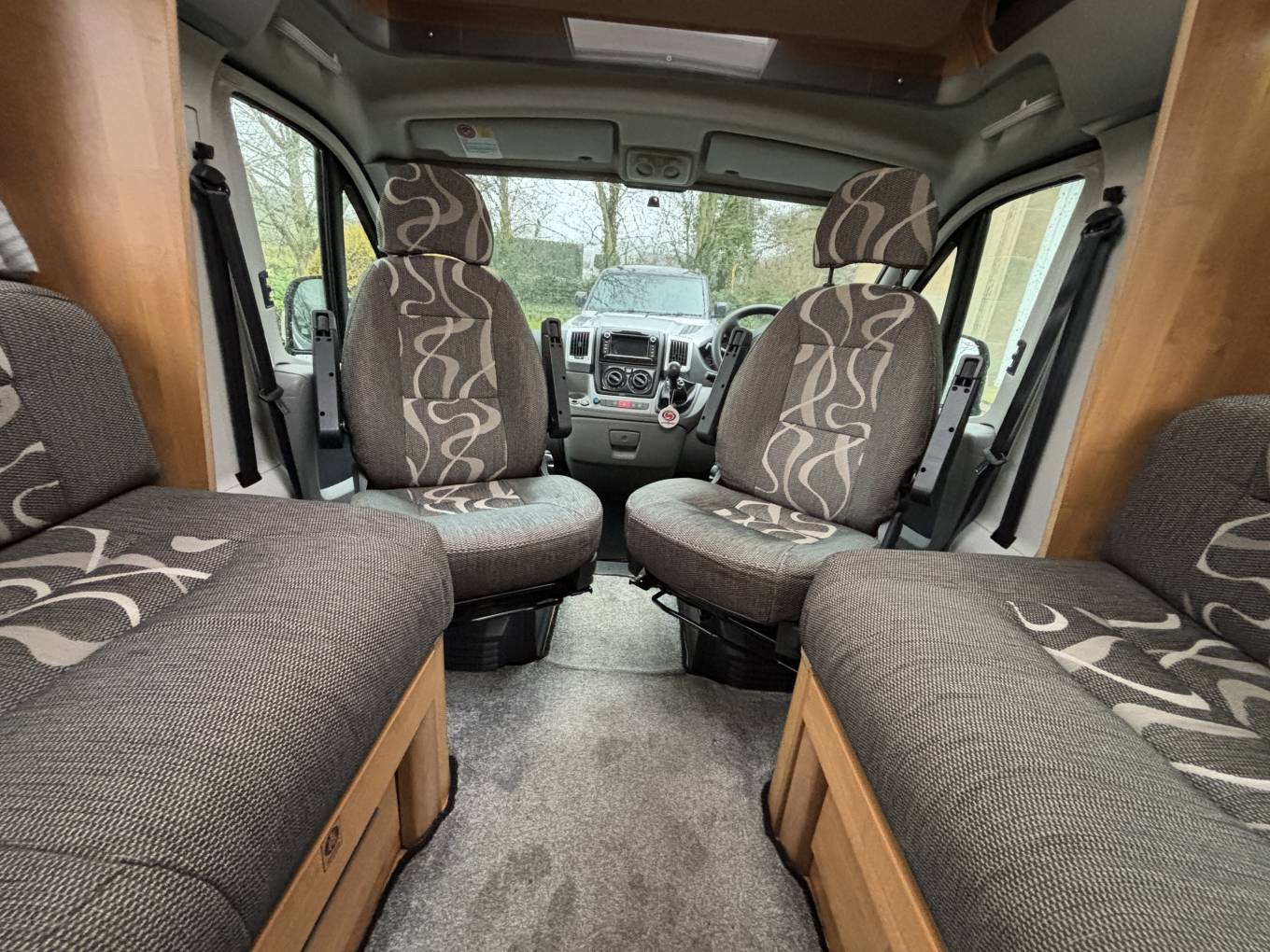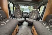 The interior layout offers a front lounge/dining area with twin bench seats, complemented by swivel cab seats, comfortably seating four. By night, the lounge converts into a small double bed. At the rear is a fixed French-style corner bed alongside a washroom with WC, sink and shower.