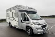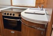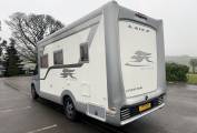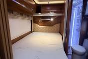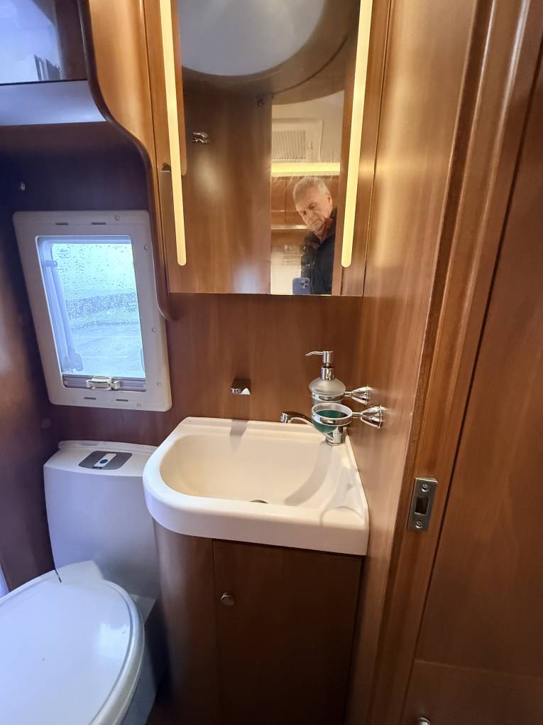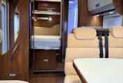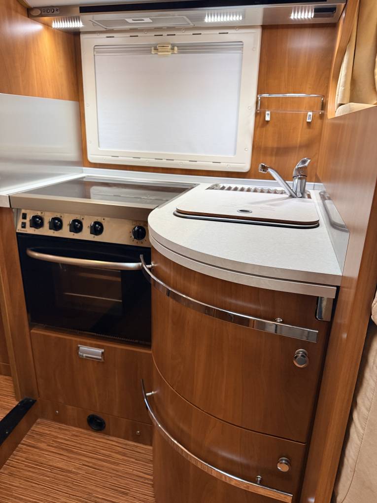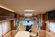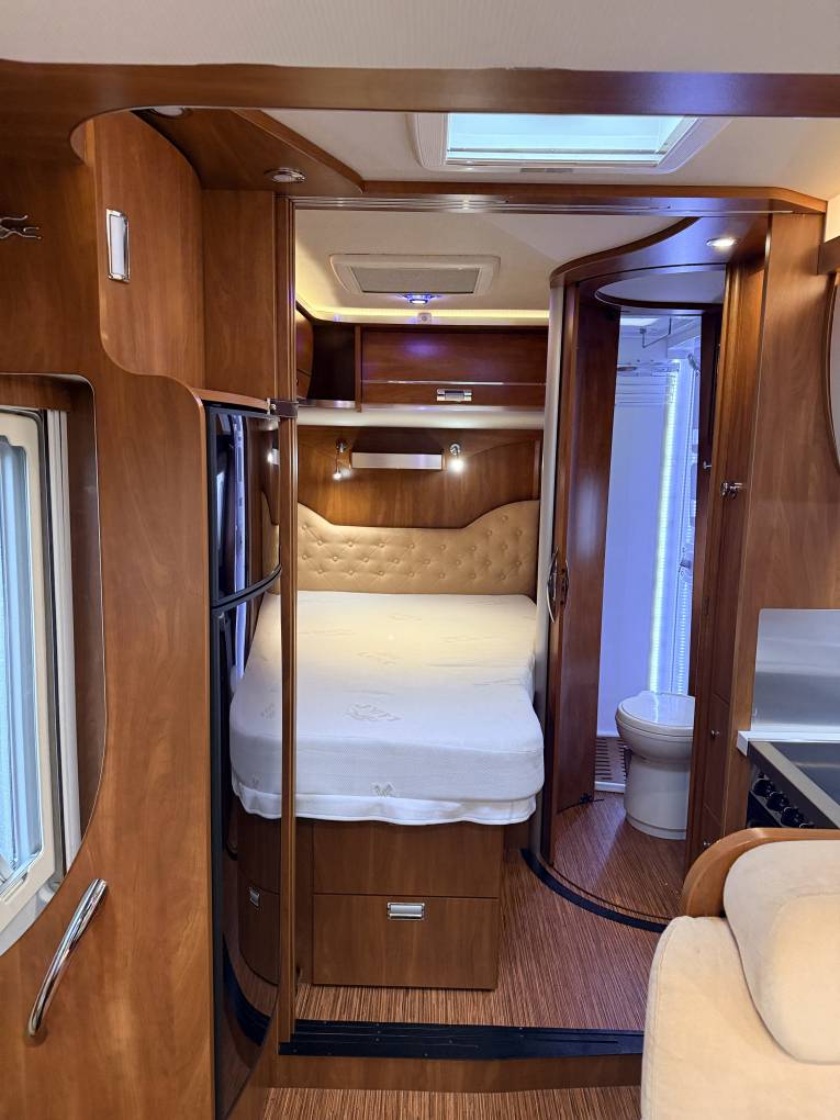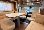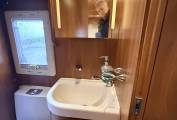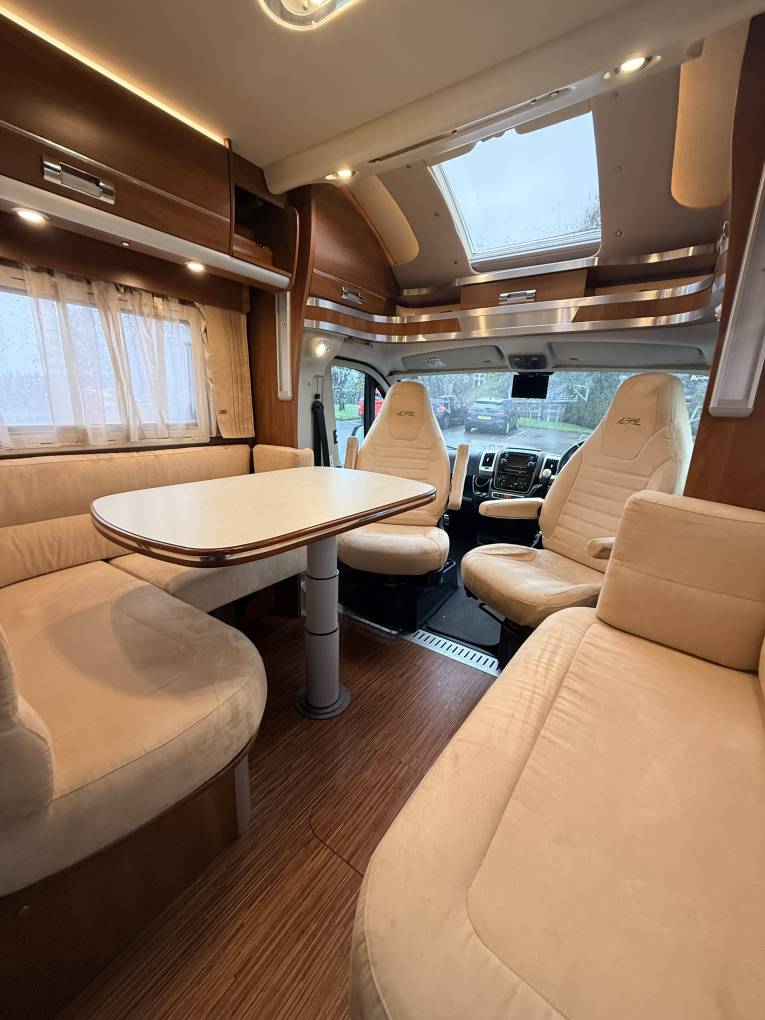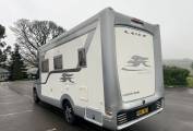 This is Laika’s flagship motorhome – the Kreos. This motorhome is designed for all year round use thanks to its double floor system. The 3008 model comes with a large French bed at the rear with ample locker storage above and drawers below. To the side of the bed is a washroom with sink, toilet, vanity cupboard and separate shower. In the kitchen we find three gas hobs with an extractor fan above, a fridge with separate freezer and an oven with grill function. This motorhome has had the optional electric drop-down bed over the front lounge added giving the extra 2 berths. The lounge has a multi directional table that drops to make the base for another double bed, all finished off in cream Swede upholstery. This model is based on a Fiat Ducato with 150BHP and automatic transmission. Additionally, there is a rear-view camera added as a reversing aid. On the roof we find a solar panel and TV aerial. Also fitted to this motorhome we have a wind out awning and external shower point. This example also has two re-fillable Gaslow bottles.