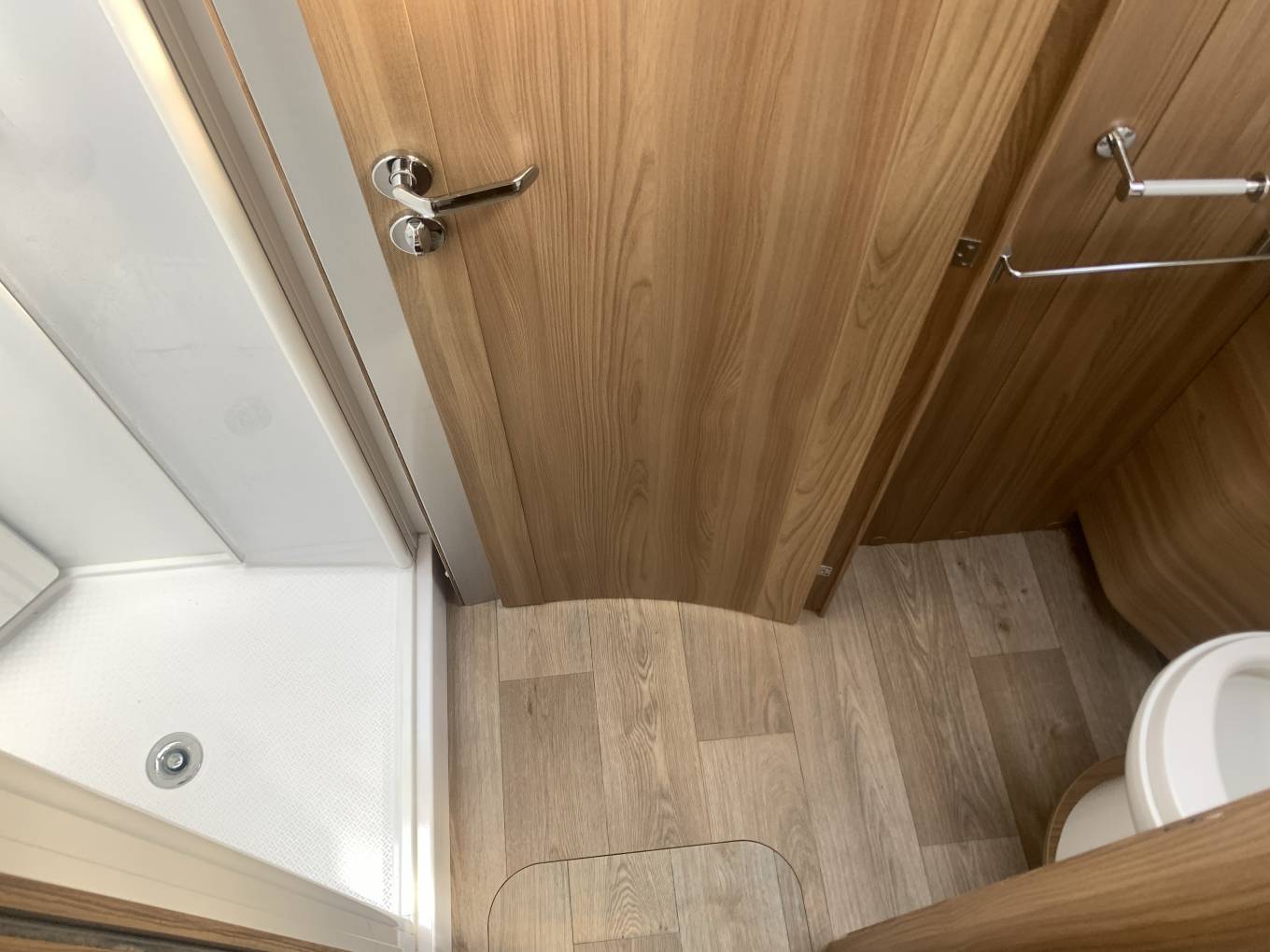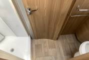 Layout features a rear island bed, a split washroom has the shower on one side with wash basin and toilet on the other.