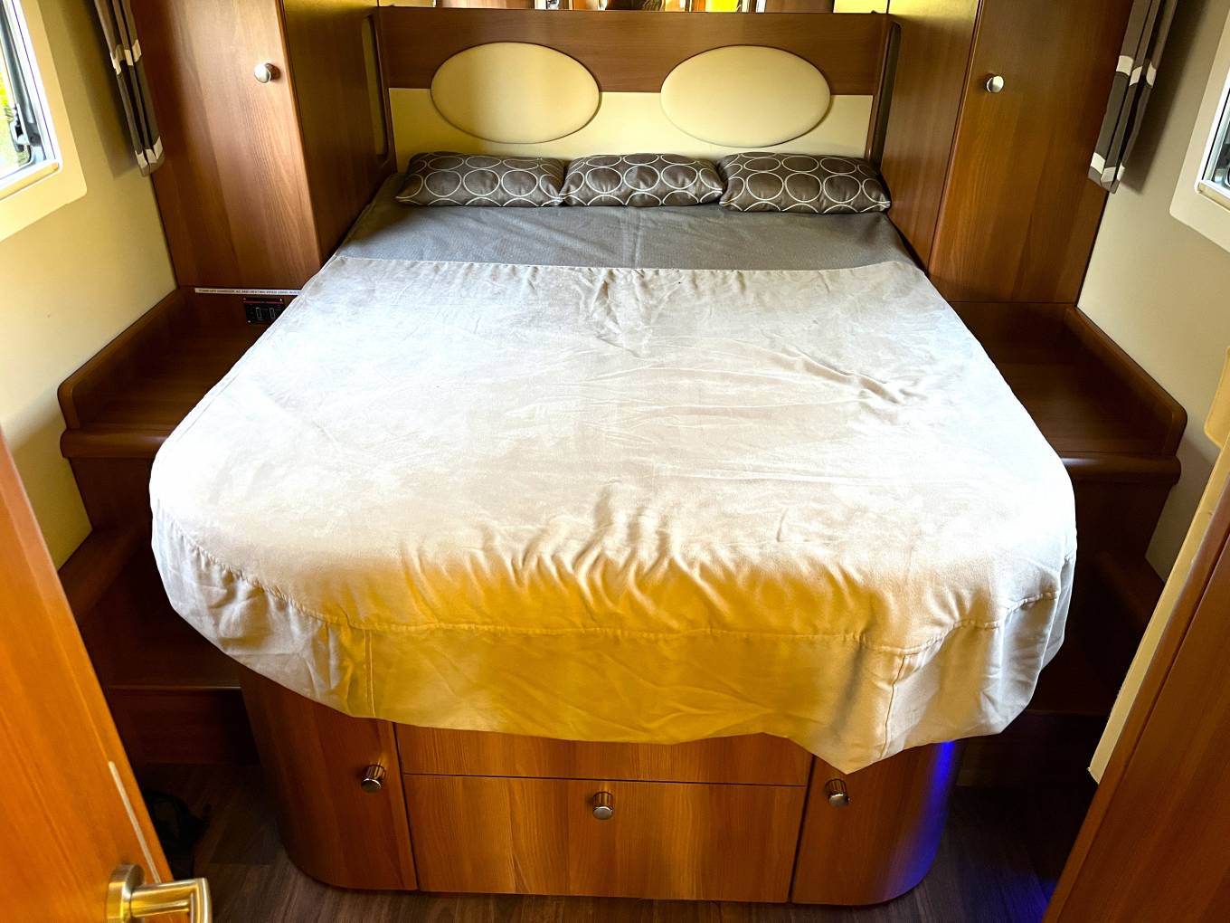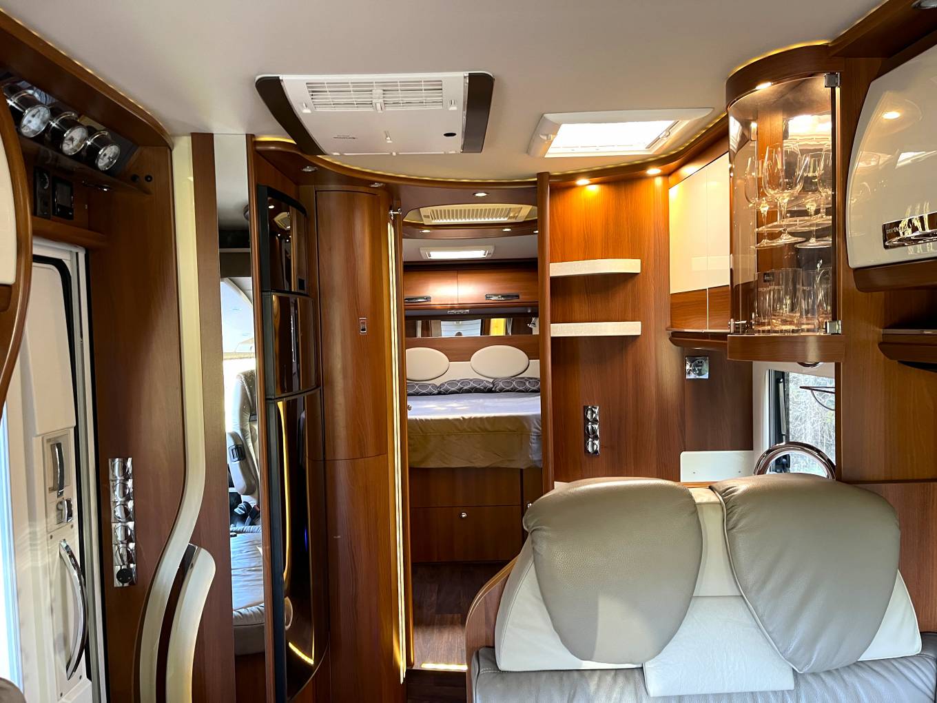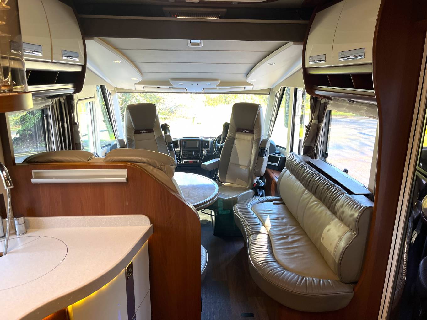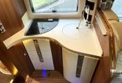This 4 berth, 4 travelling seat belts motorhome offers a good sized rear bedroom with a large fixed island bed complete with a separate en-suite shower and toilet/washroom, large double drop down over cab bed, versatile lounge/ socialising area and fully equipped kitchen. High end fittings, quality leather upholstery, excellent insulation and heating along with generous storage throughout this motorhome makes it perfect for touring in style and a pleasure to use for year round travel.