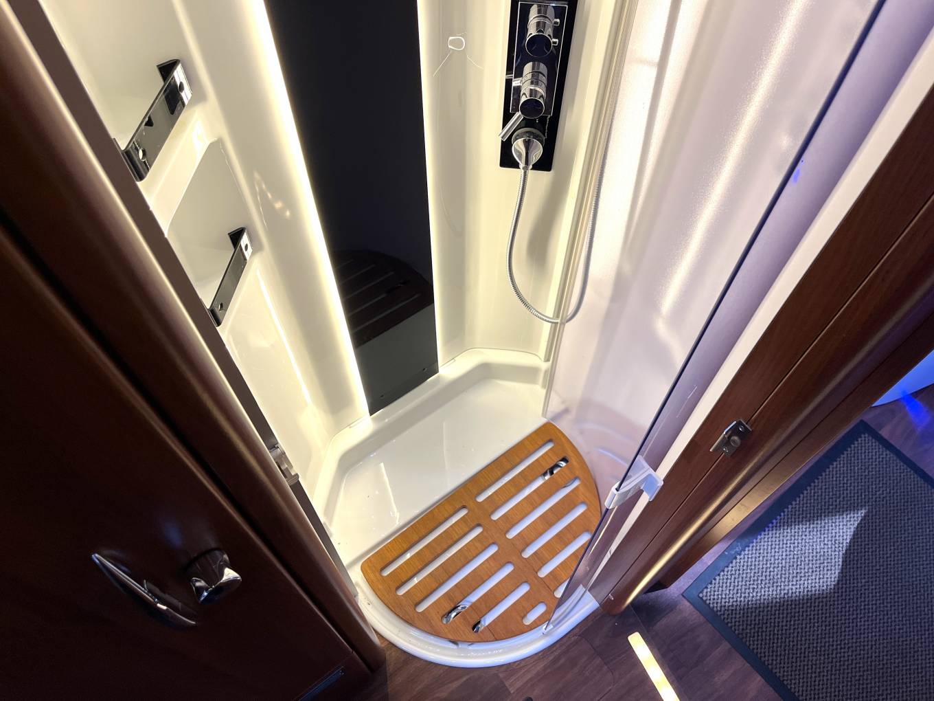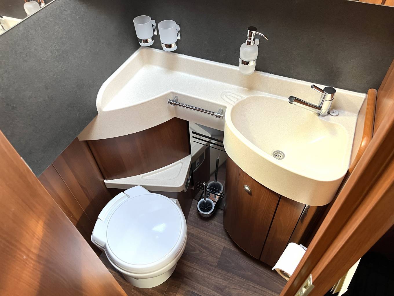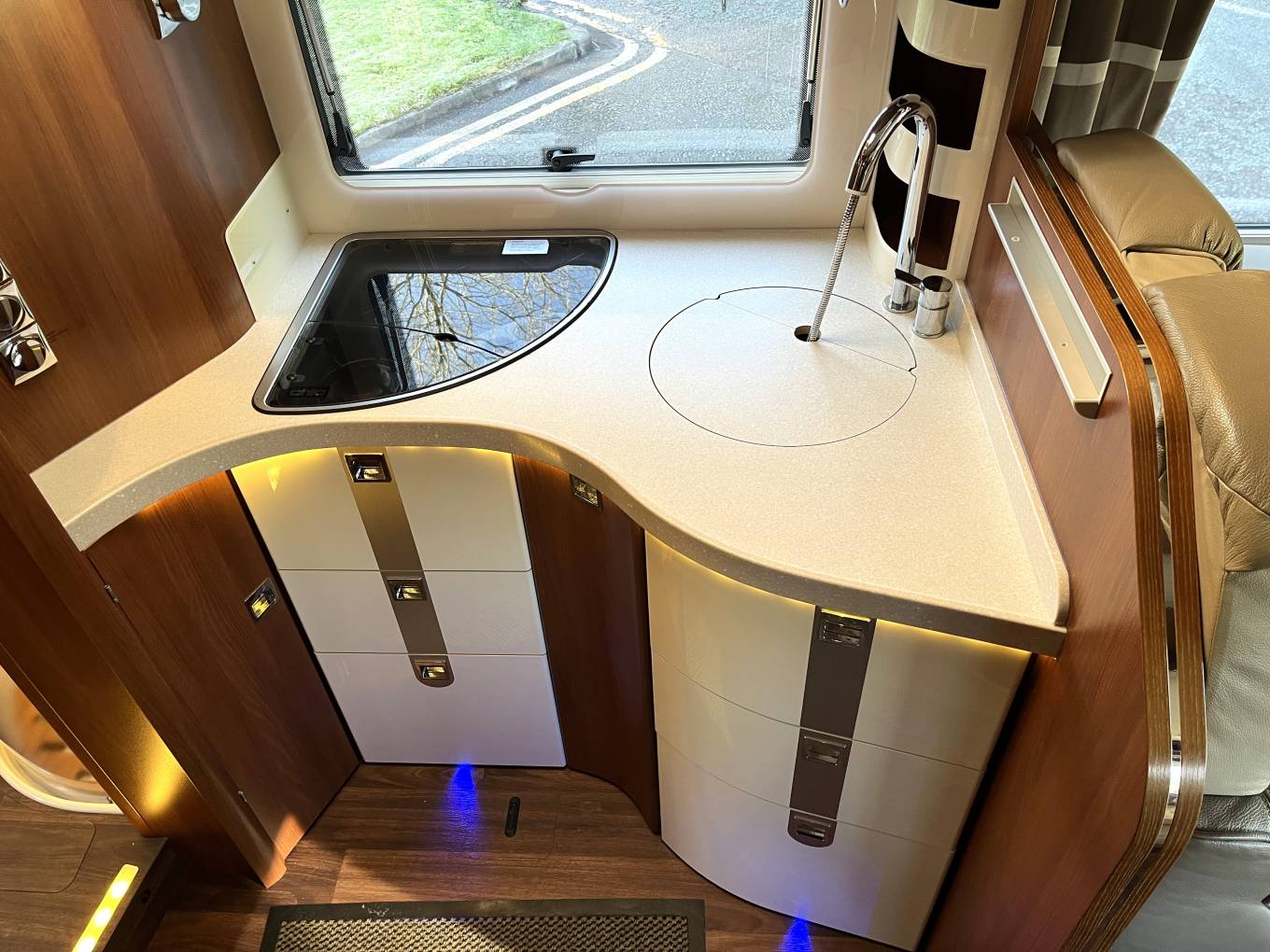 This 4 berth, 4 travelling seat belts motorhome offers a good sized rear bedroom with a large fixed island bed complete with a separate en-suite shower and toilet/washroom, large double drop down over cab bed, versatile lounge/ socialising area and fully equipped kitchen. High end fittings, quality leather upholstery, excellent insulation and heating along with generous storage throughout this motorhome makes it perfect for touring in style and a pleasure to use for year round travel.