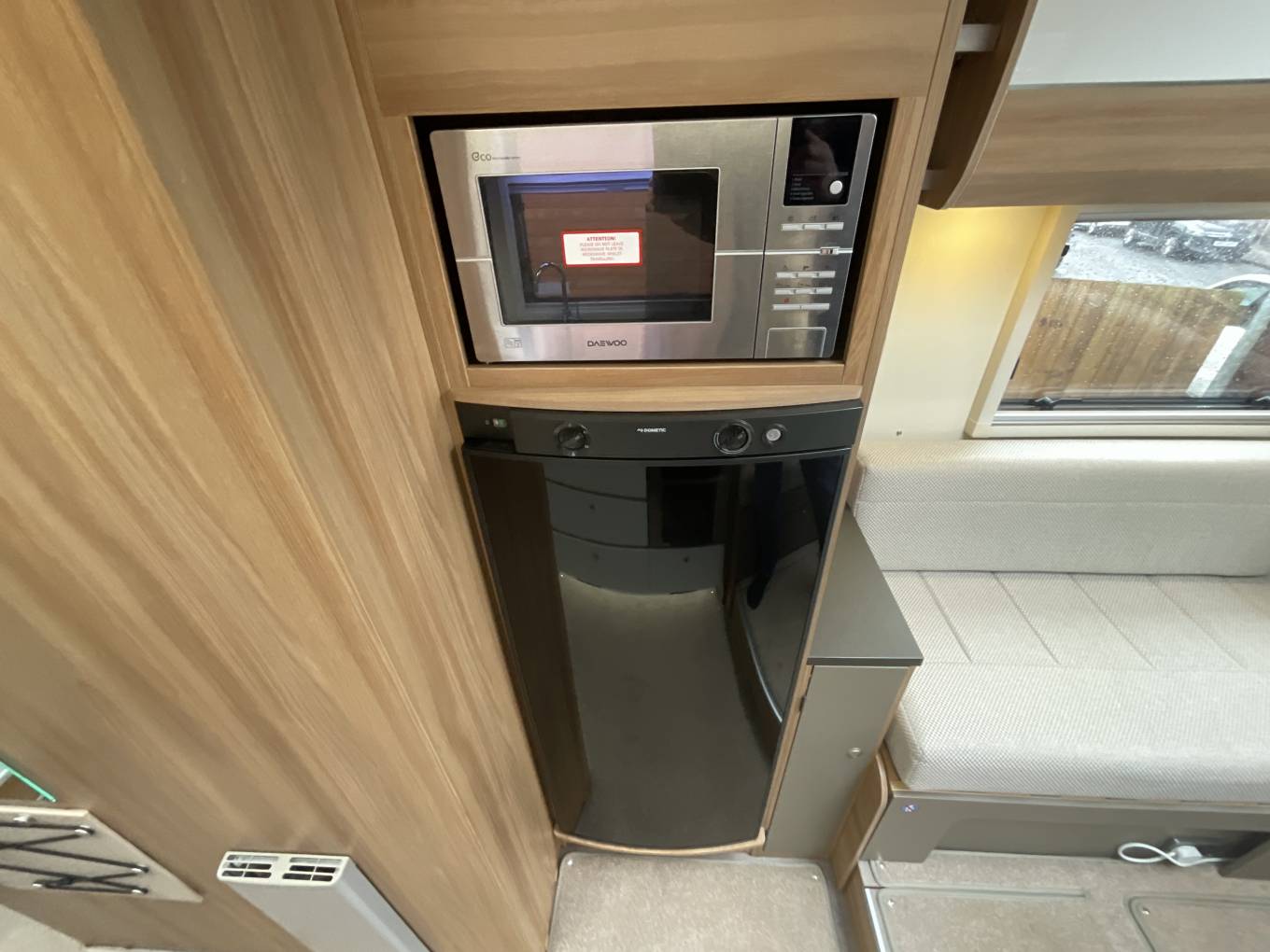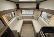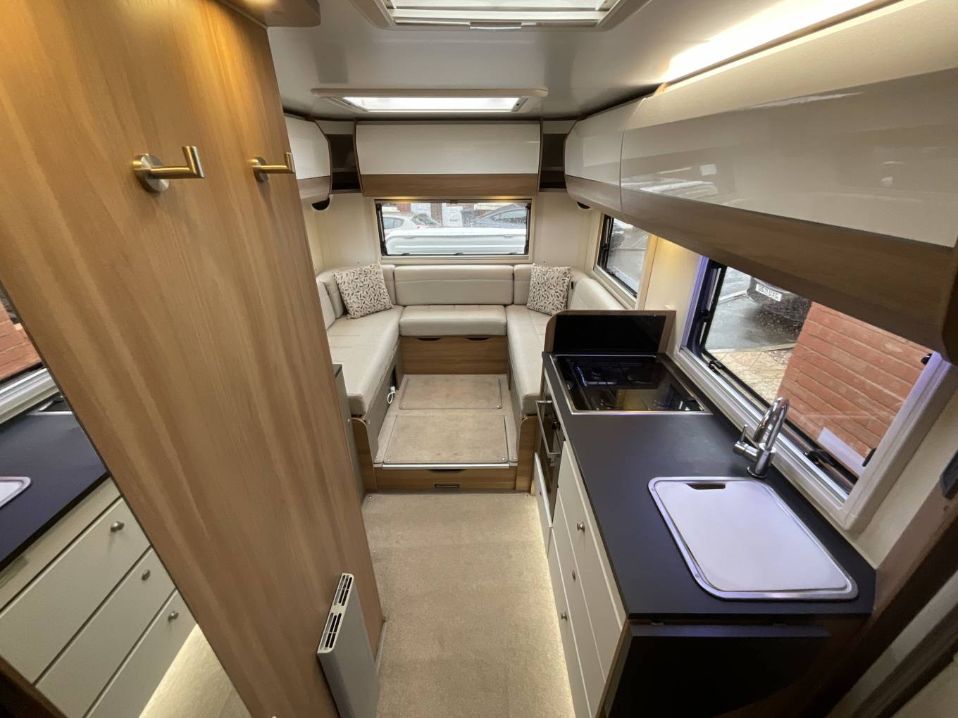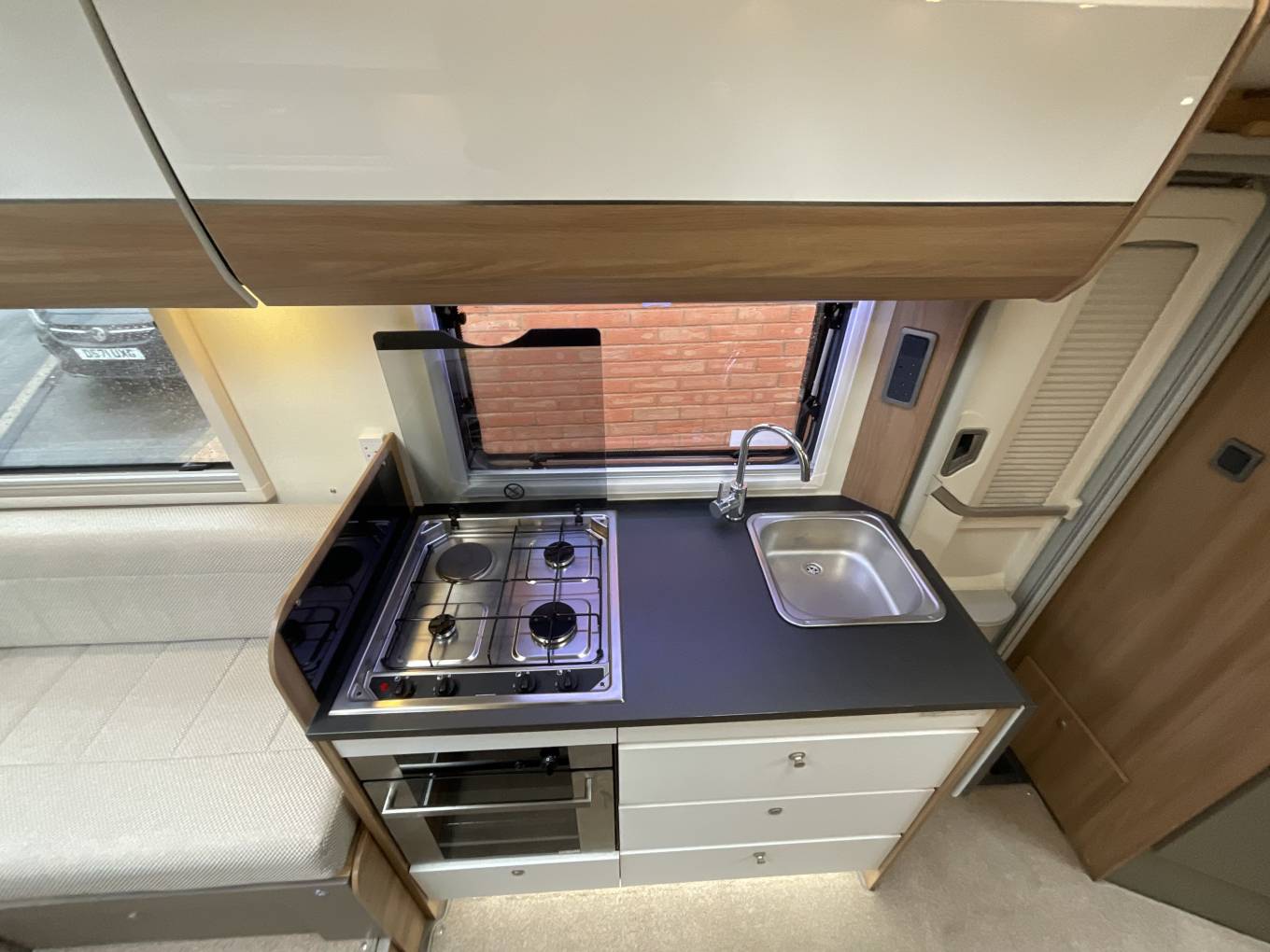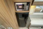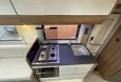 Inside you’ll find a spacious rear lounge with wrap-around seating that easily converts to a large comfortable double bed, creating a true home-from-home feel with triple-aspect windows and plenty of natural light. The contemporary kitchen is well equipped for holidays of any length, featuring a three-burner hob with an electric hotplate, combi oven and grill, tall fridge with freezer compartment and a microwave, set against durable countertops and stylish cabinetry.