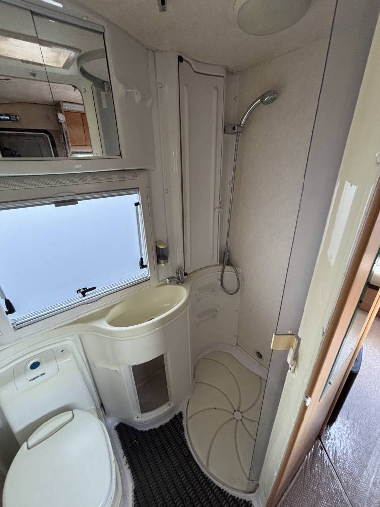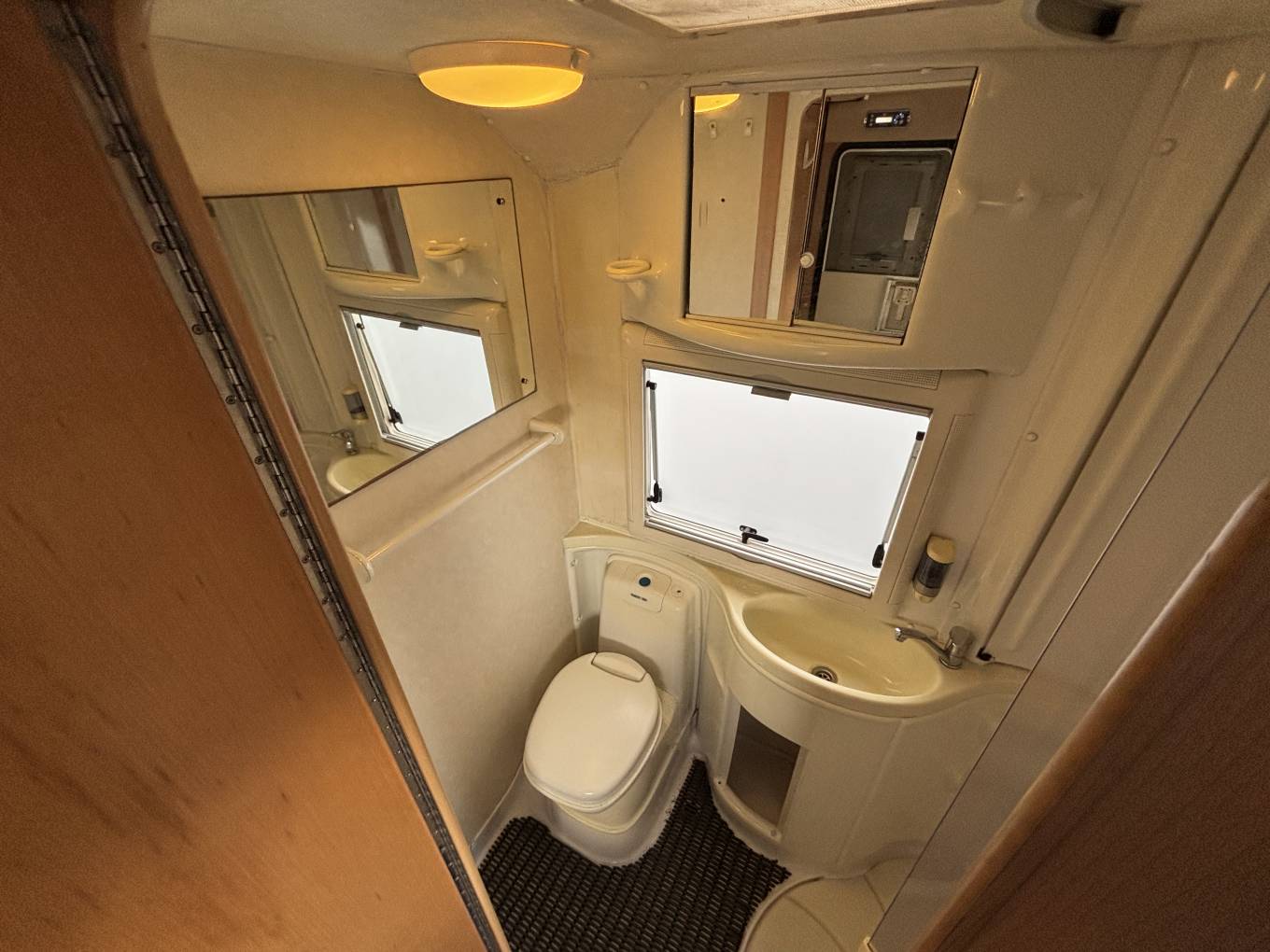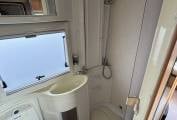 Moving forward, you have a large wardrobe space, and this is home to the fold away table that you can use inside or outside. Infront of the wardrobe and just behind the cab seats you will find the washroom that offers you everything you need, with a sperate shower, toilet, vanity mirror and sink.