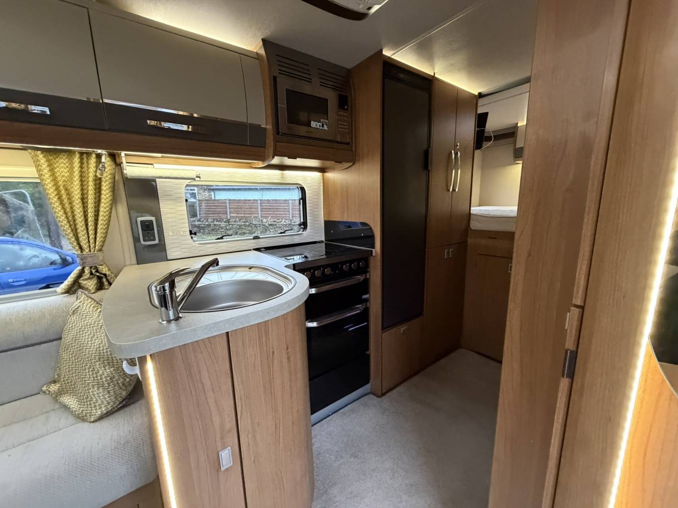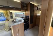The kitchen is fully equipped with a Daewoo microwave, Thetford 3-way fridge/freezer, and 3 gas + 1 electric hob, with ample storage for all your cooking essentials. The washroom includes a Thetford toilet with separate shower, providing a practical home-from-home setup. Entertainment is covered with 2 x Avtek Smart Pro TVs, Wi-Fi, and media connectivity throughout.