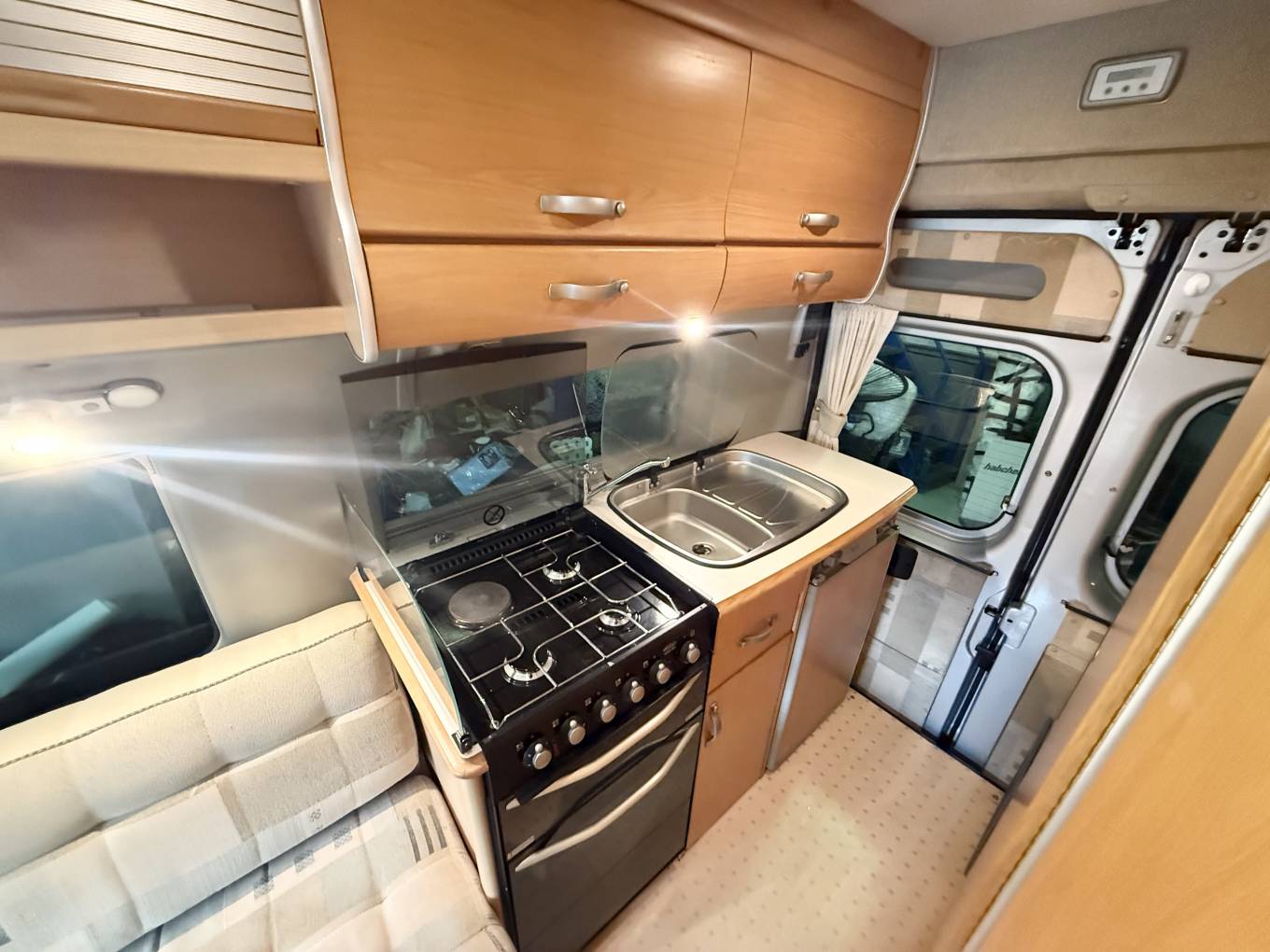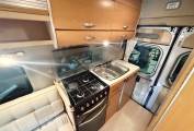 The kitchen has a stainless steel sink with draining board, chrome mixer tap and glass lid, hob with three gas burners and an electric hot plate, gas grill and oven beneath, a three-way fridge and plenty of cabinets and cupboards for storage.