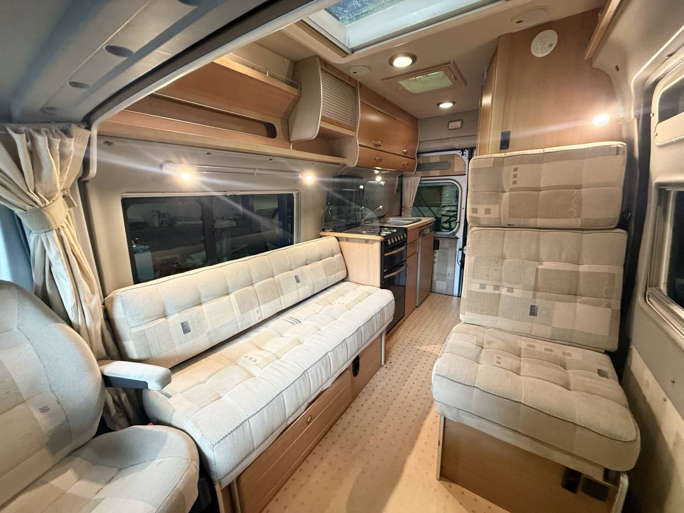 200Auto-Sleeper Symbol Motorhome Peugeot Boxer, 2.2 6-speed Manual – 2 berth, Absolutely lovely clean motorhome, perfect for couples looking to get away in their own isolation. Open the side sliding door and pop out the electric step to enter, where you find the lounge and dining area, you have a side sofa and a forward facing seat with three-point seatbelt, this area converts into either two single beds or can be made into a large double bed in the evening. Large windows and a sunroof flood the lounge with plenty of natural daylight making it light and airy, with upper storage lockers and under-seat storage.