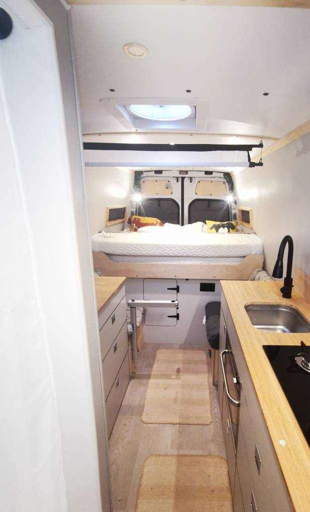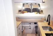 For storage we have a full set of drawers for two persons clothing, overhead cab storage, cupboards below & above the fridge, large galley kitchen cabinets and under seat. There is a sizeable garage under the bed providing ample storage for longer trips away. The van has also been fitted with upgraded Sumo Springs suspension, a product designed to enhance load carrying ability, stabilize sway and improve overall driver control and ride comfort.