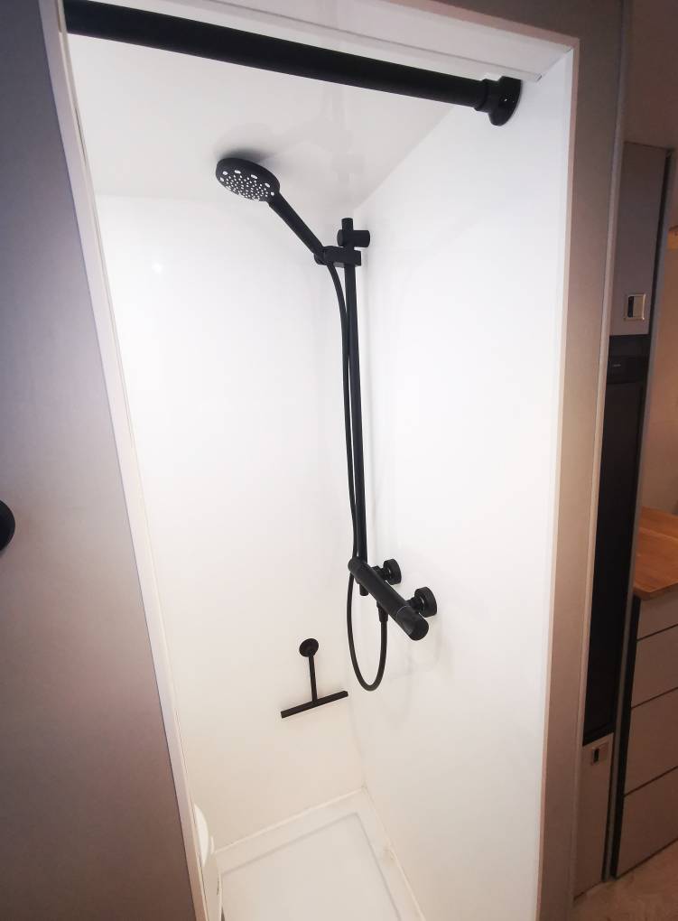 Internally there is a large Thetford T2090 fridge/freezer which has an outstanding 84 litre capacity including freezer space. The living space has a pull out bed which, when extended measures 2.2 metres in length and spans the whole width of the vehicle! The custom made memory foam mattress provides maximum comfort. Two fixed seats with removable Lagun table provides a comfortable area to dine. The shower is a FULL SIZE SHOWER you would find in any home measuring 100cm x 70cm allowing a comfortable shower & plenty space to use the Thetford Porta Potti 565E which features an electric flush function.