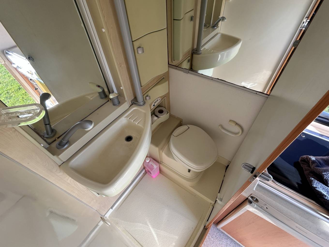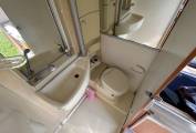 At the rear, the end kitchen is well equipped with an oven and grill, a three-burner gas hob, and a three-way fridge, while the adjacent rear washroom offers a showerhead built neatly into the tap, a Thetford cassette toilet, wash basin, twin mirrors and a bathroom cabinet for storage.
