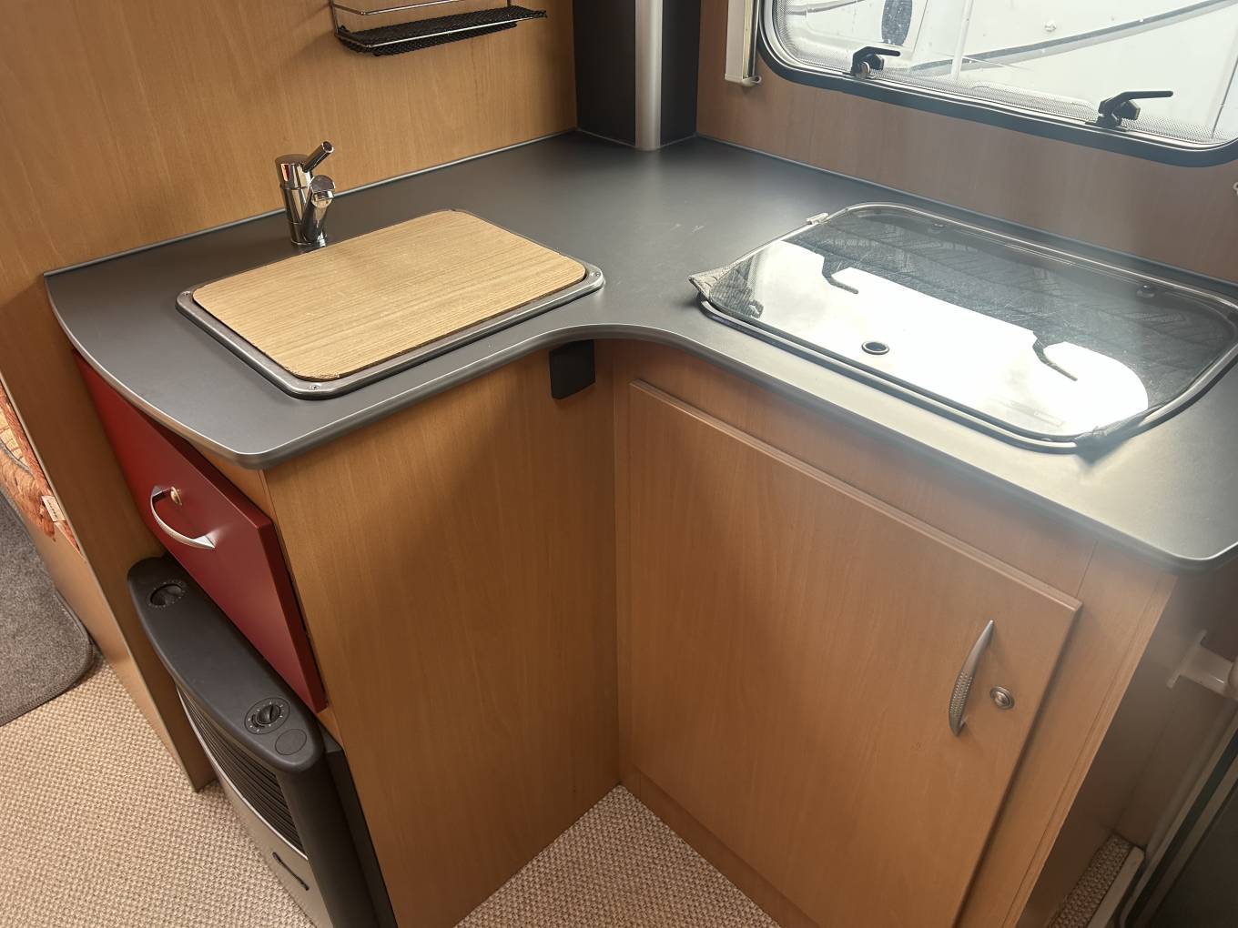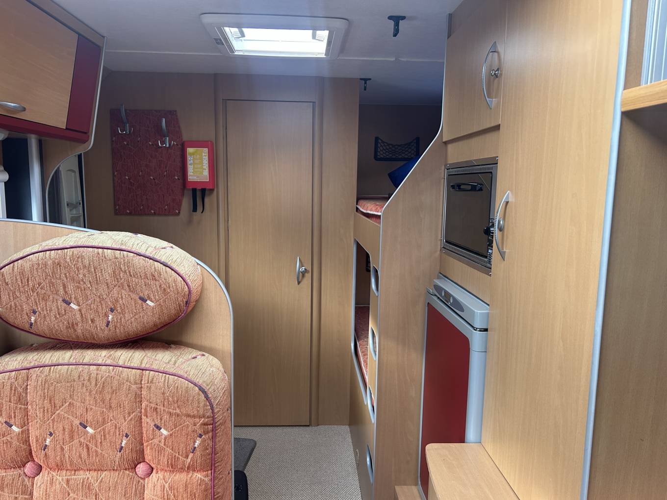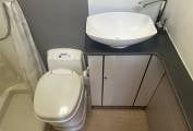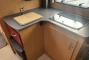 The kitchen is well appointed with a Smex oven and grill, three-burner Dometic hob, and a Thetford mini fridge/freezer, making it easy to cater for the whole family. The washroom includes a Thetford toilet, wash basin, and shower facilities, while Truma heating and hot water ensure comfort in all seasons.