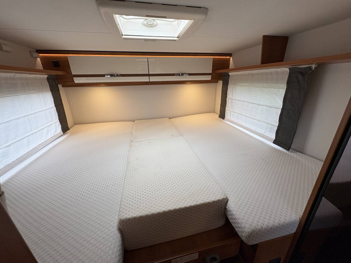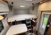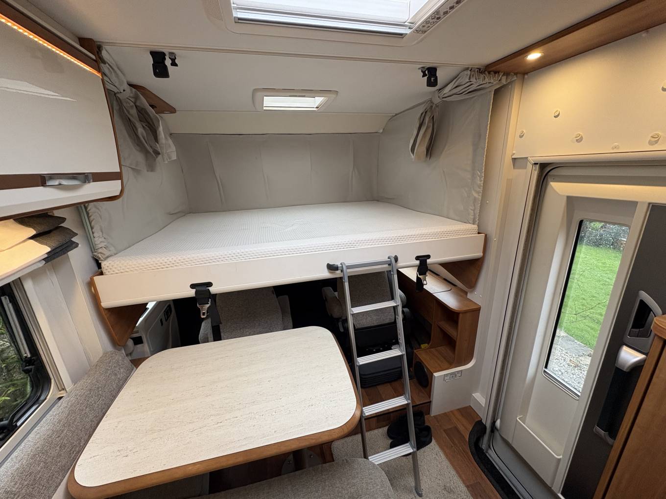 Layout - At the rear you have the large bedroom space that can be used as 2 single beds or one huge double bed depending on your preference. This is surrounded by beautiful lighting and storage lockers including 2 under the bed and the large garage space that is accessed from outside the camper and will ensure nothing is left behind for your next adventure. Moving forward you have the washroom which comes with a shower, hot and cold tap, toilet, mirrors and medicine cupboard. The kitchen area is next and has everything you need with 3 gas hobs, oven/grill combi, large fridge with freezer space and many storage options for all your pots and pans. The lounge area is home to a large table and the 2 extra travelling seat belts. This area actually sits 4 people when you take advantage of the front swivel seats. Above the cab area is home to another huge double bed! The garage space currently has a shelf in it as seen in the photos but this can be taken out to create one larger area.