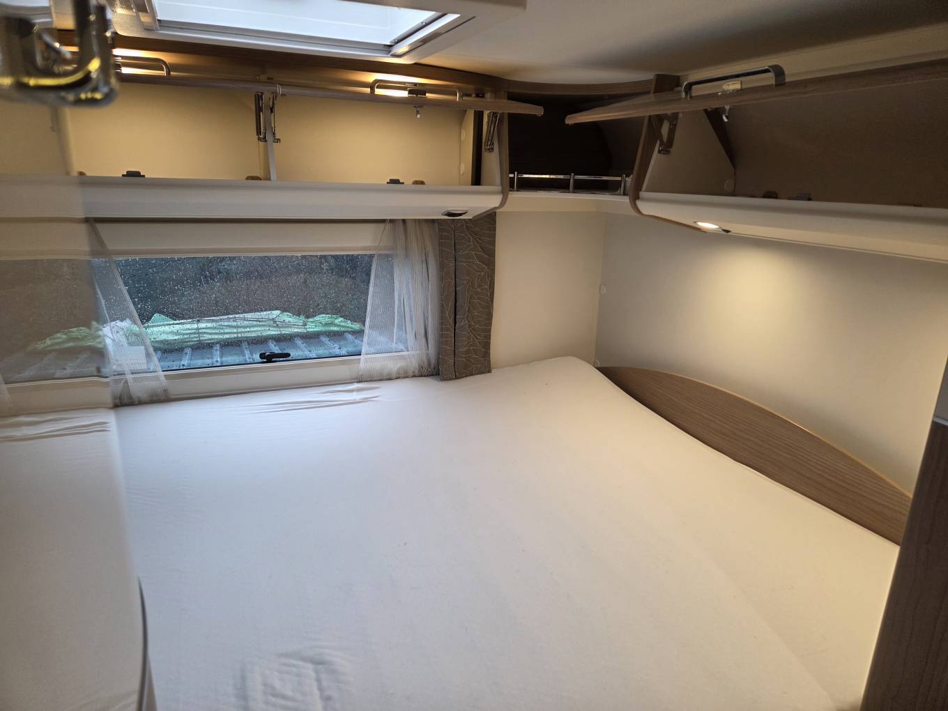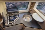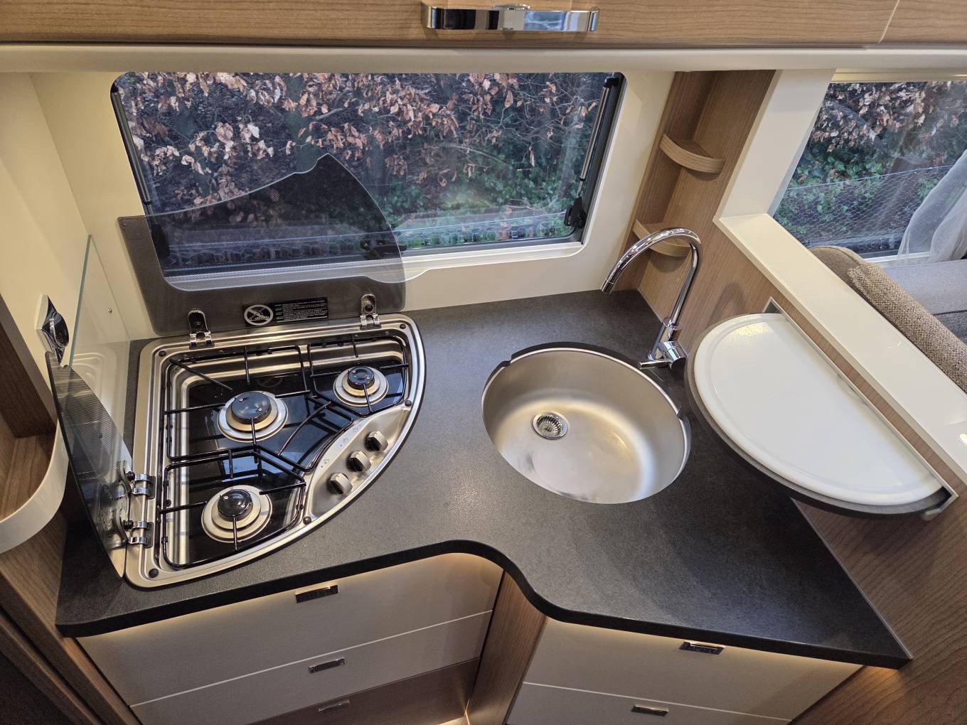 The kitchen includes a 3 burner gas hob, a 133l fridge and 12l freezer. You'll find ample countertop space, drawers and cupboards under and adjacent for dishes and utensils and an innovative chopping board solution for preparing meals. There is also a Electric extractor hood/window exhaust and air supply.