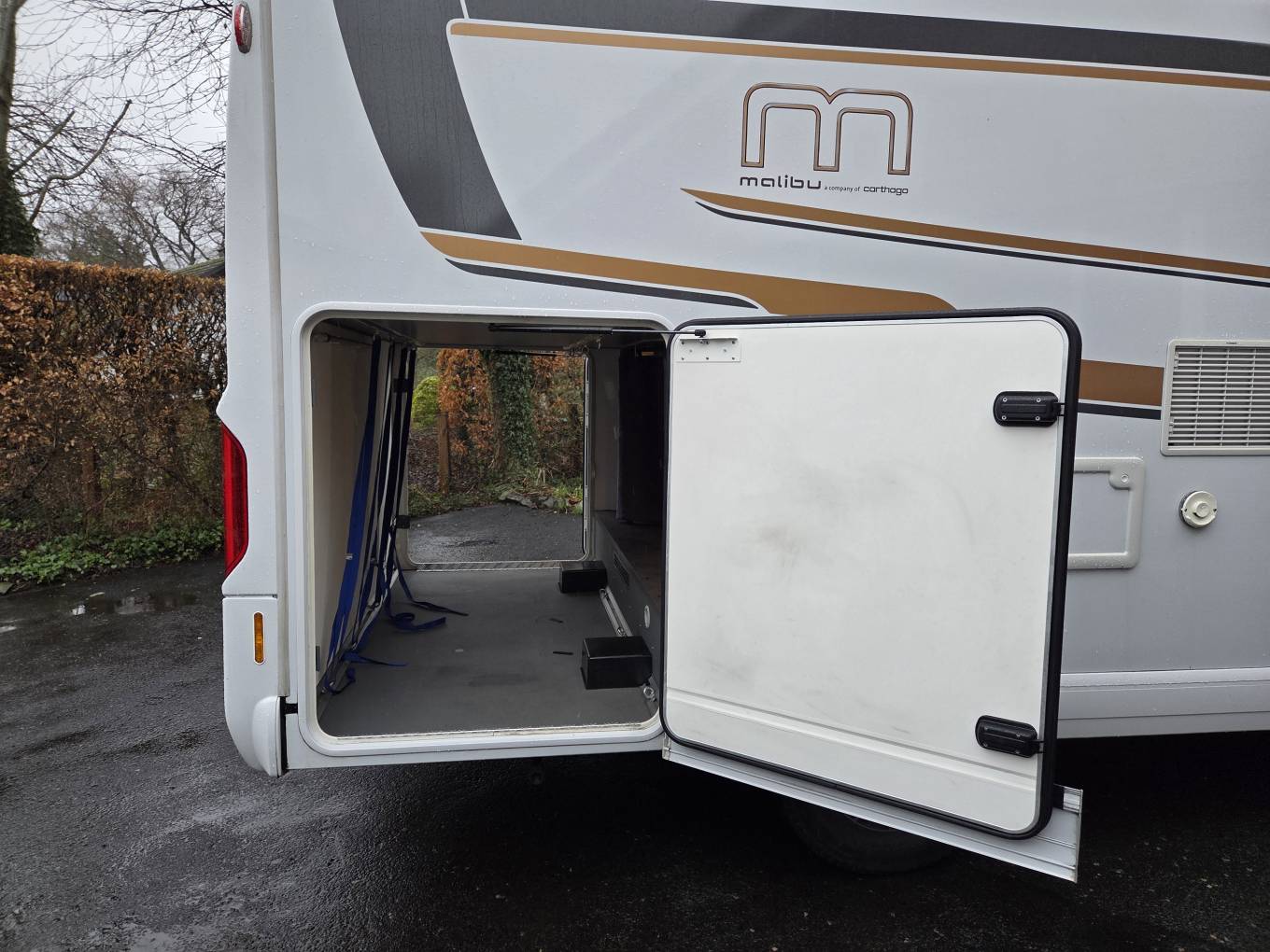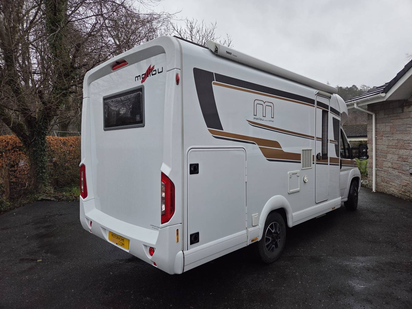 The Malibu’s semi-integrated, low profile roof, boasts an elegant and streamlined exterior design that reflects both sophistication and aerodynamic efficiency. The additional benefits of ‘double floor’ construction and impressive 'rear sports garage' add to the appeal of this motorhome.