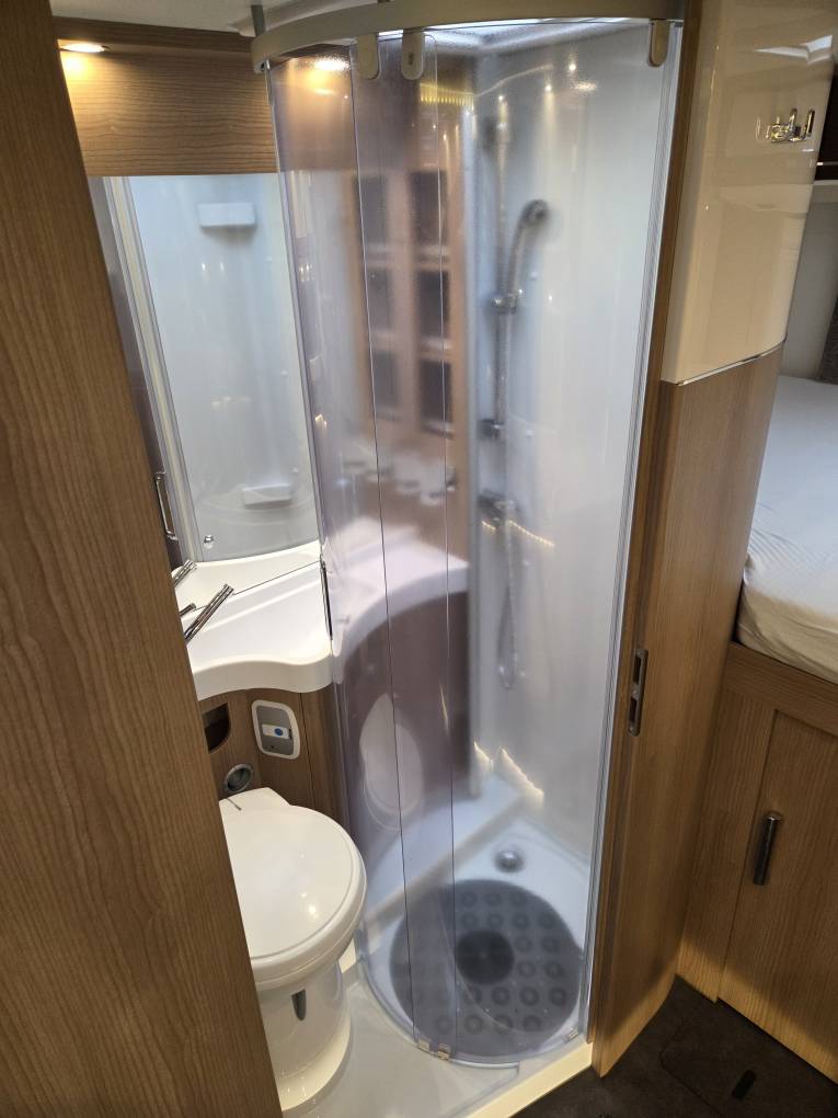 At the rear, we have a spacious and luxurious bedroom that includes a 2.15m x 1.47m double, fixed ‘transverse’ bed. There are large bedside units above as well as reading lights and a high level USB socket. Below the double bed we have a the very useful internal access to the large sports garage below.
