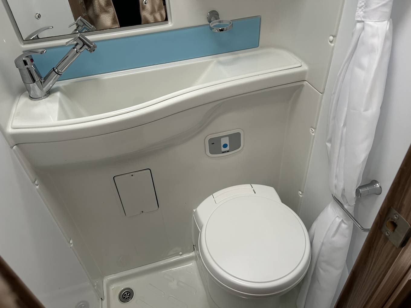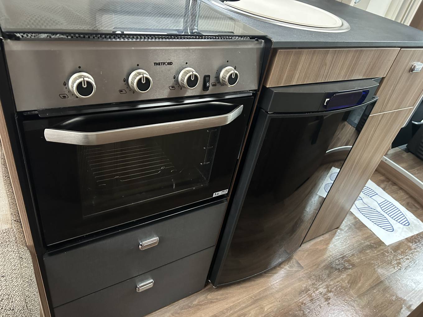 Inside, the bright interior is fitted with blinds and flyscreens throughout. The rear lounge provides a relaxing space and easily converts into a comfortable double bed, while the centre dinette converts into a single, offering flexible sleeping options. The kitchen is well equipped with a Thetford oven and grill and Dometic fridge/freezer, giving you everything you need for touring. The onboard washroom with Thetford toilet adds excellent self-contained convenience.