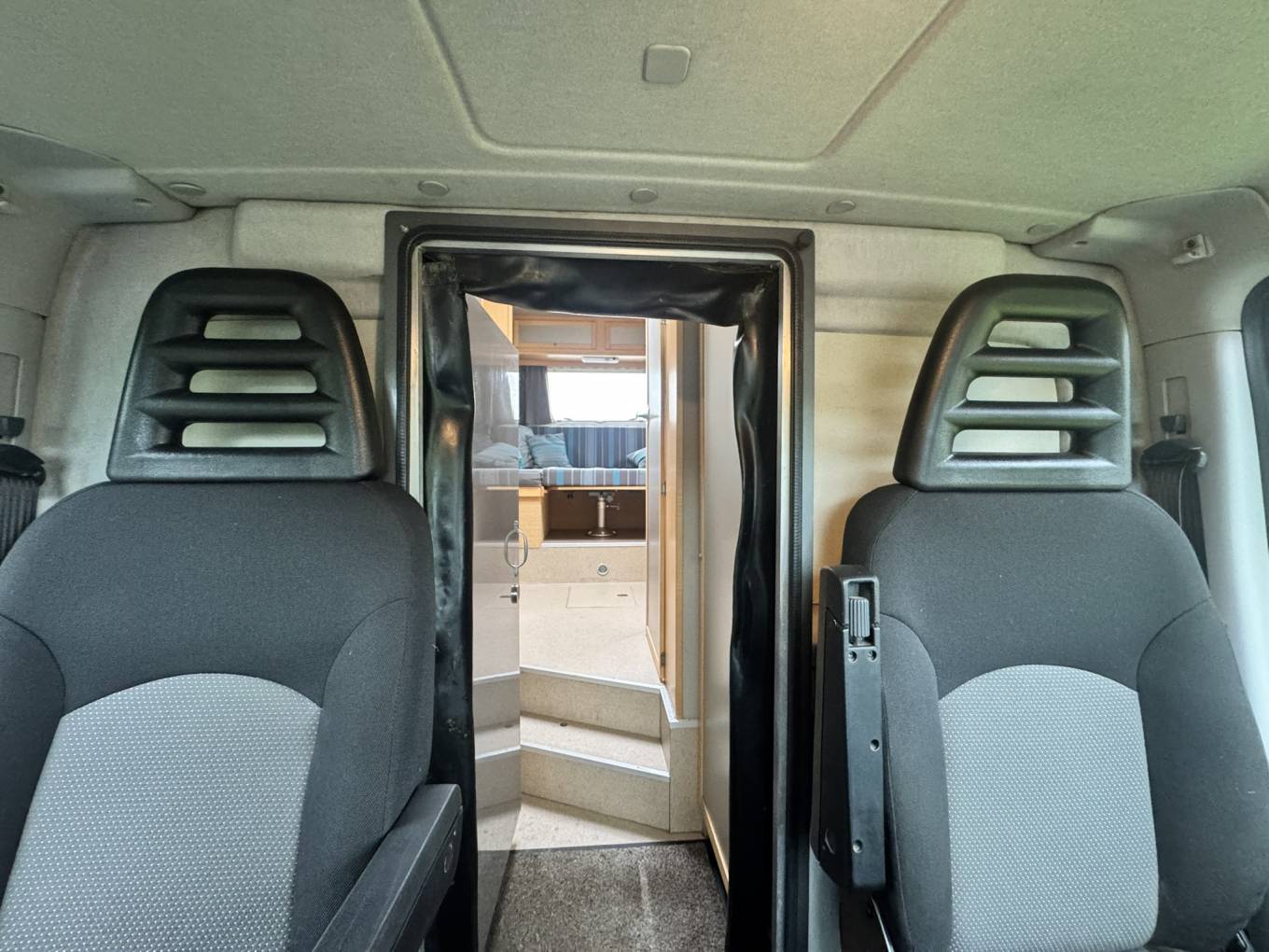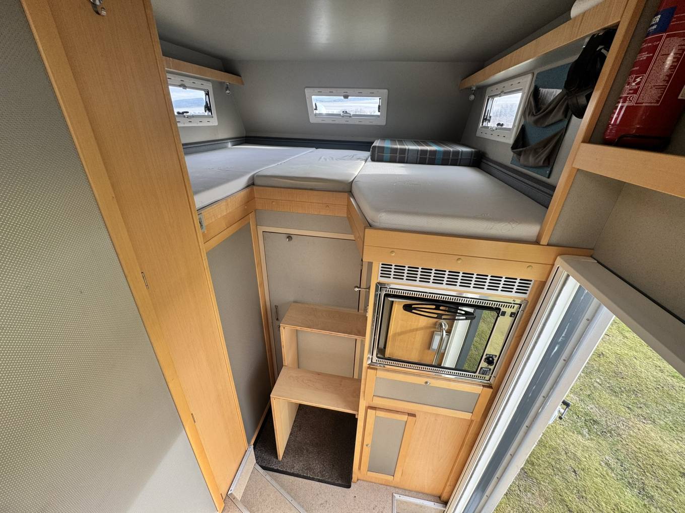 Twin beds configured longitudinally, so that each occupant can get in and out individually. Easy access steps are folded away when not in use.