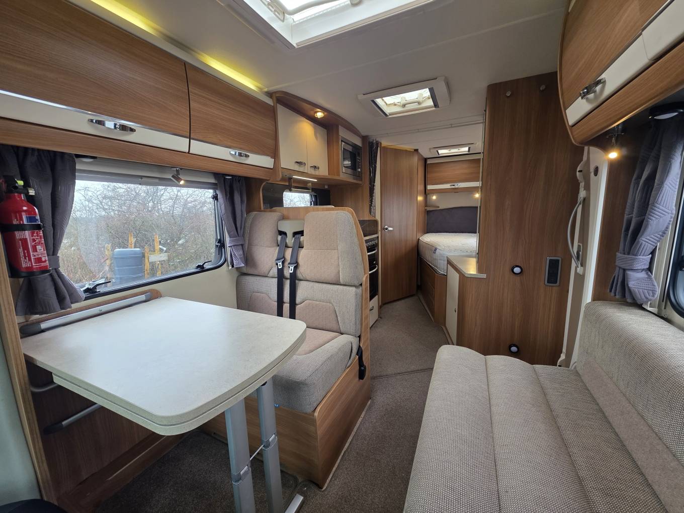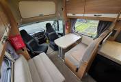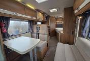 Sleeping and seating up to four, it includes two rear travel seats in the dinette and a fixed French double bed with ample storage. The washroom features a WC, washbasin, storage and the large shower that has 2 shower screens meaning that it can be made into a separate shower cubicle. The kitchen is equipped with a 3 burner hob + electric hot plate, 3-way fridge, separate oven and grill, microwave and sink, with a large wardrobe opposite. The front half dinette seats six using swivel cab seats, the table extends so that all seats can access the table and this converts into a second double bed.