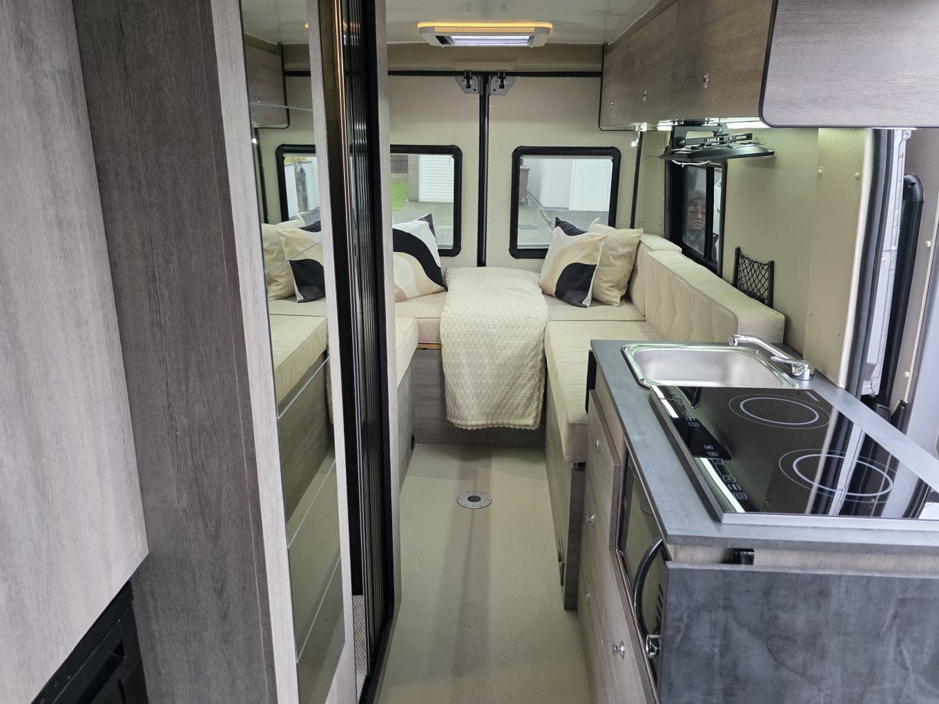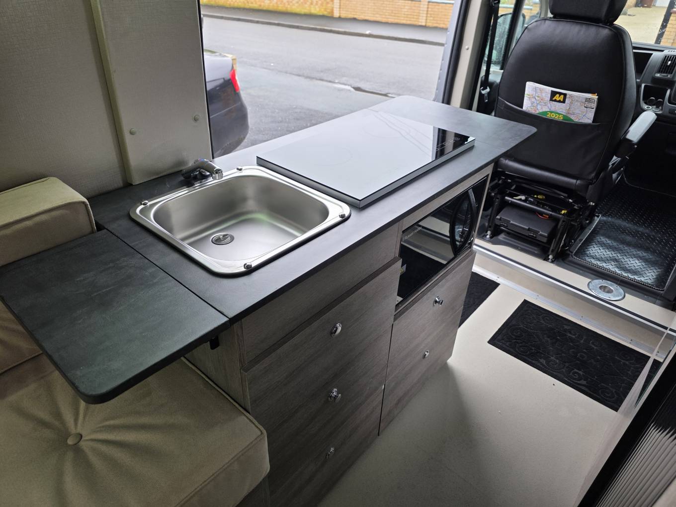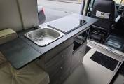 Mid van we have the kitchen area, which benefits from being fully electic, with a cookology double induction hob and sink with mixer tap. Below this is fitted a 4 in 1 Microwave Grill AirFryer Cooker and plenty of storage. Opposite is an 83ltr Fridge with freezer compartment.