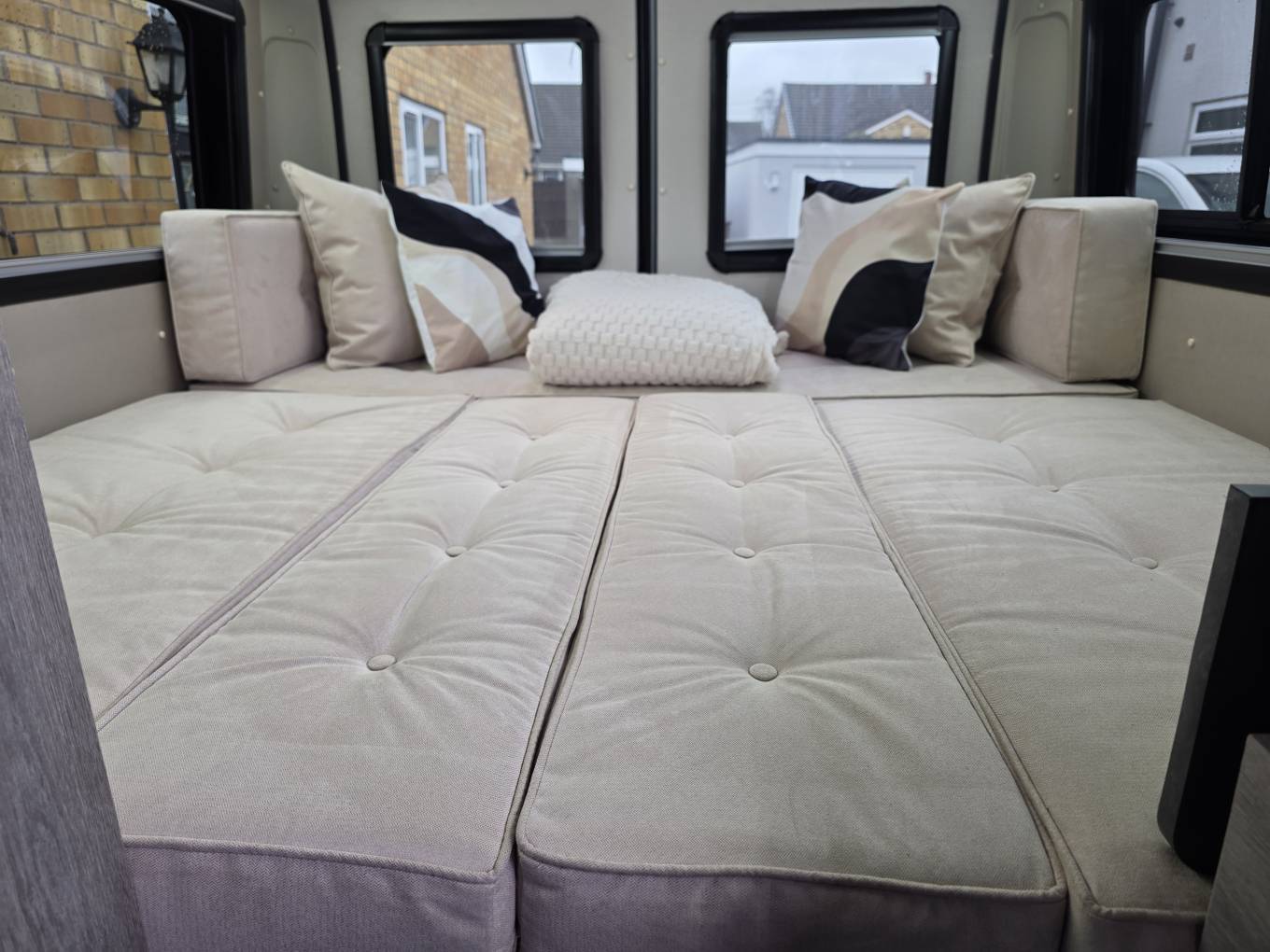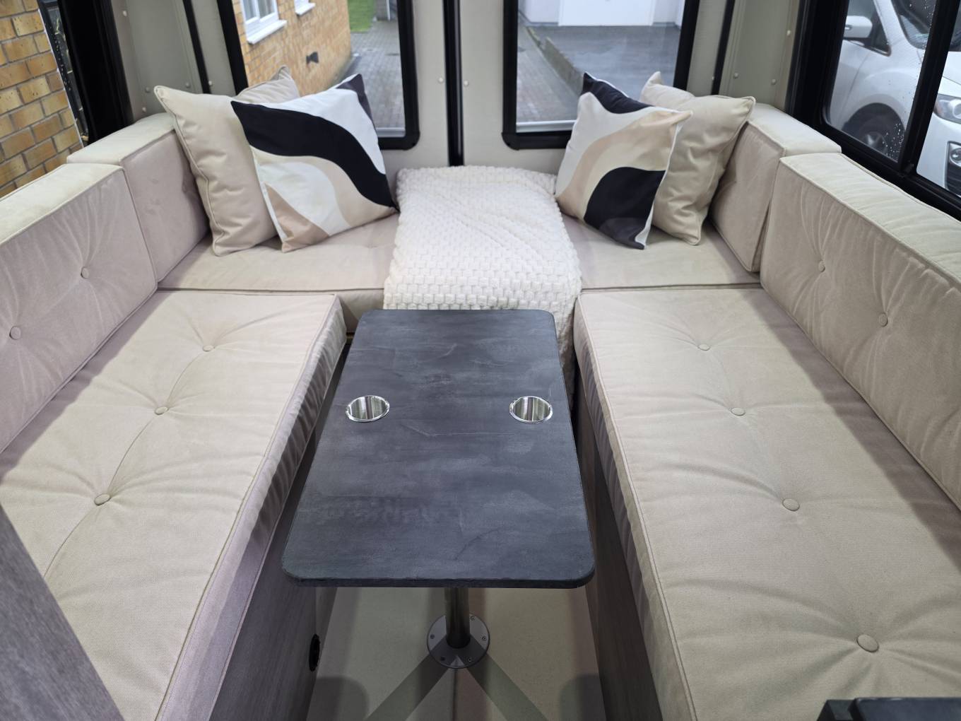 At the rear is the U shaped lounge area with table, providing another great area to dine/relax in and can also be quickly converted into a very large double bed to sleep. All of the seating is memory foam and washable.