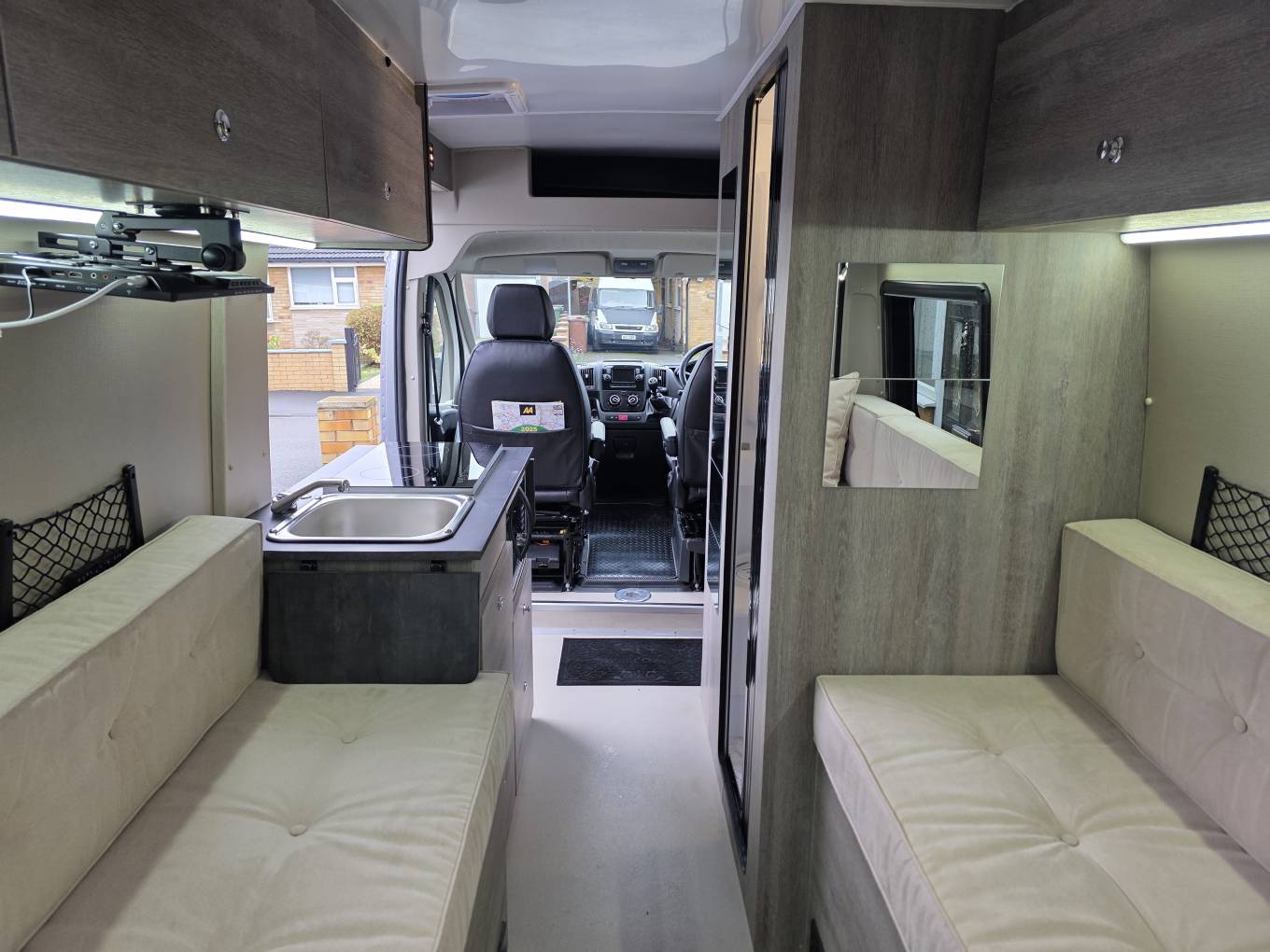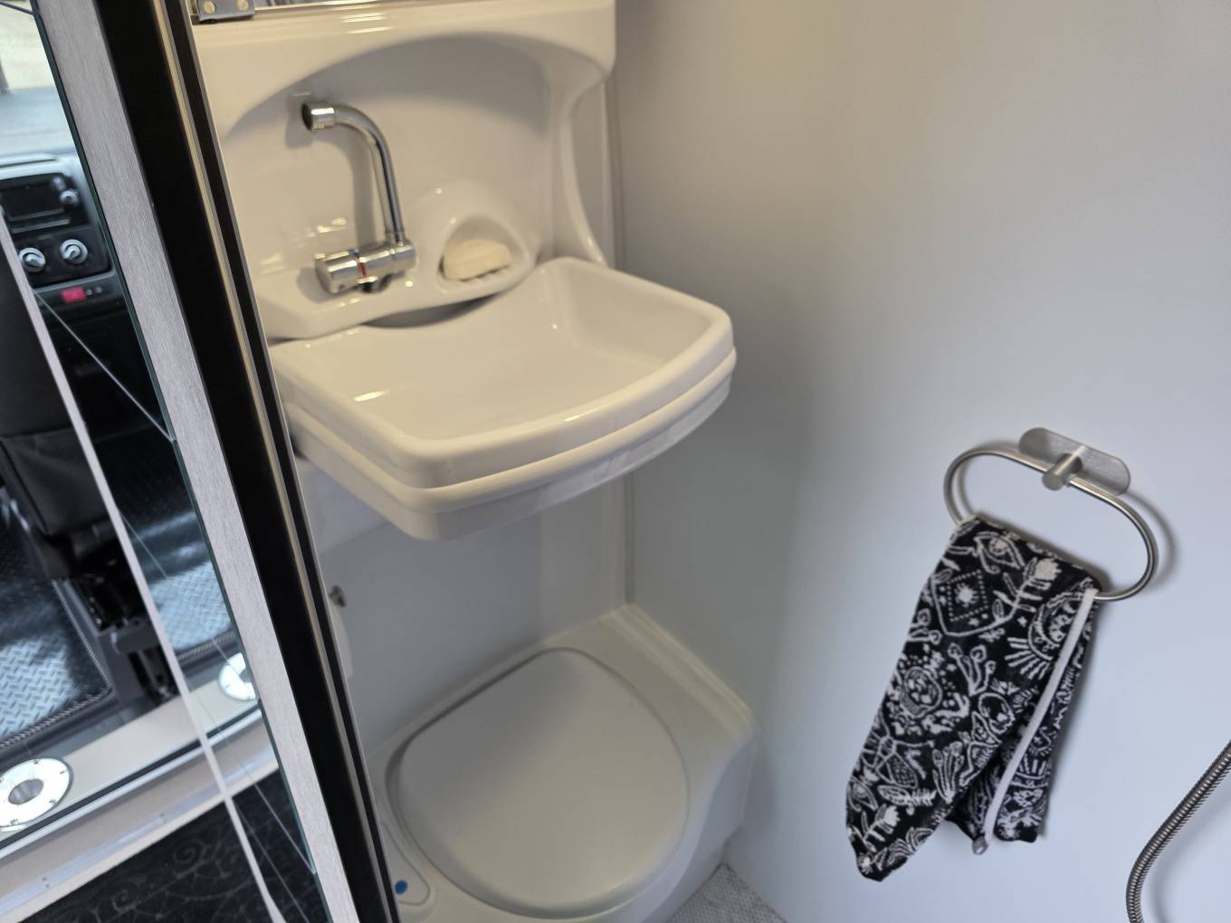 Also, mid van is a good size immaculate washroom with toilet, sink with mixer tap and shower above.