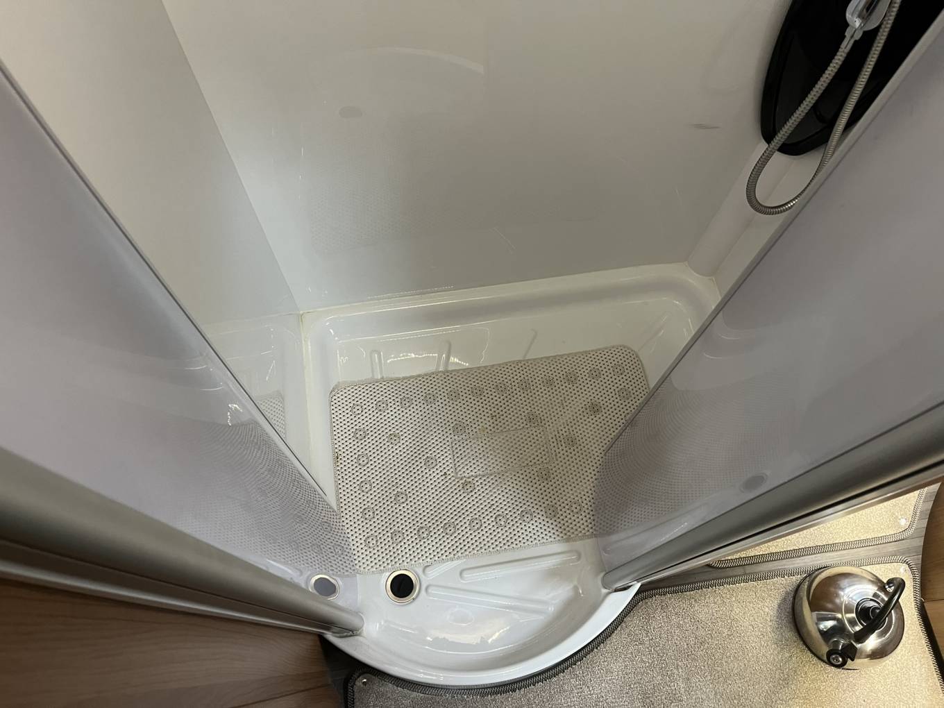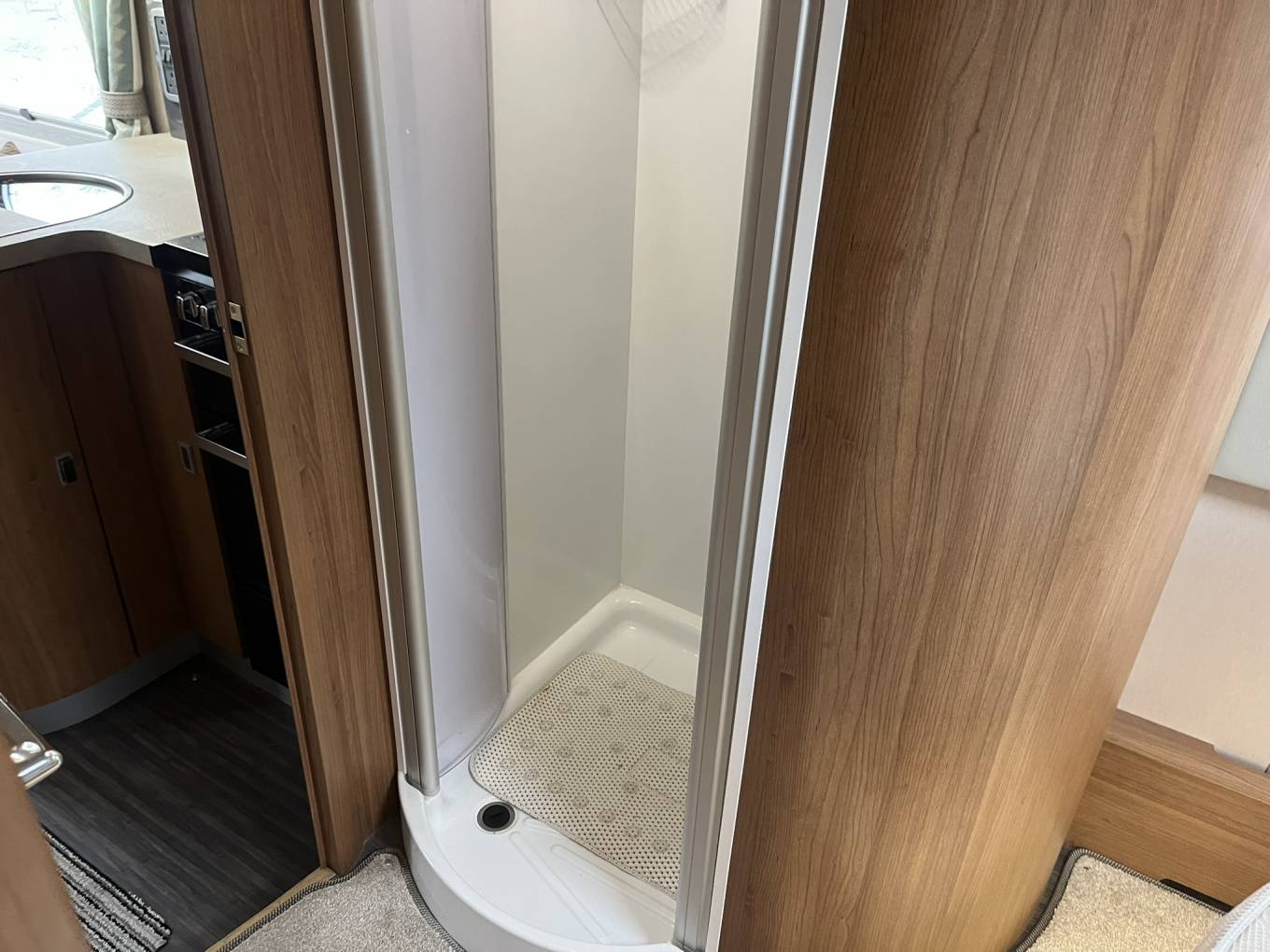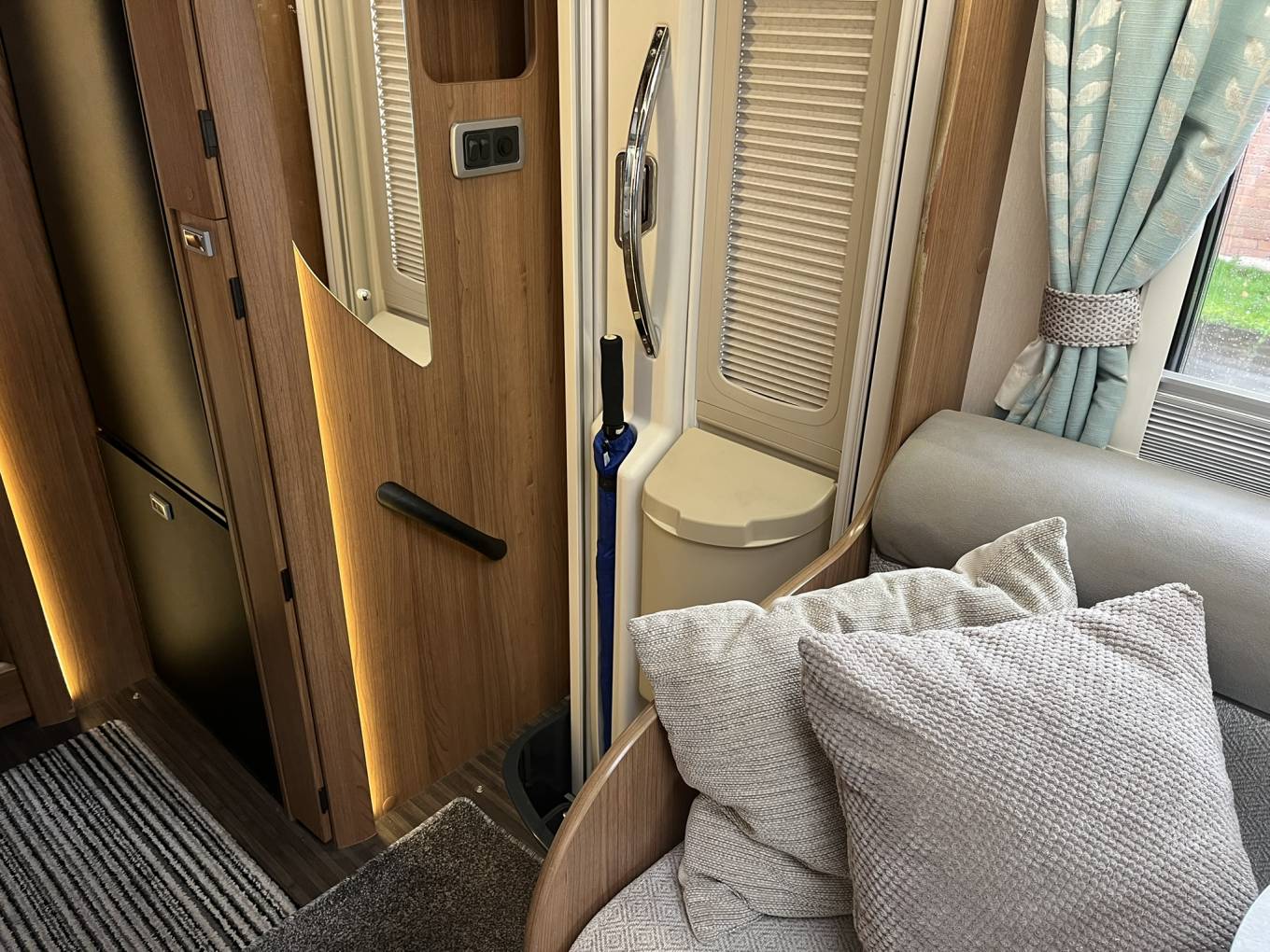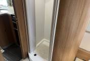 Washroom - Split across the motorhome Toilet, basin and separate Shower. The shower also has a hanging rail for extra storage while travelling or using site facilities.