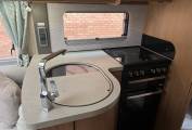 Kitchen - Large Dometic fridge and separate freezer, sink, microwave, oven, grill, 3 gas and 1 electric ring. Entry door with electric step and the Auto-Trail signature 'Brolly'